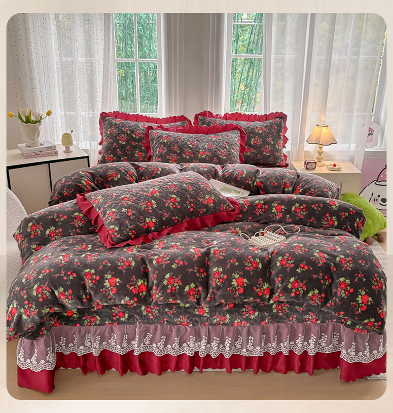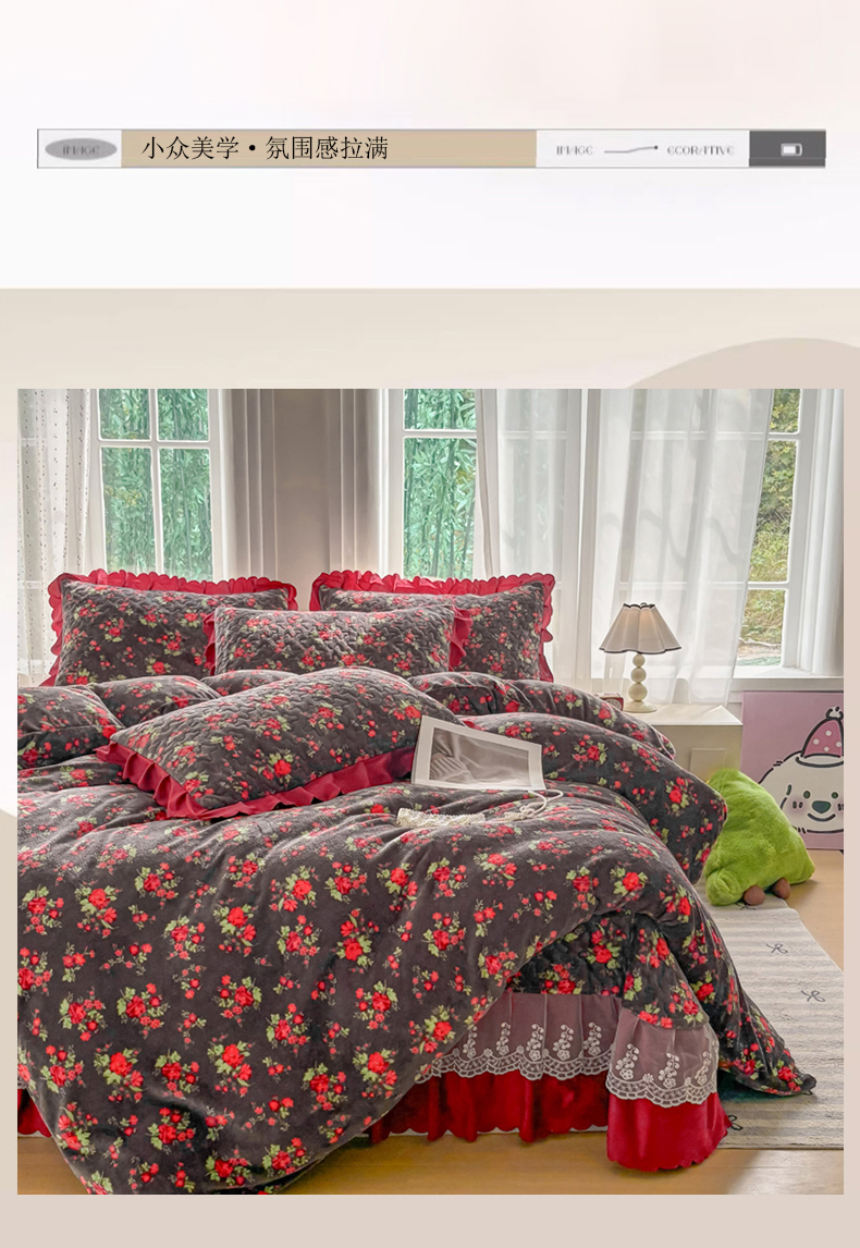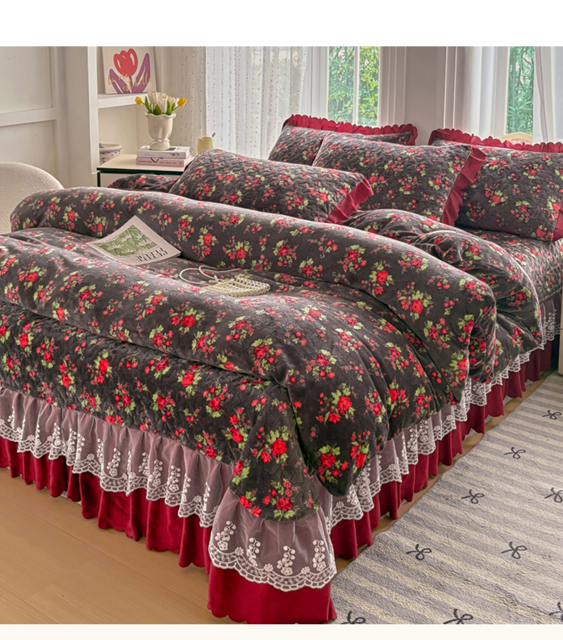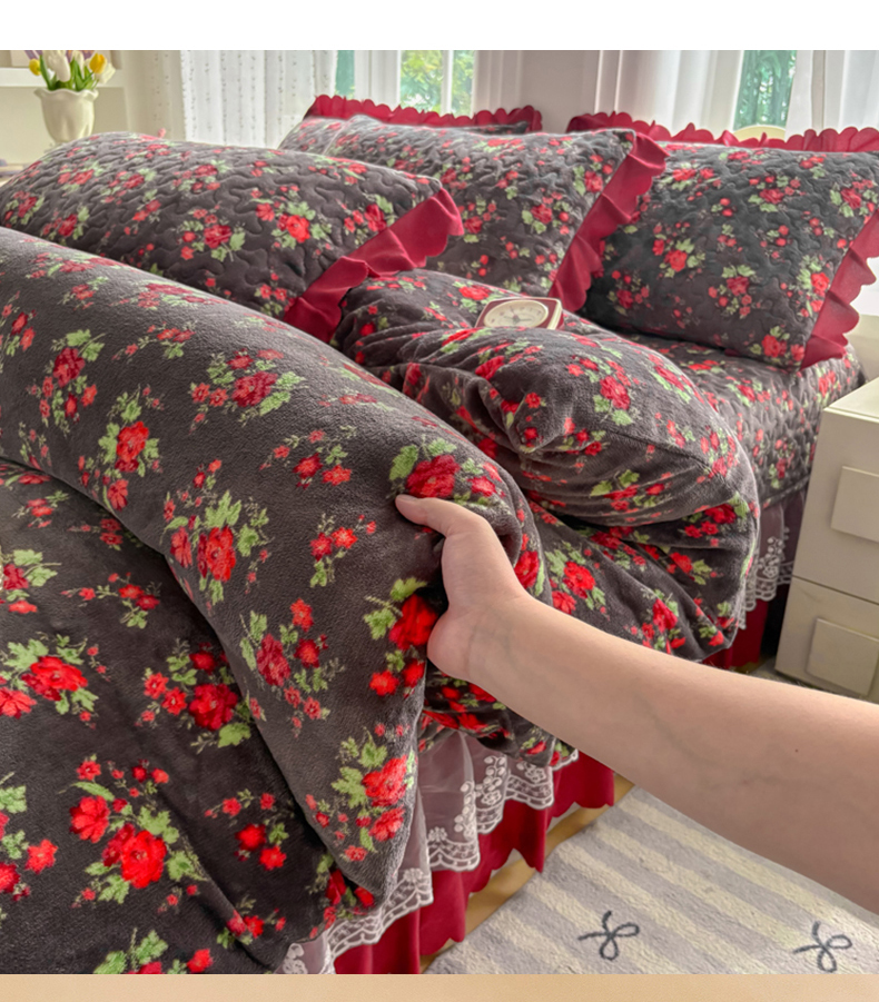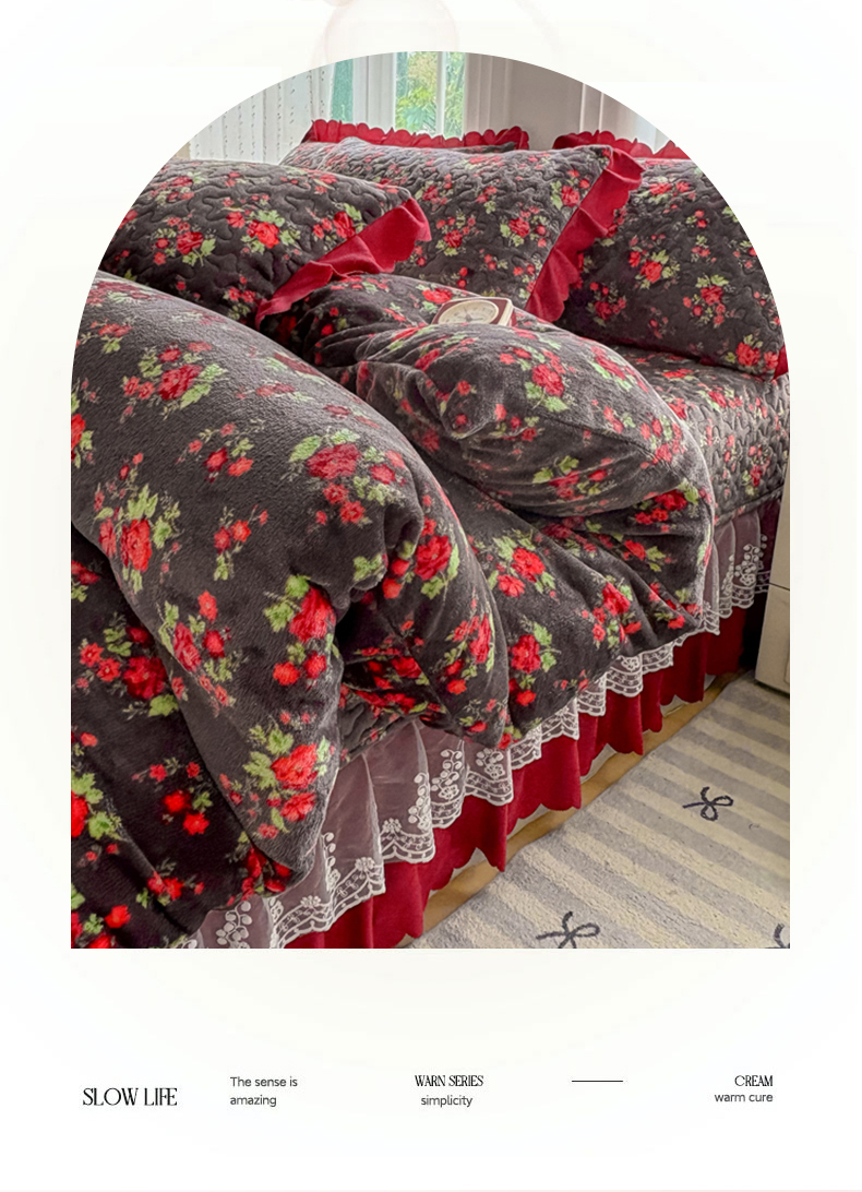 当前位置: 91家纺网 > 商品网购 > 床品套件 > 四件套 > 牛奶绒四件套 > 浩浩家纺 2025新款舒适花边牛奶绒床盖四件套 红花