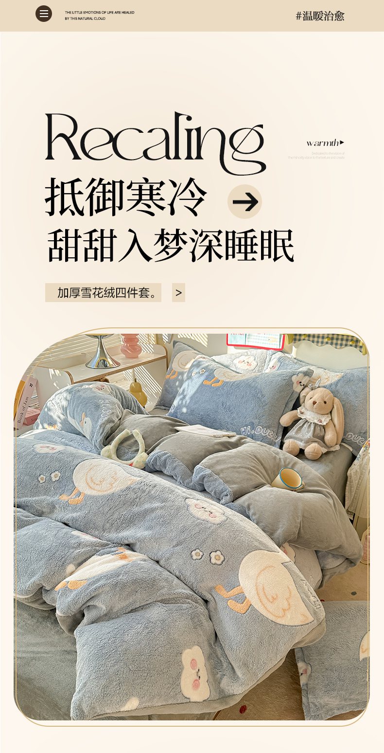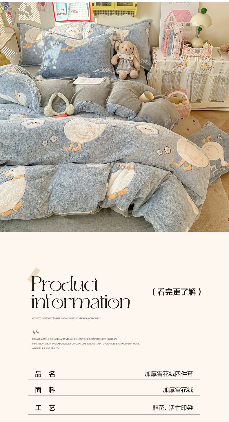 当前位置: 91家纺网 > 商品网购 > 床品套件 > 四件套 > 牛奶绒四件套 > 韩巢家纺 2025新款高克重雪花绒牛奶绒四件套系列 大白鹅