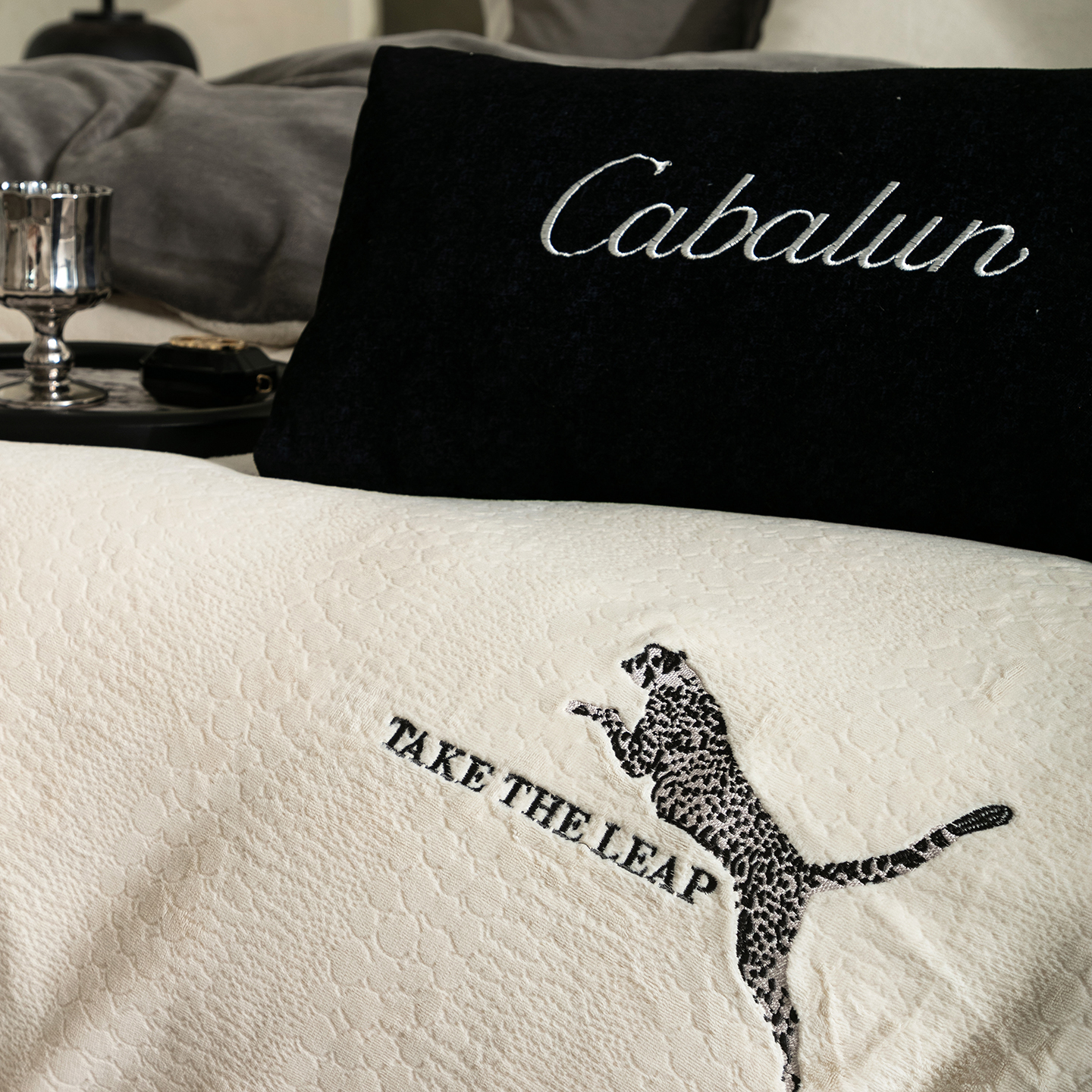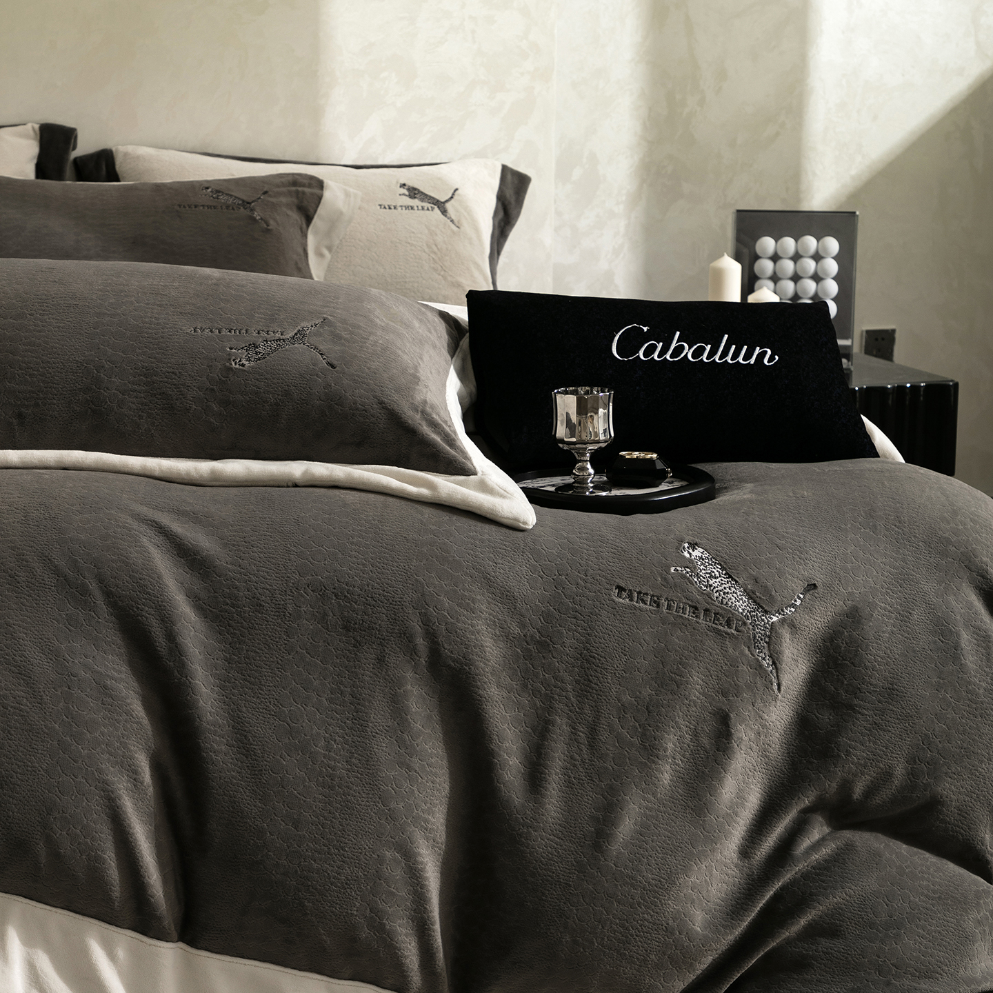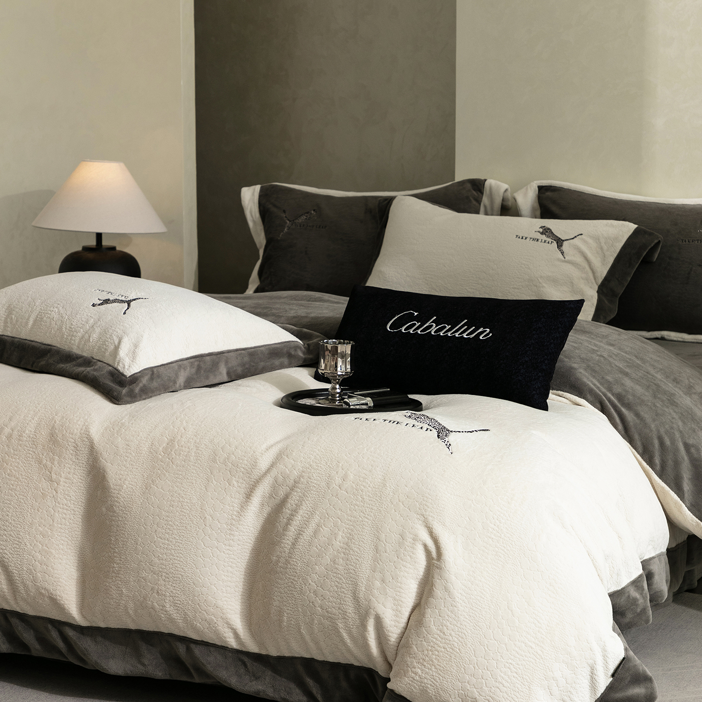 商品名称:卡巴伦家纺 2025新款烂花拼角绣花四件套-豹富(会员:-20元 控价:298) 豹富-雅致灰