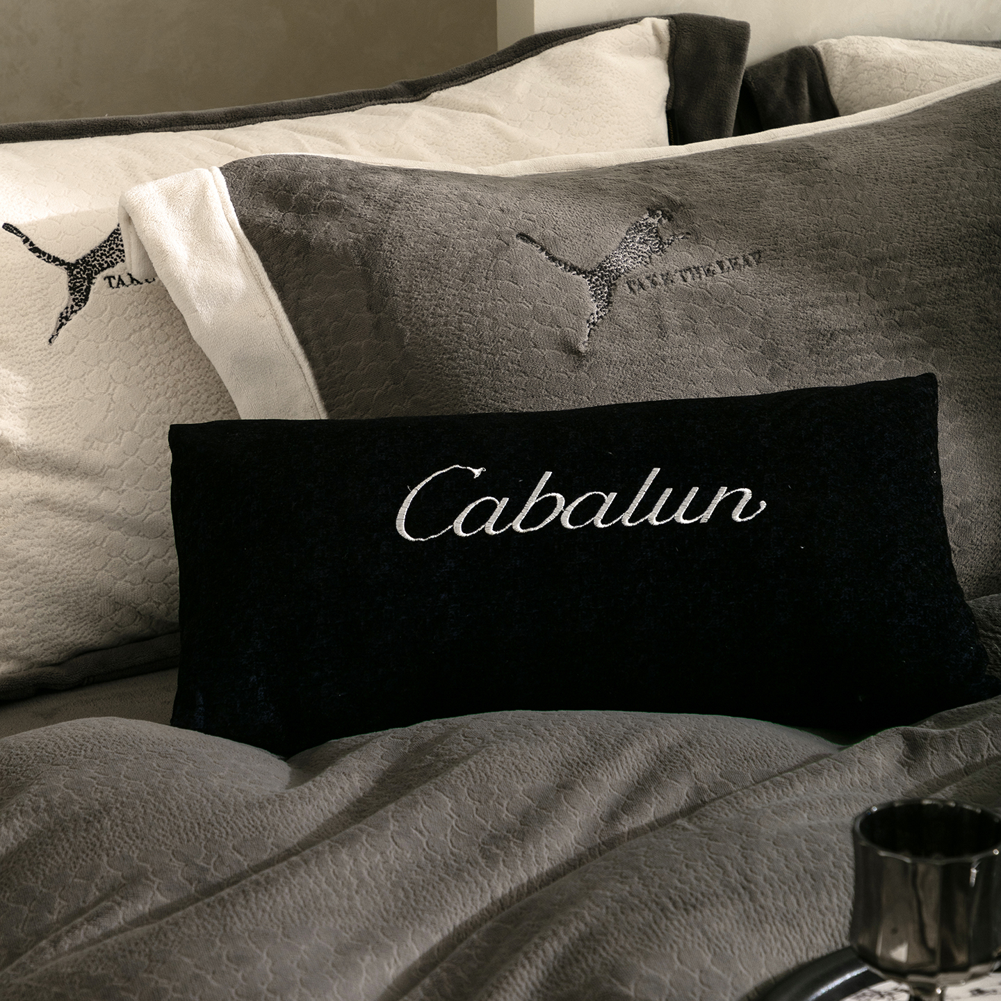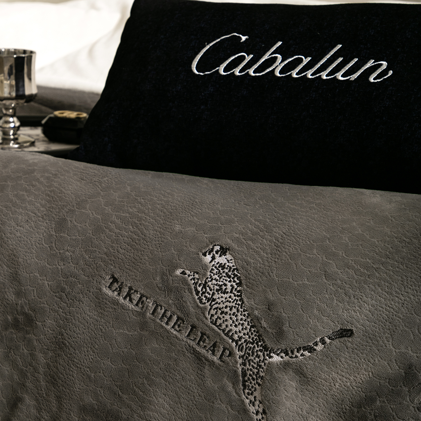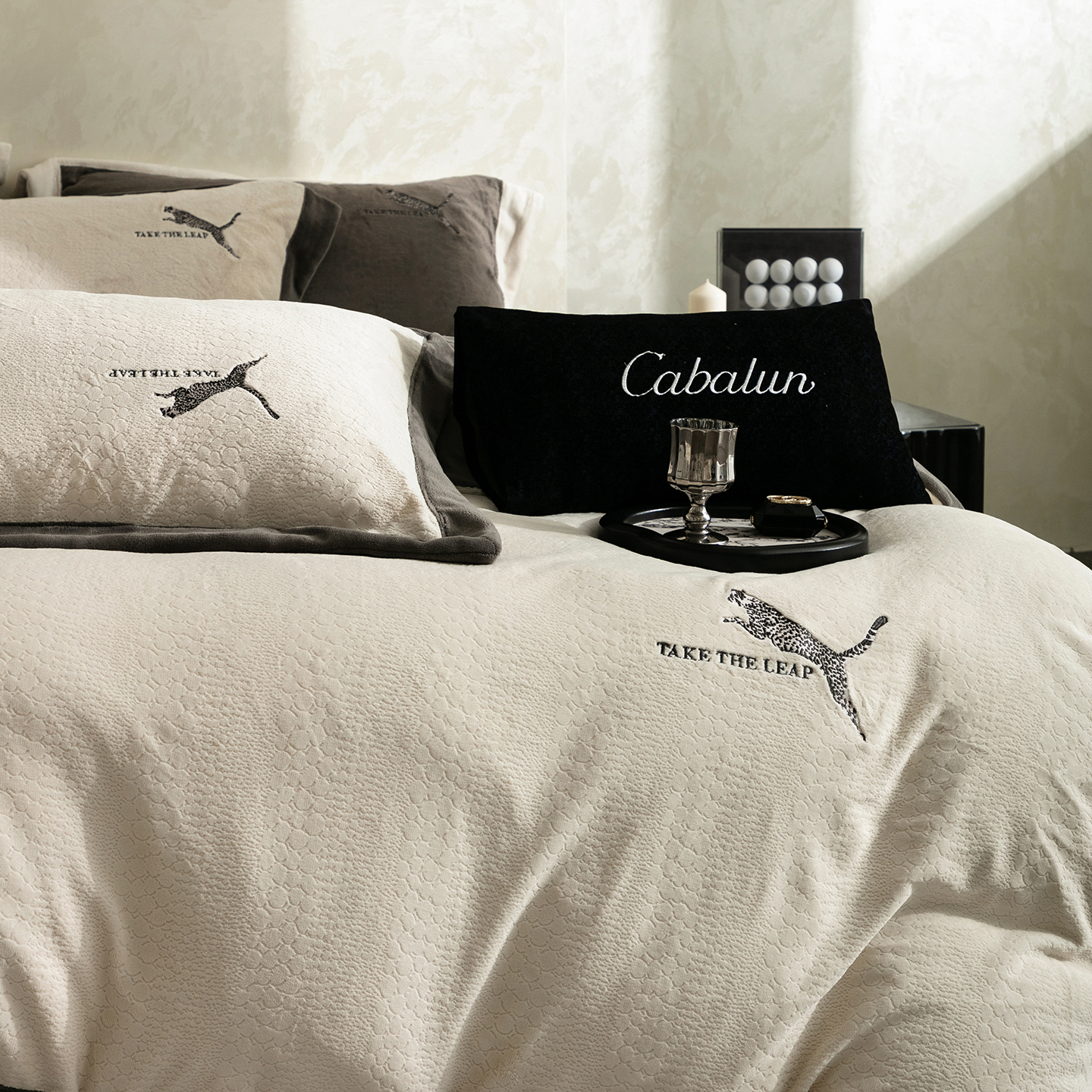 商品名称:卡巴伦家纺 2025新款烂花拼角绣花四件套-豹富(会员:-20元 控价:298) 豹富-雅致灰
