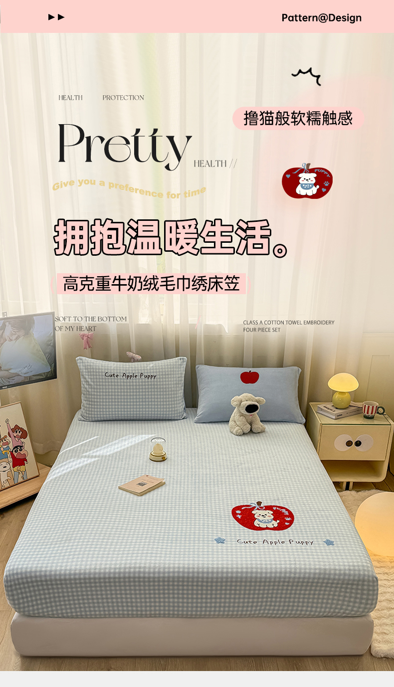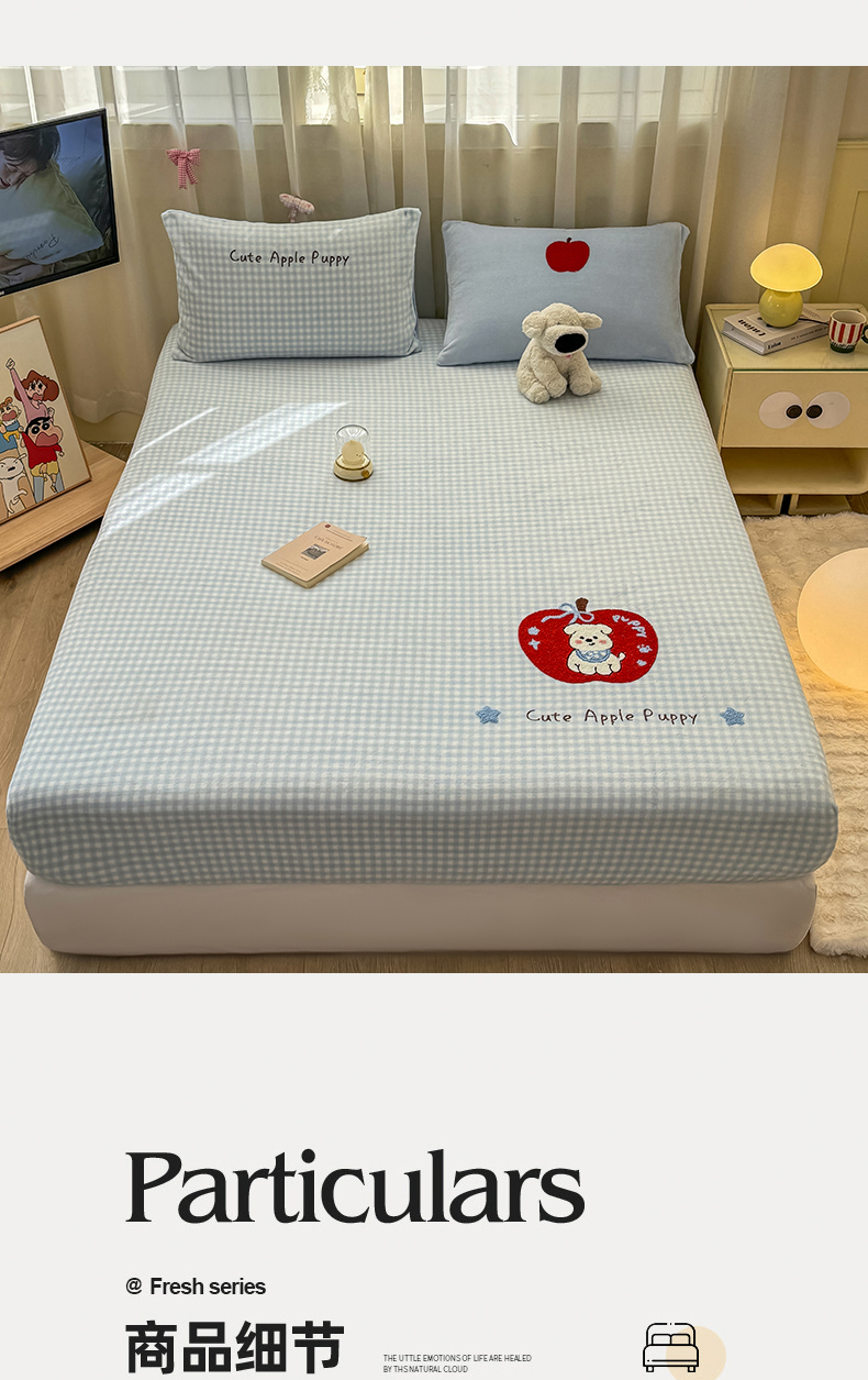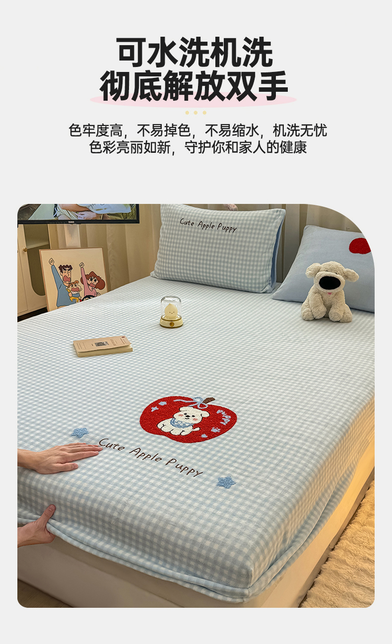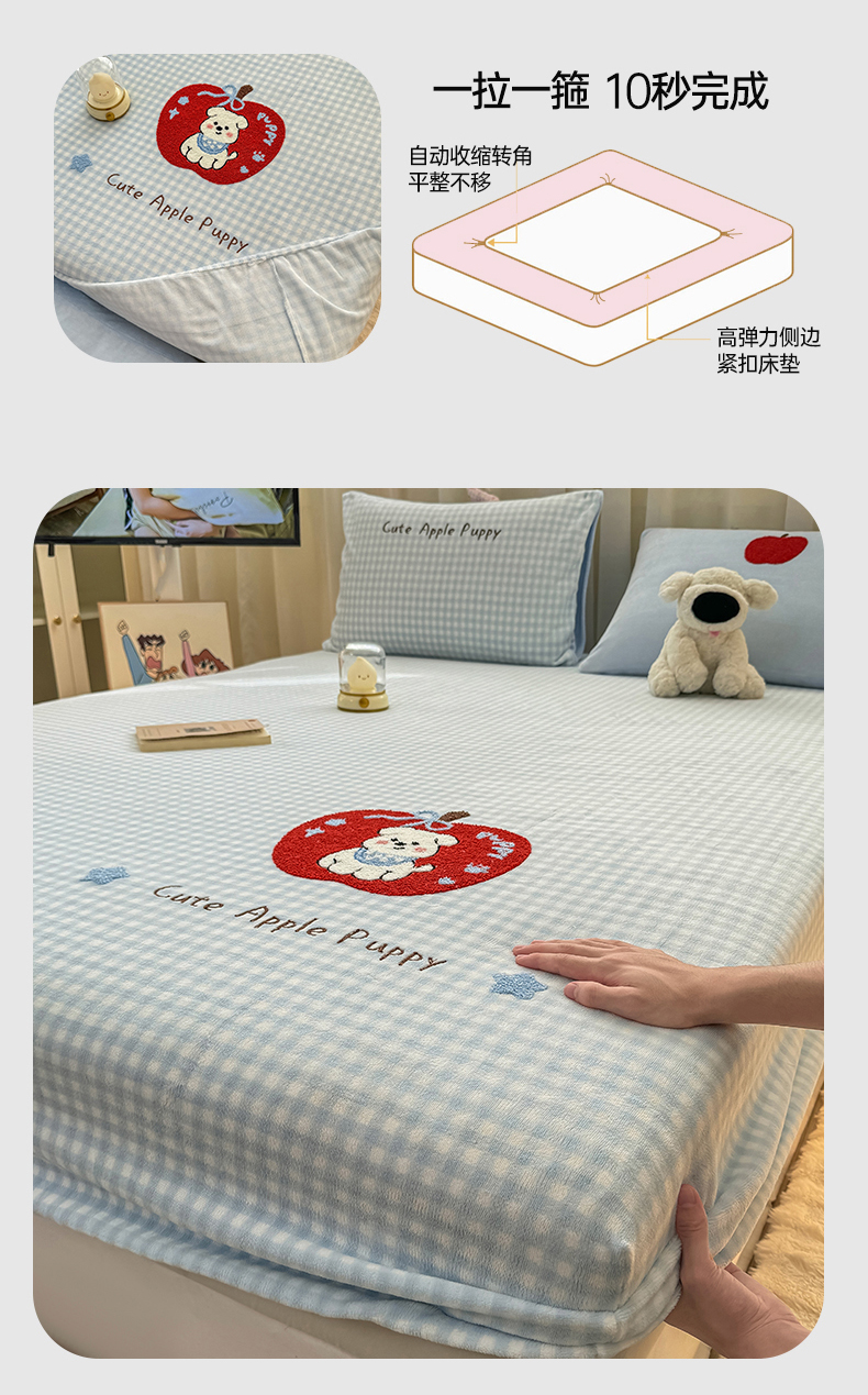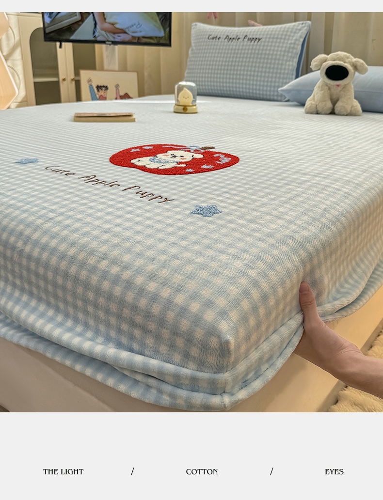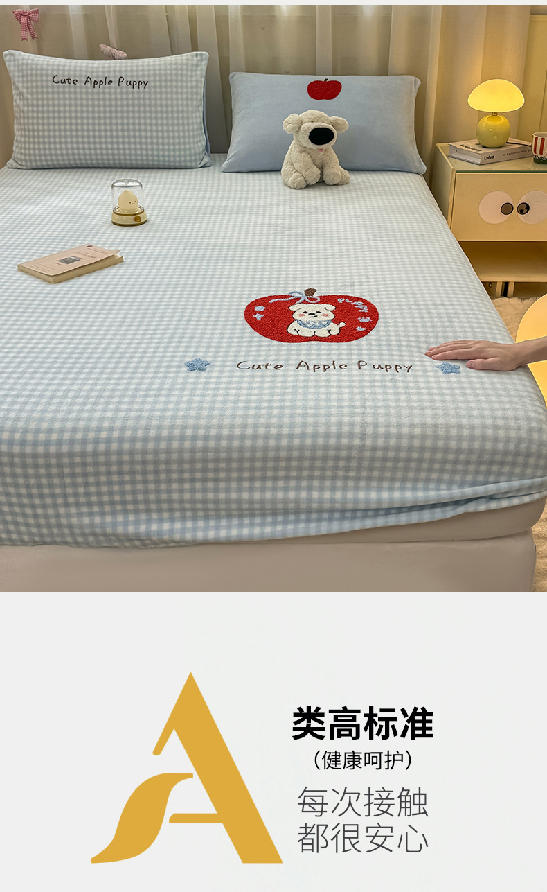 • 91家纺网 家纺一手货源 找家纺 灰鲸 2025新款高克重牛奶绒毛巾绣床笠单床笠单品床笠床笠单件 蓝格苹果狗