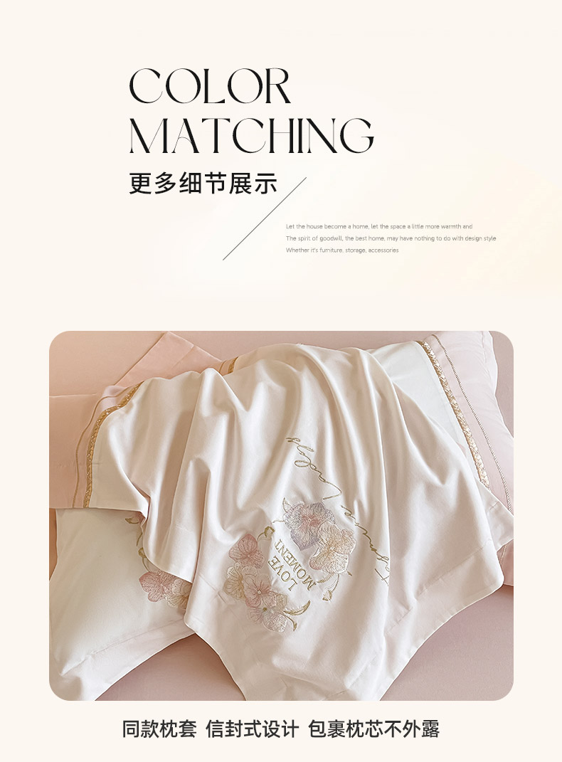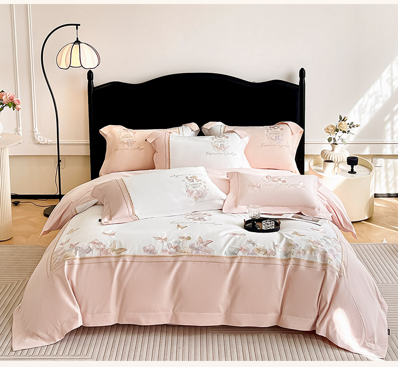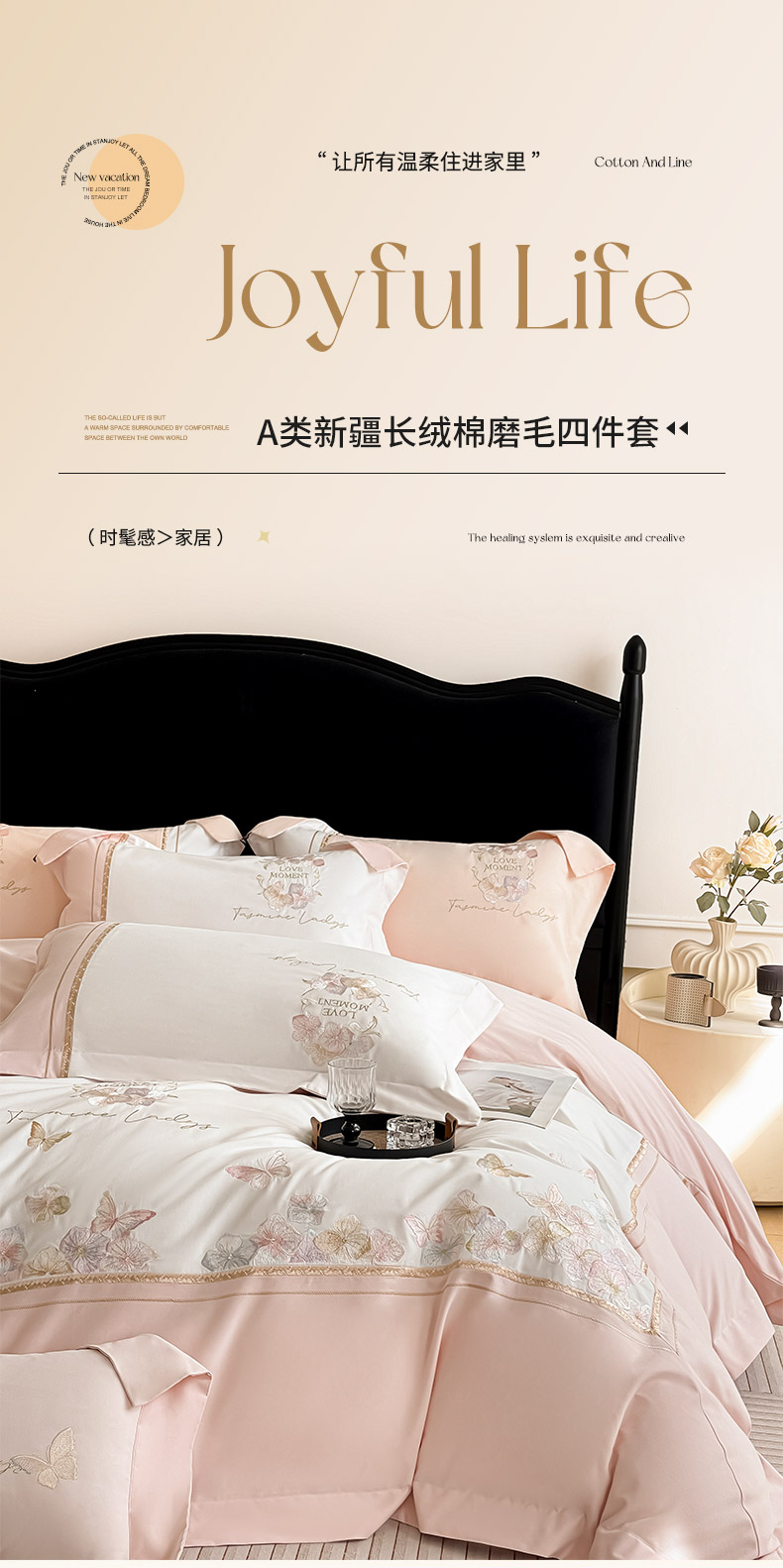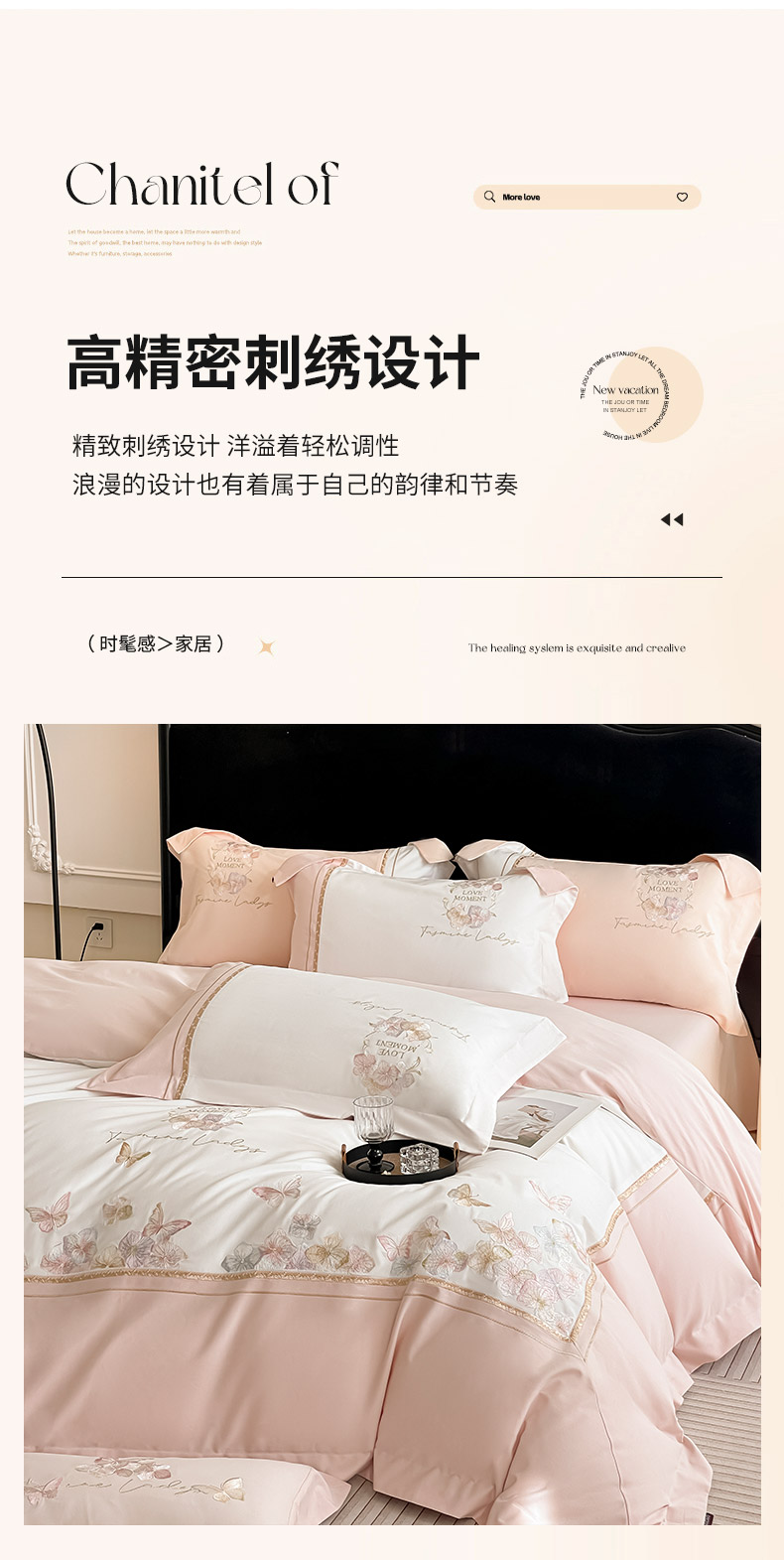 • 91家纺网 家纺一手货源 找家纺 (总) 2026新款高端轻奢风A类贡缎长绒棉四件套纯棉重工刺绣被套床单高级感床笠床上用品,格拉芙-芸粉,格拉芙-柔杏
