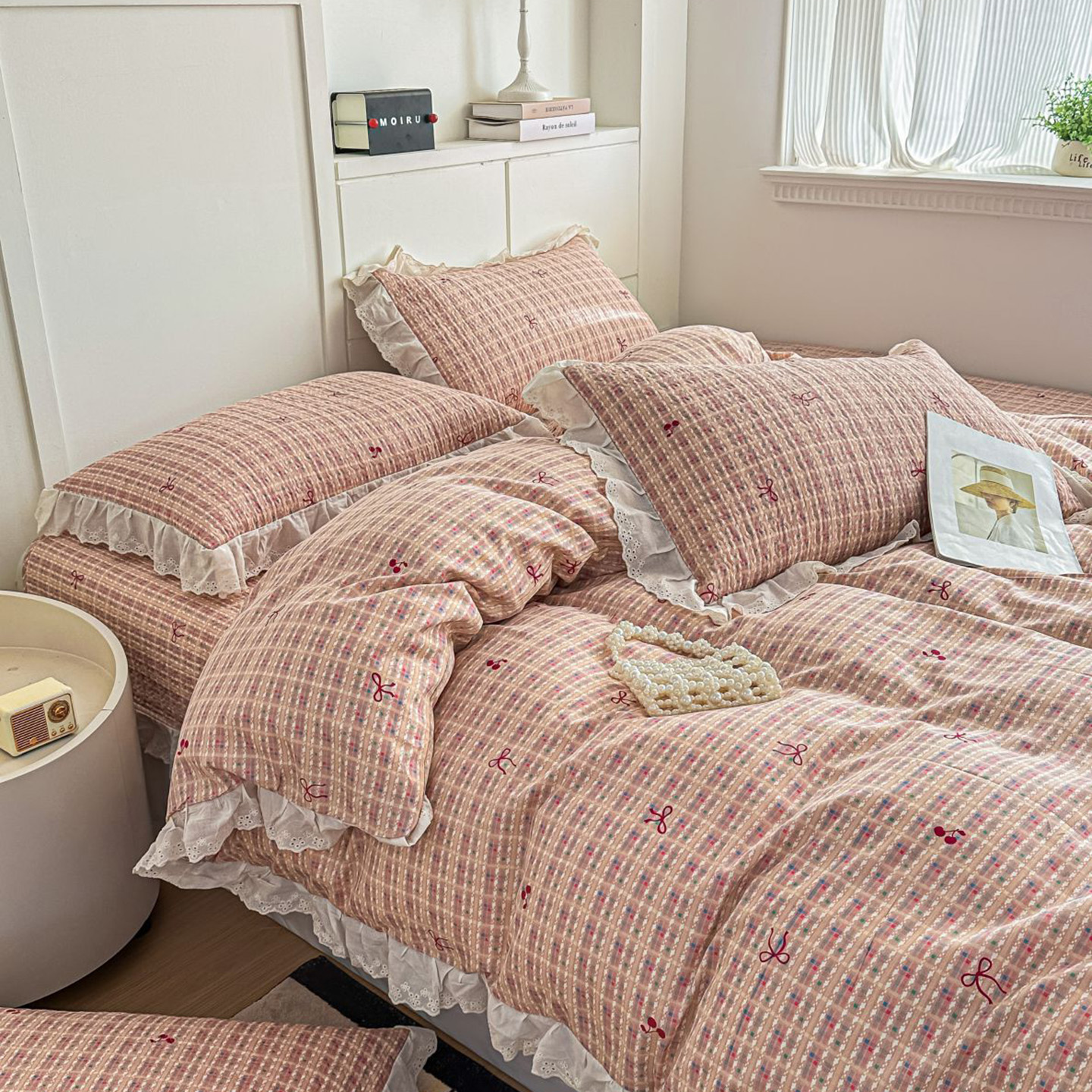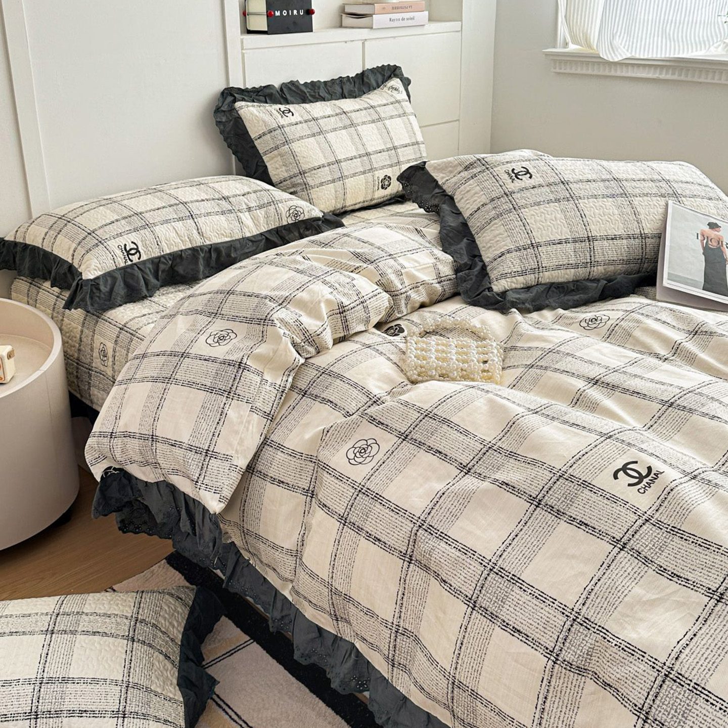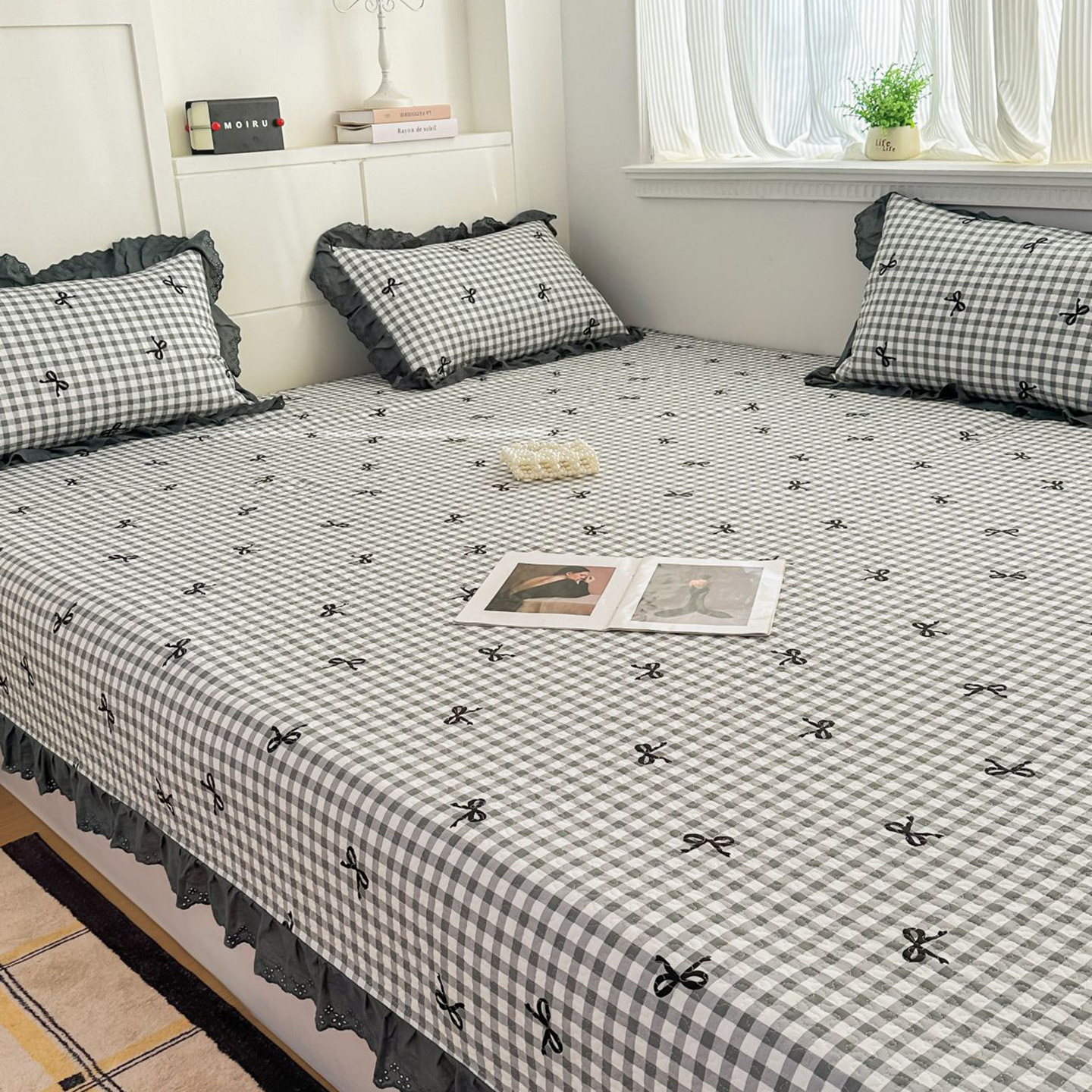 当前位置: 91家纺网 > 商品网购 > 床上用品 > 床盖 > 暖居 2026新款支持定制法式花边纯棉榻榻米四件套全棉大炕盖三件套四季通用 灰格蝴蝶结