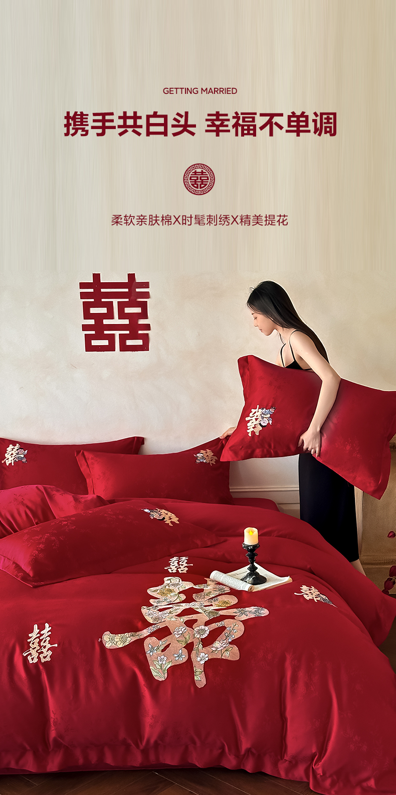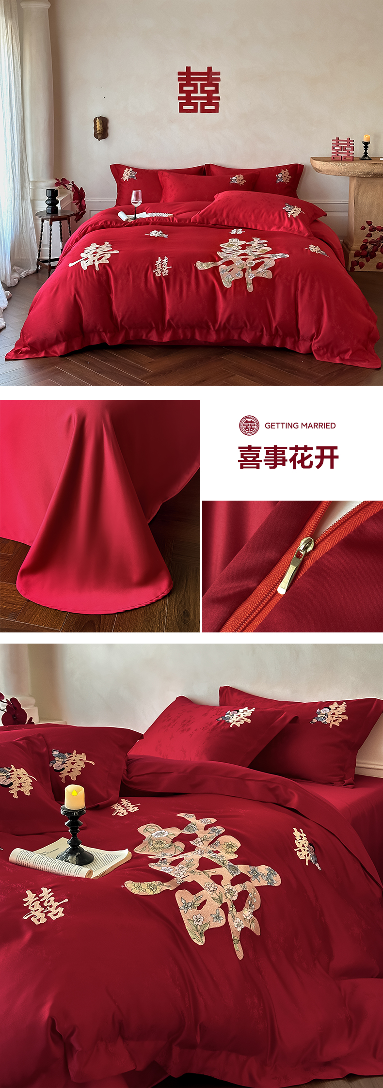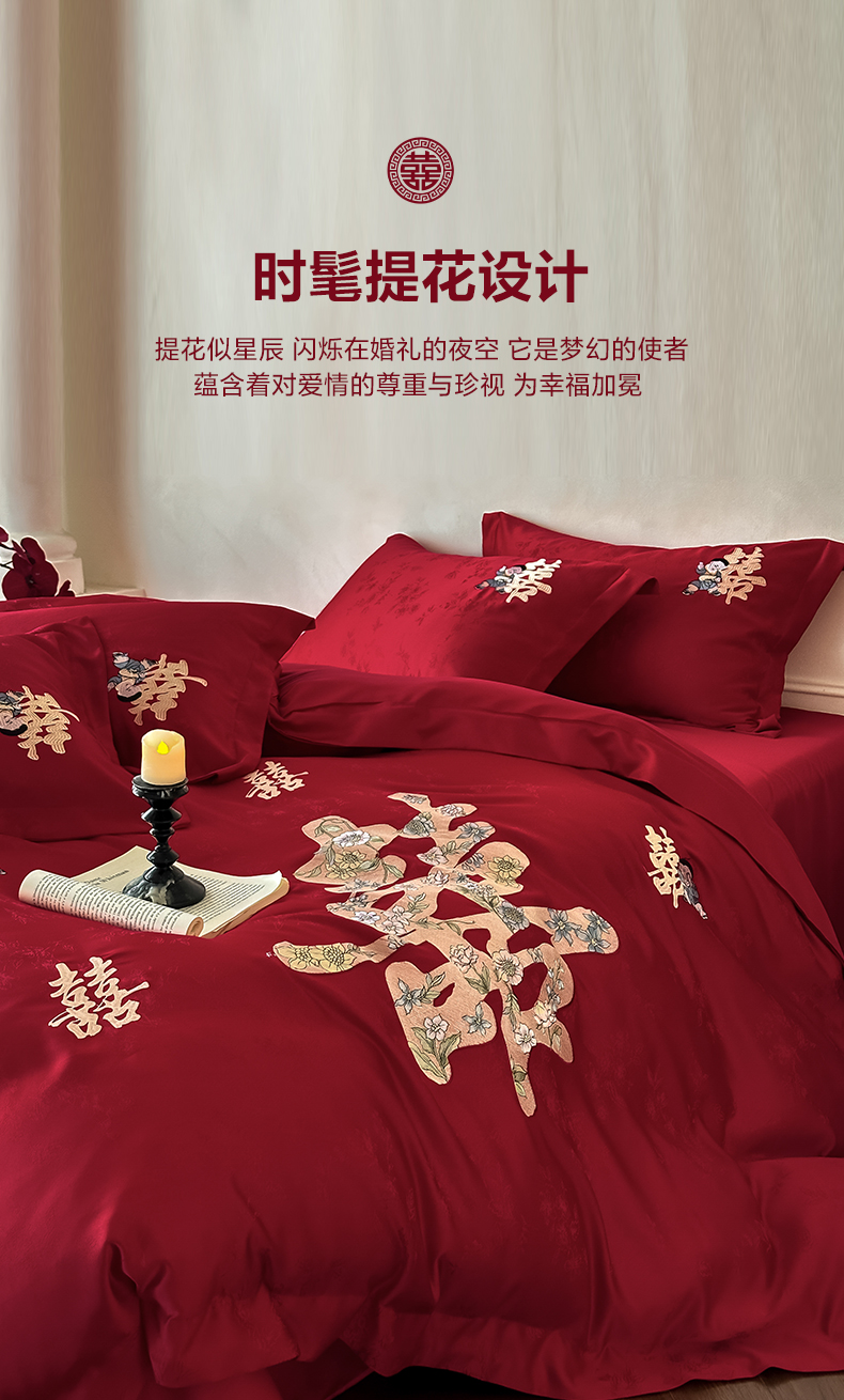 商品名称:欧乐蒂 2025冬季新品亲肤棉提花刺绣婚庆四件套 喜事花开