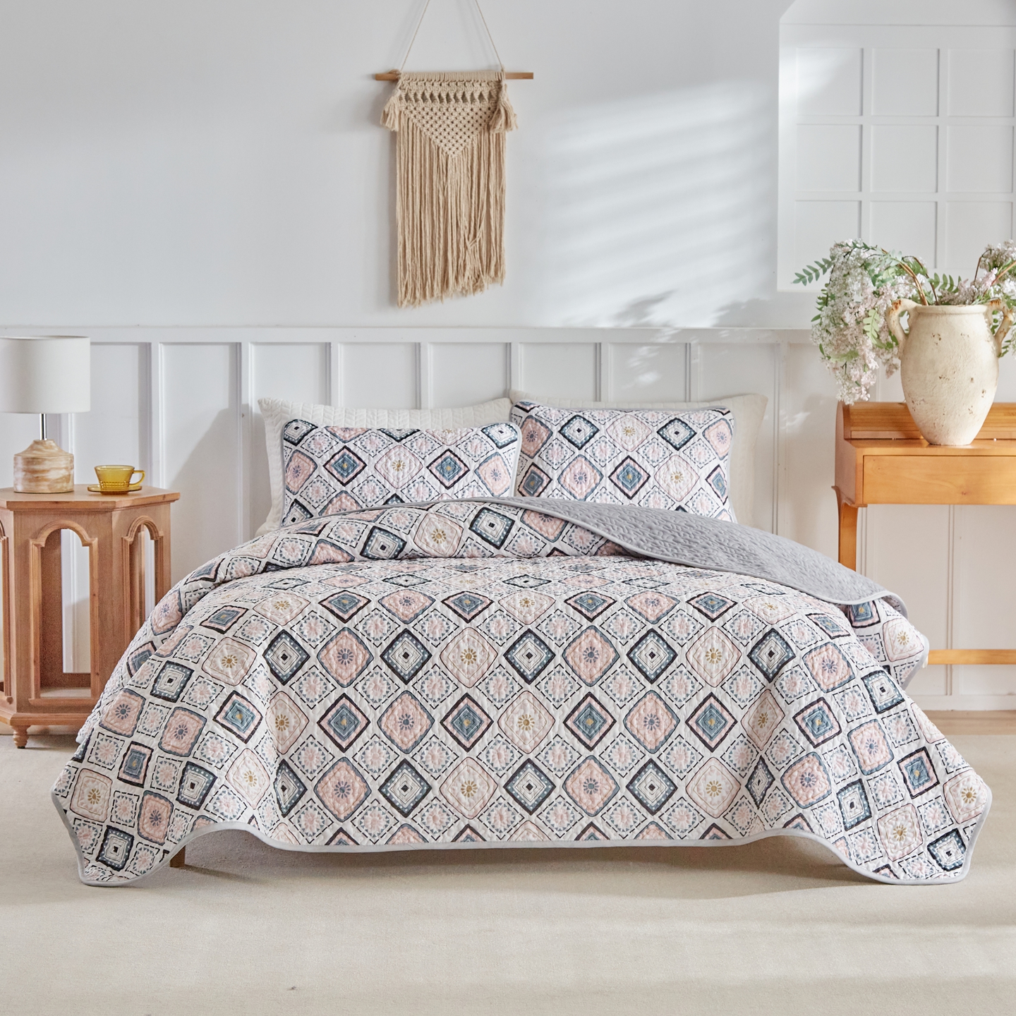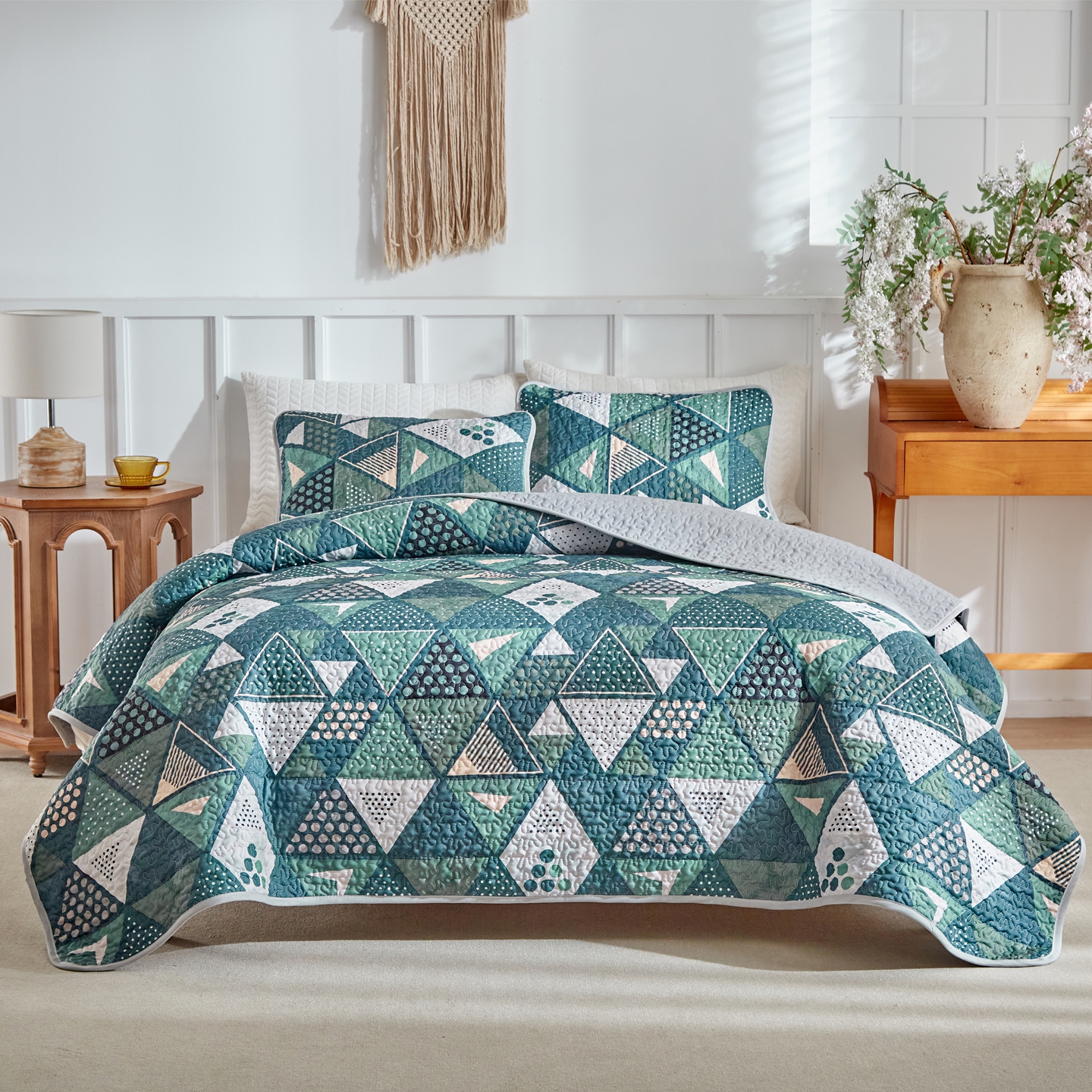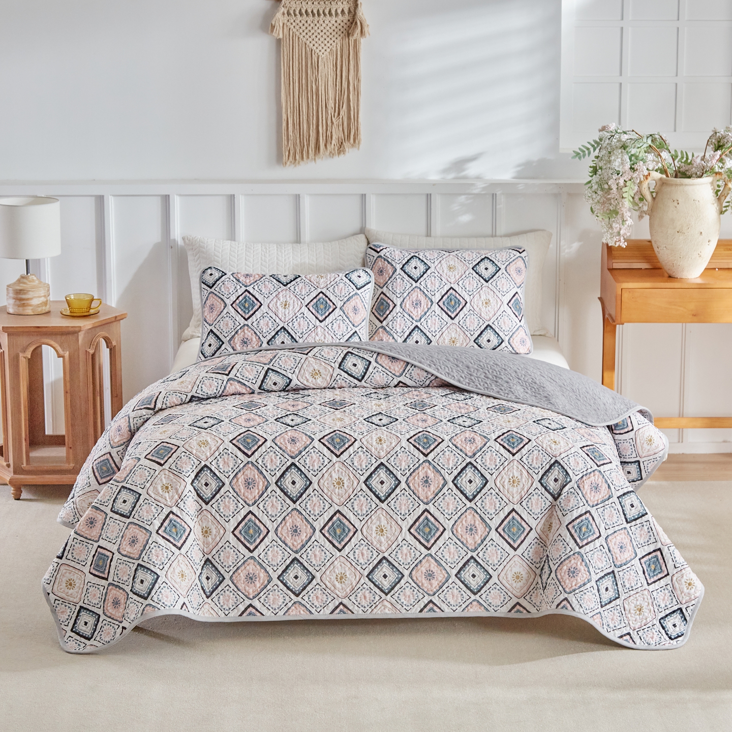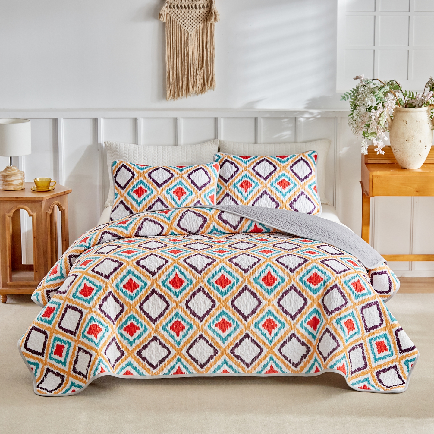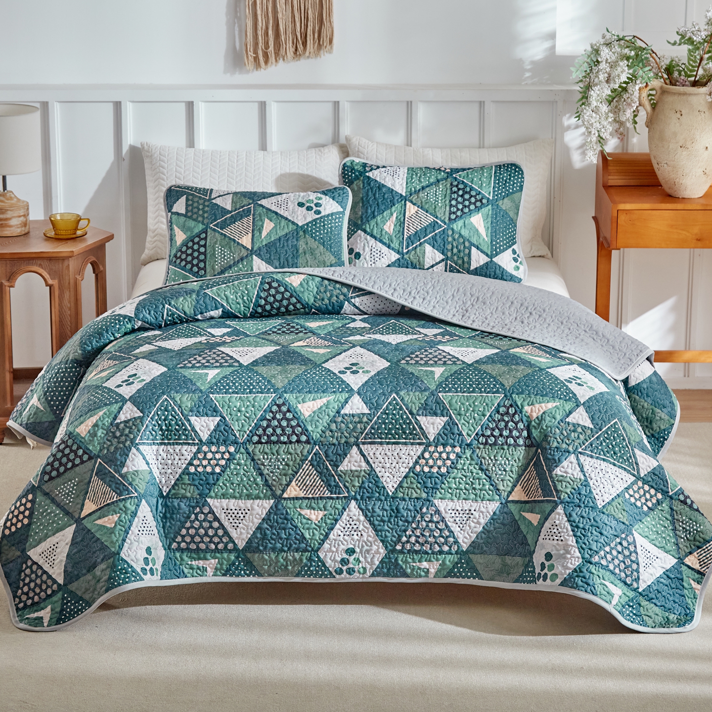 (总)温宁家纺 2025新款菱形格床盖三件套 国外薄被,菱形格-灰色,菱形格-绿色,菱形格-米色