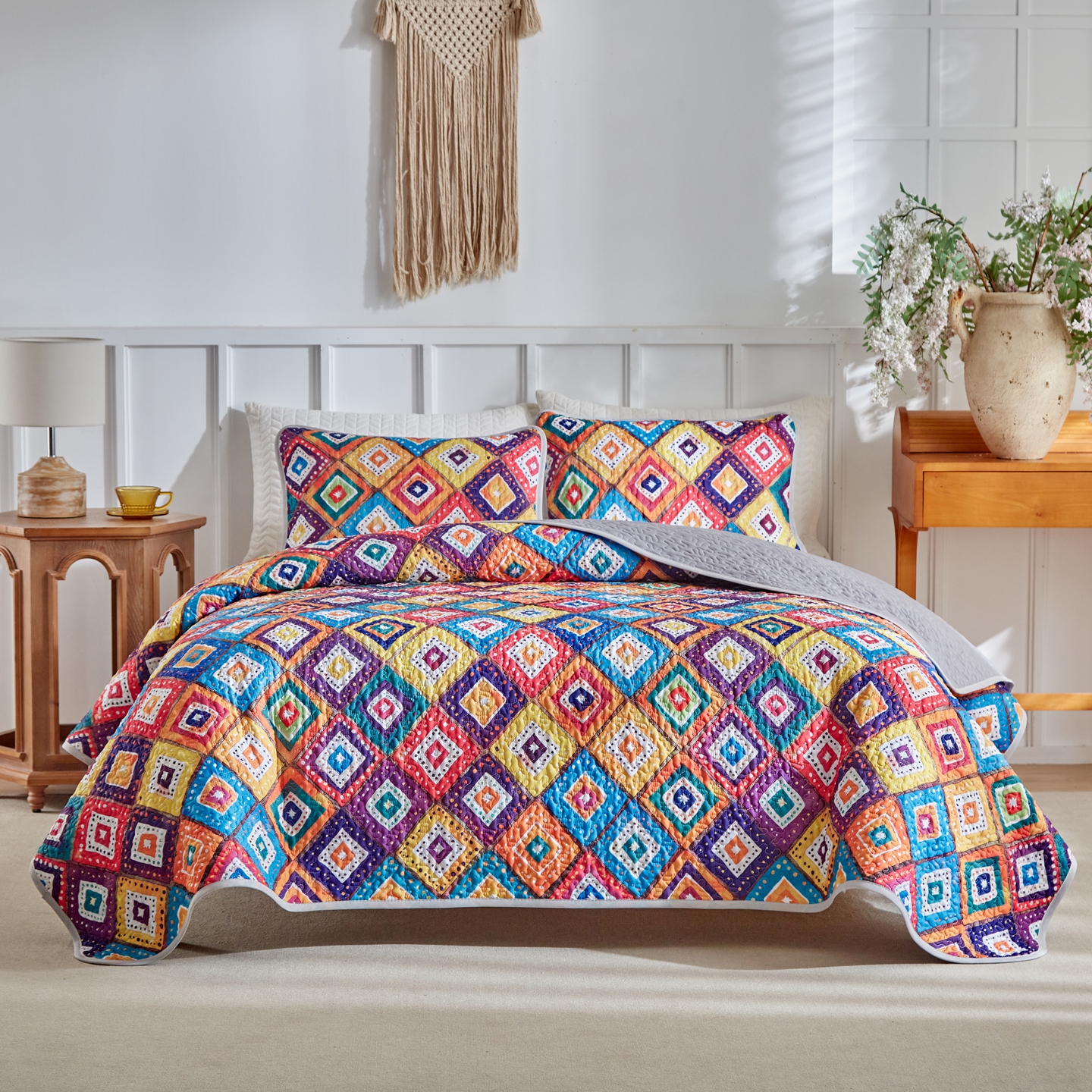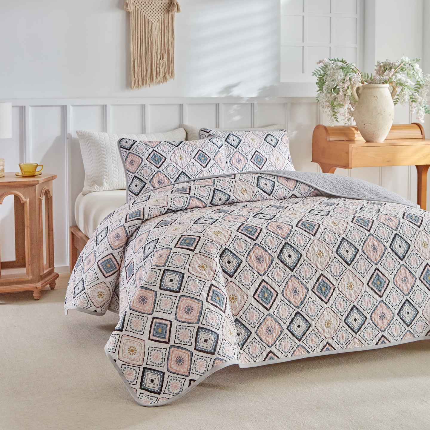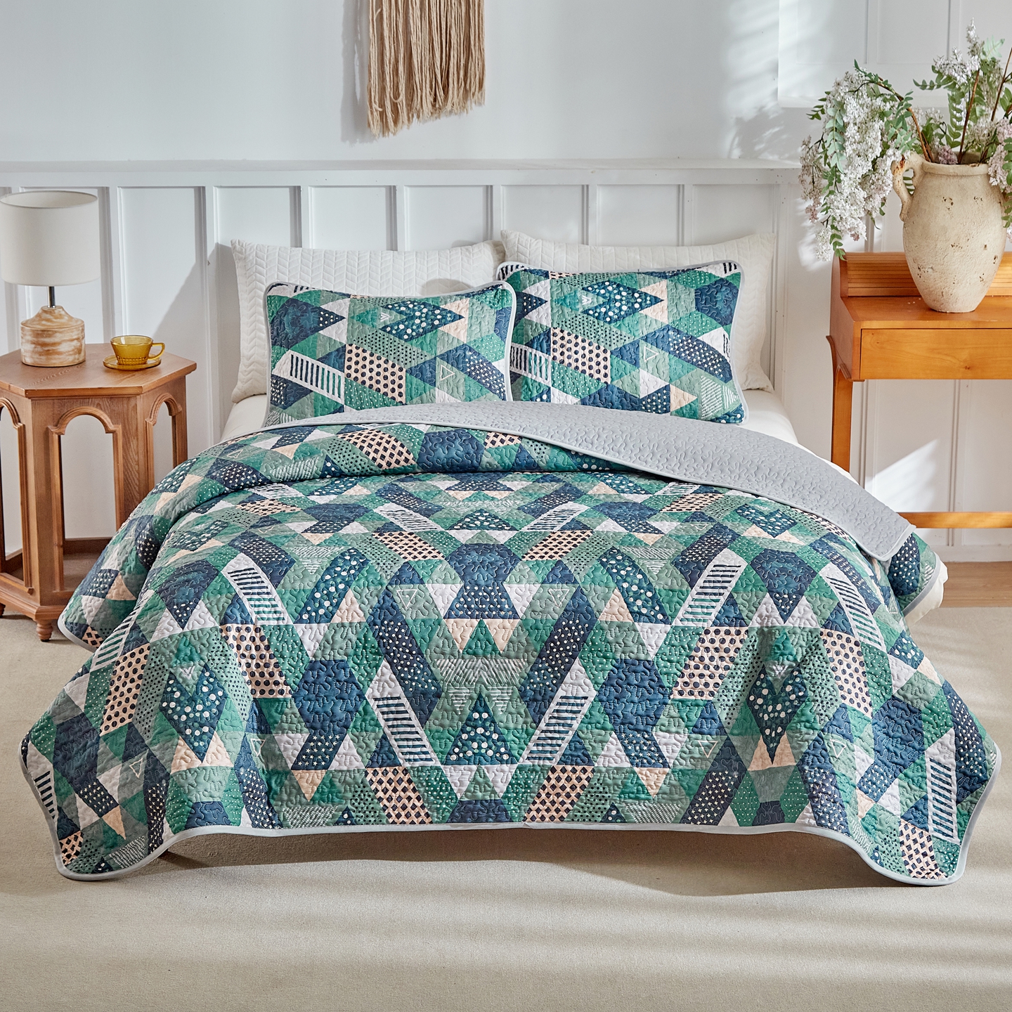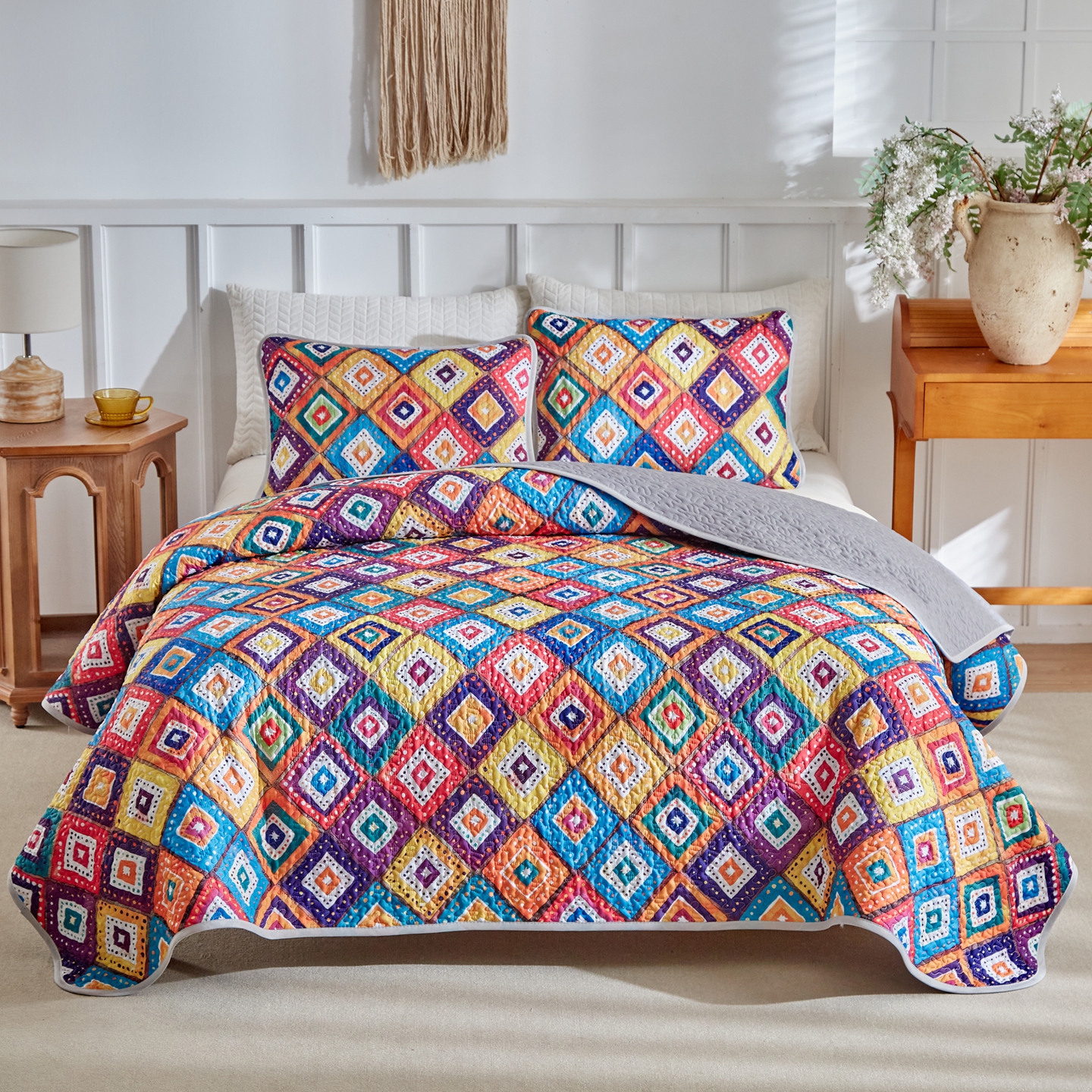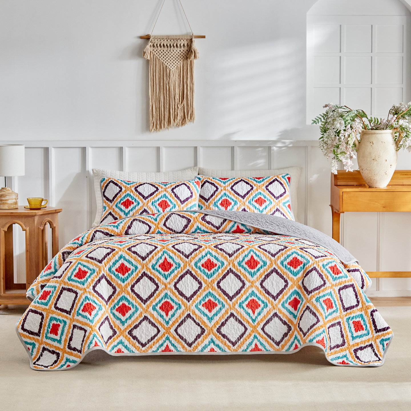 (总)温宁家纺 2025新款菱形格床盖三件套 国外薄被,菱形格-灰色,菱形格-绿色,菱形格-米色