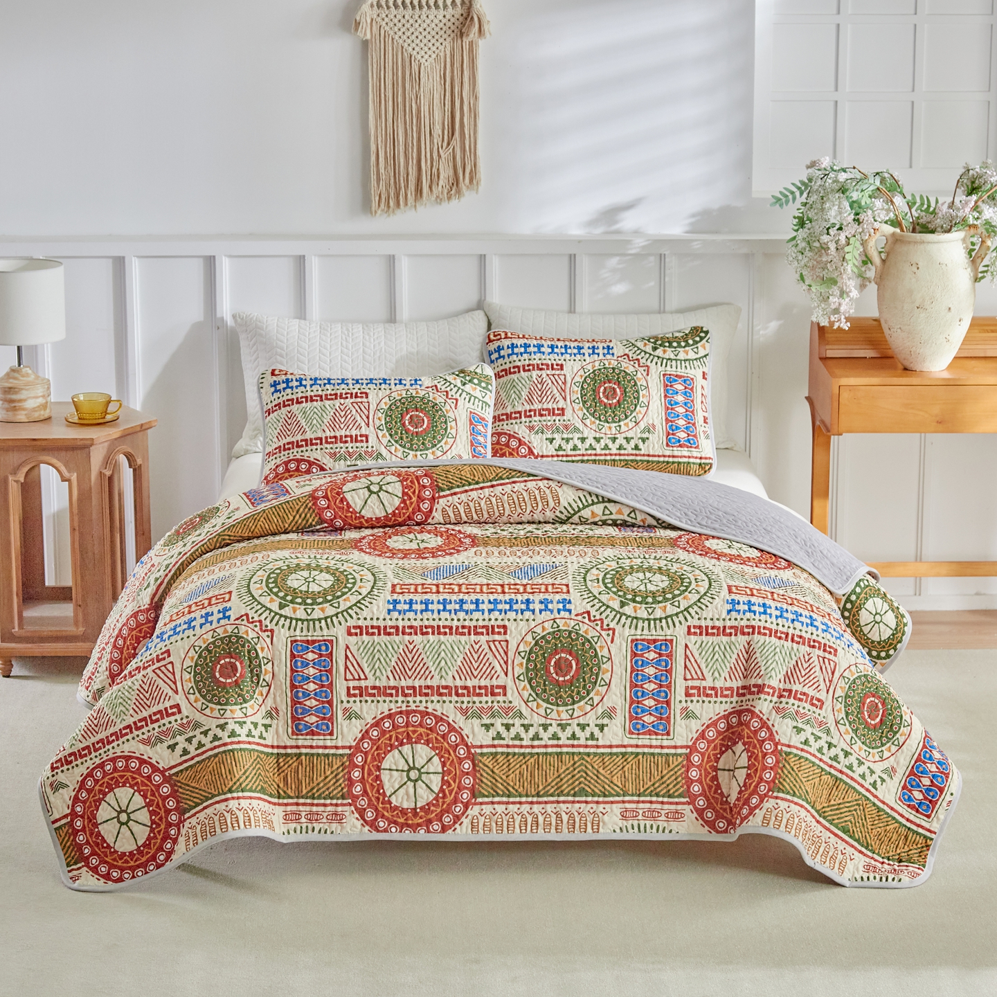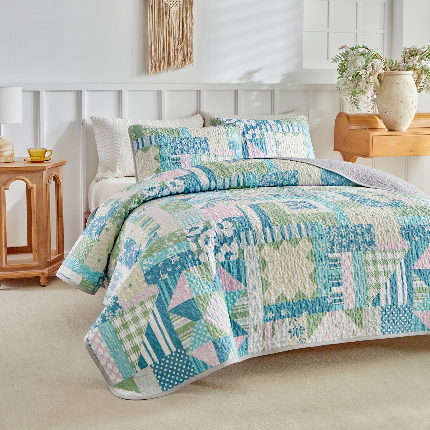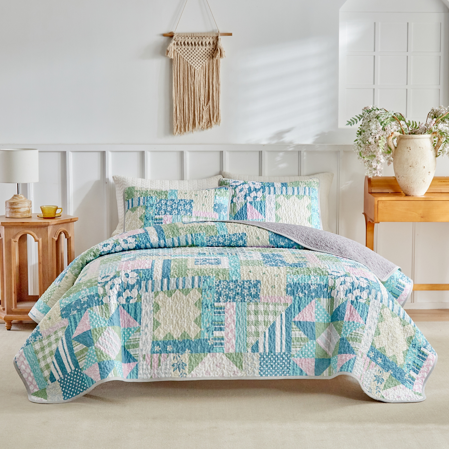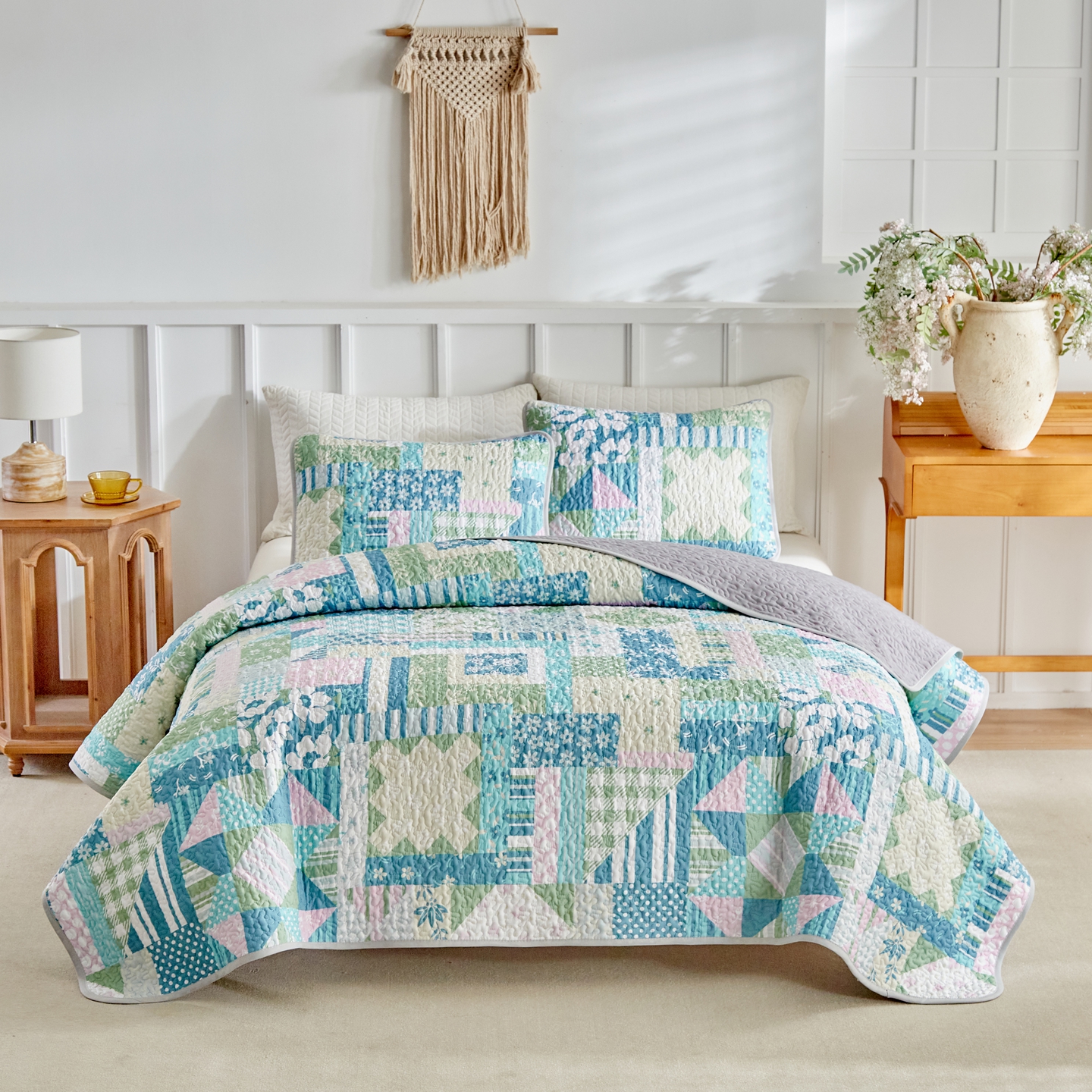 (总)温宁家纺 2025新款跨境双面化纤水洗棉小方块夹棉四季床盖(国外也当做夏被),绿色,米色,银灰
