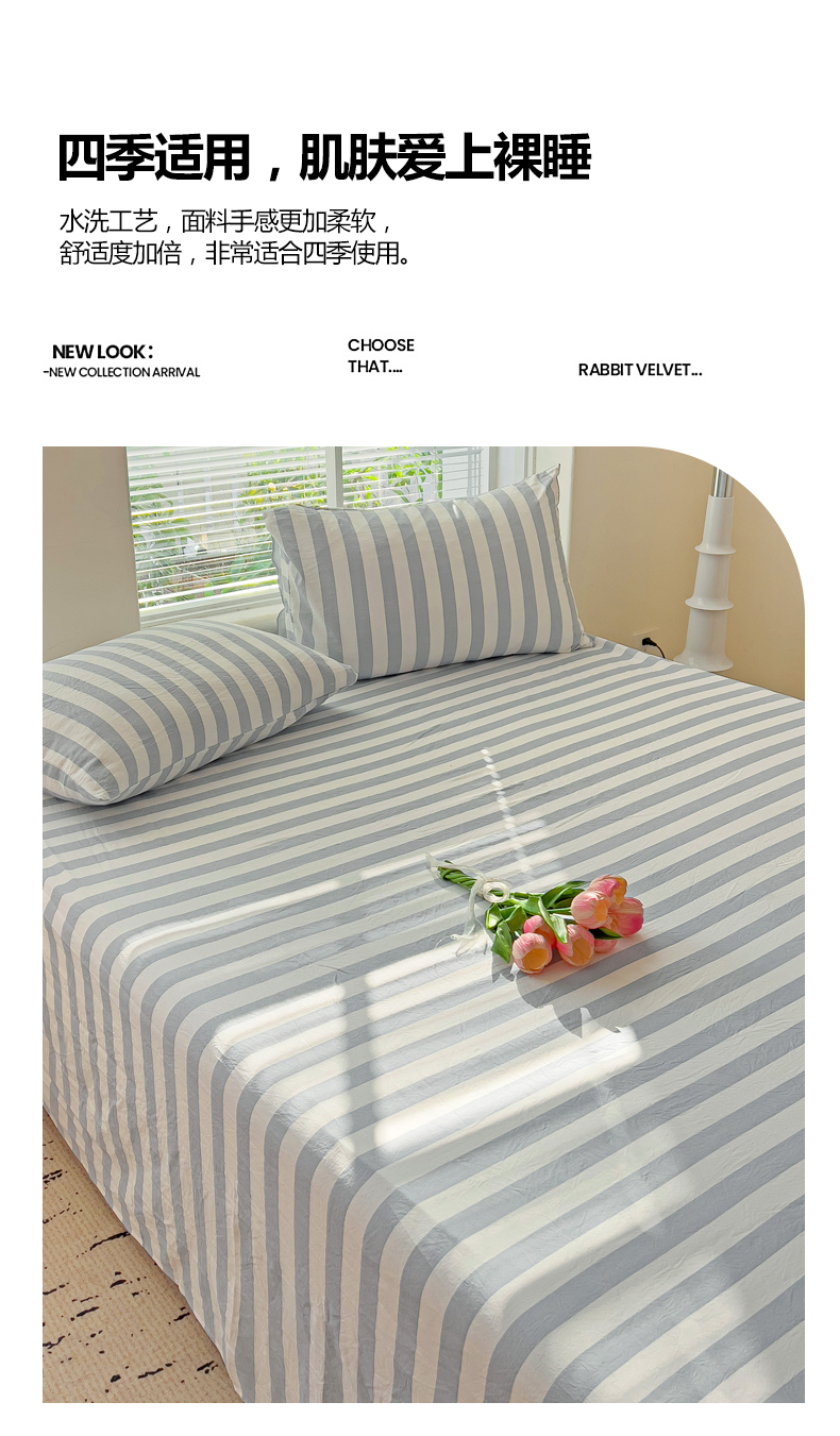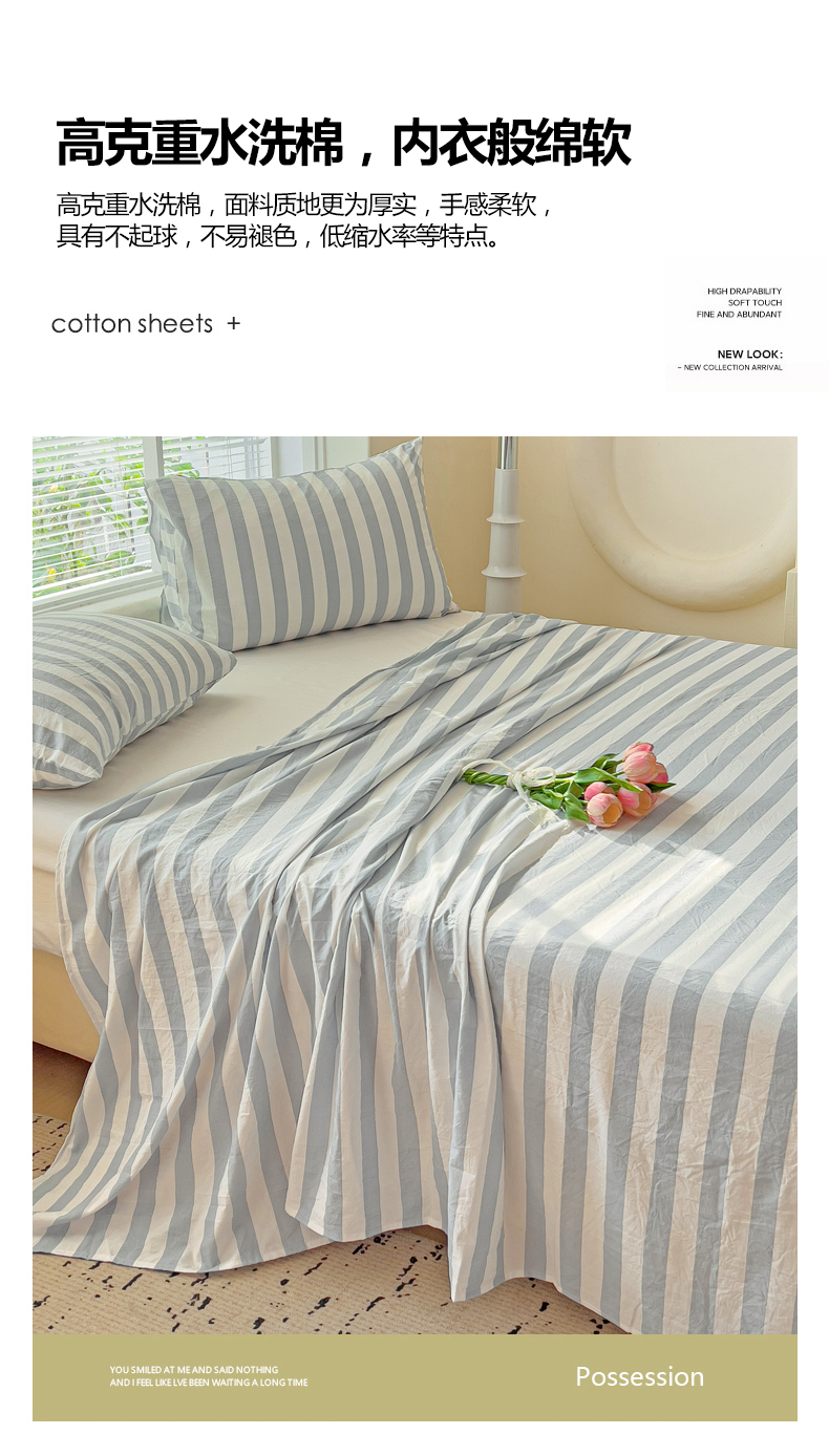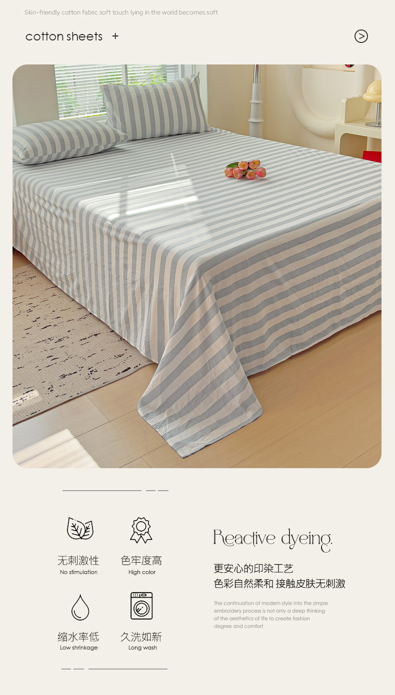 爱彼家纺 2026春夏新款中条床单水洗棉亲肤柔软床单三件套-条纹系列一 蓝灰中条