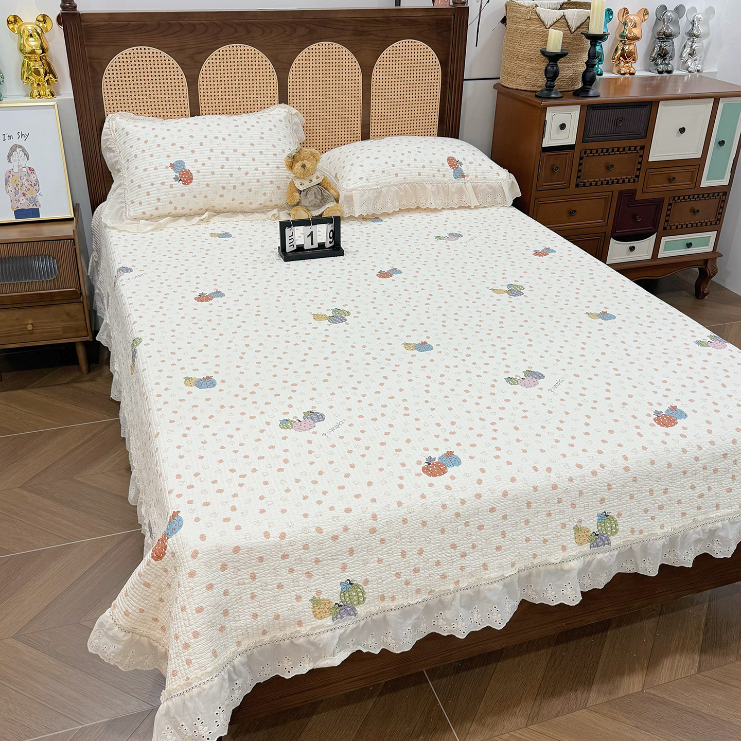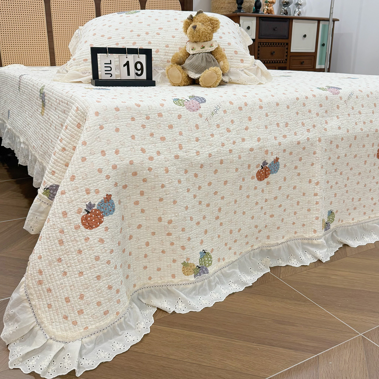 欣宜家纺 2026新款法式双面全棉填充棉花加厚花边床盖三件套 南瓜甜心