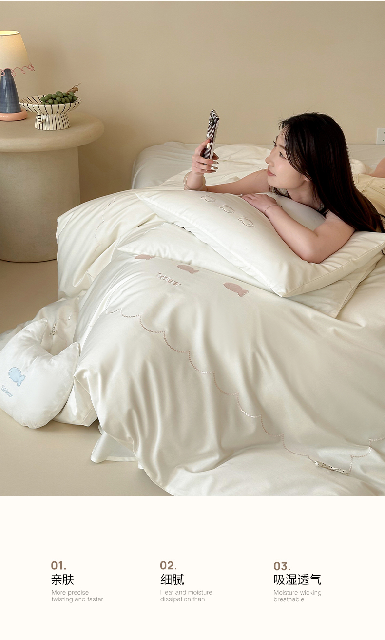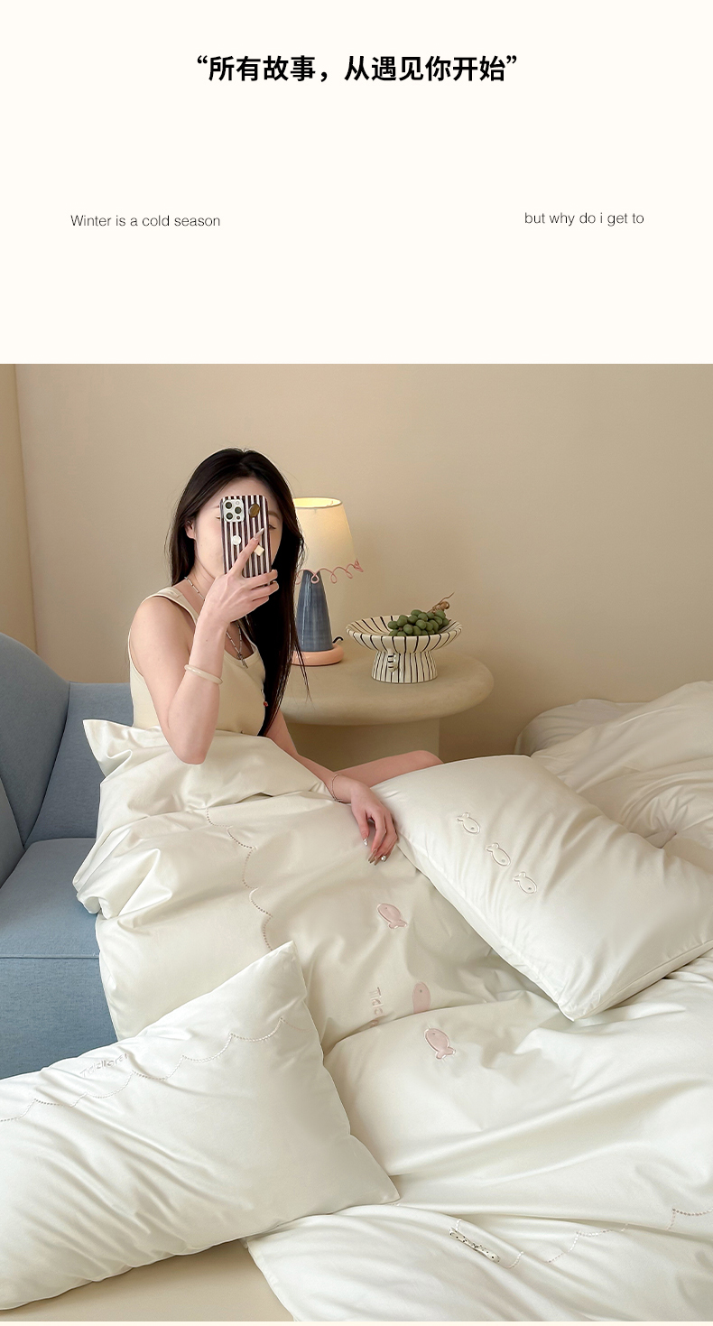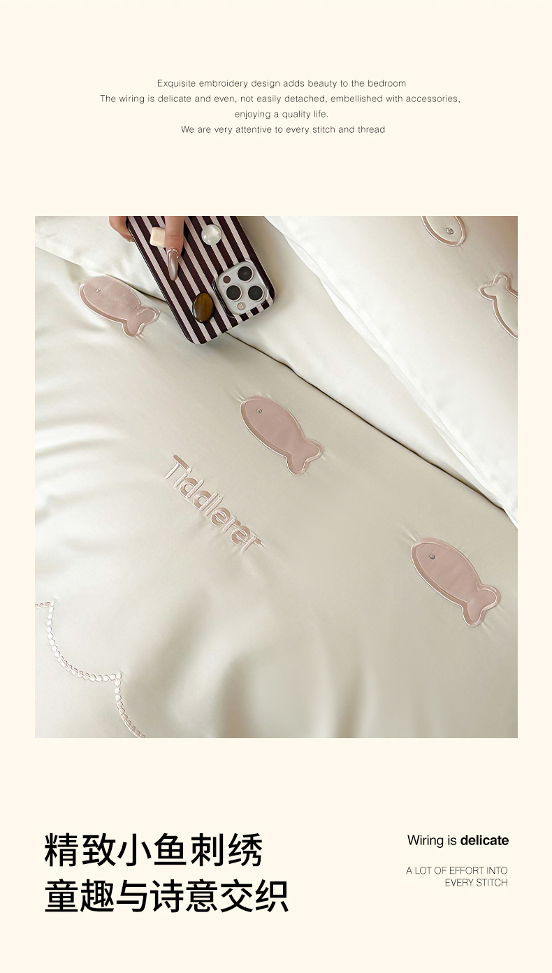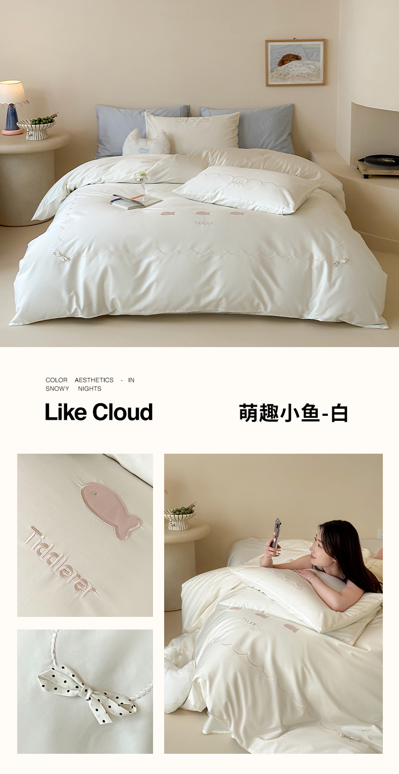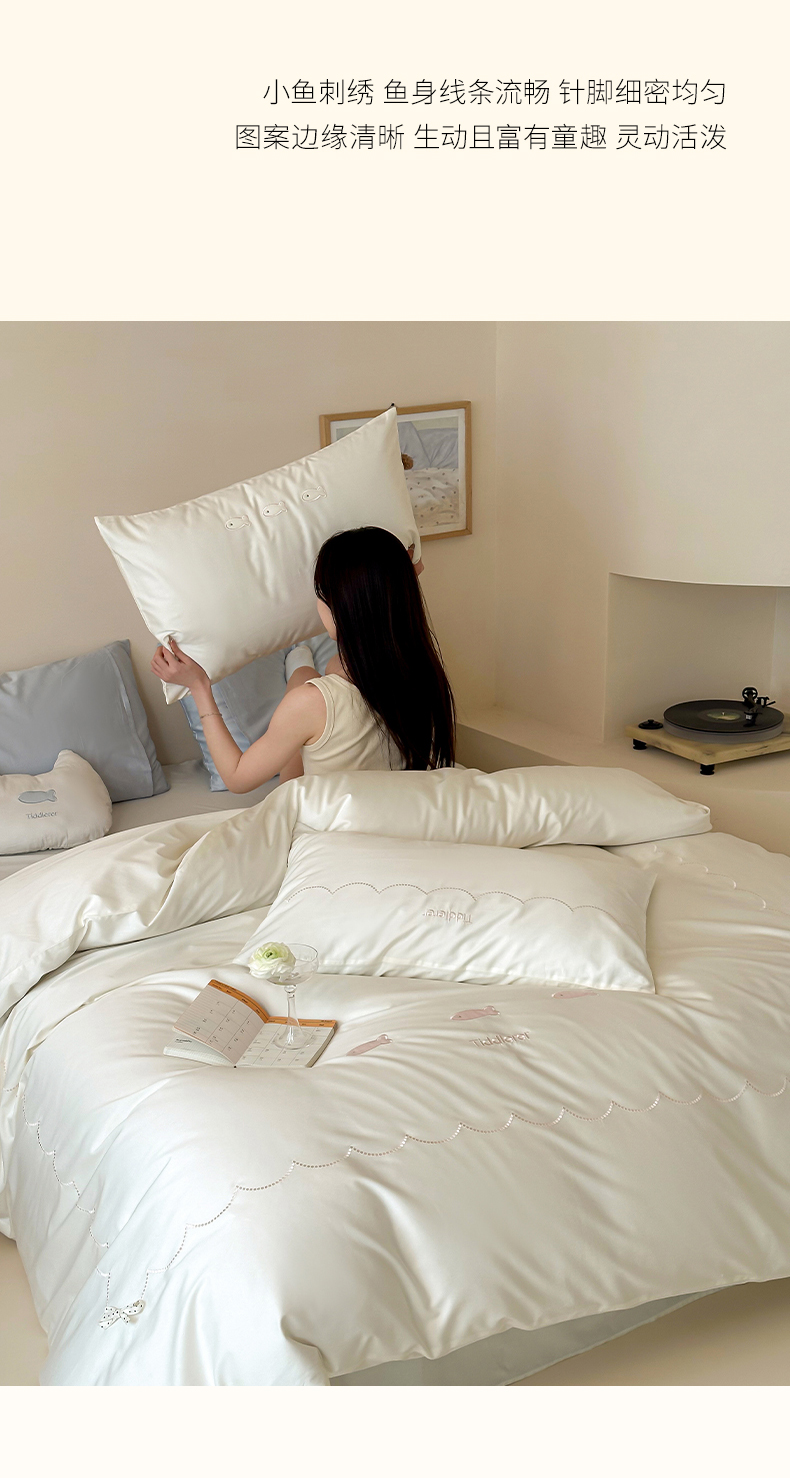 当前位置: 91家纺网 > 商品网购 > 床品套件 > 四件套 > 长绒棉四件套 > 极简 2026新款100S长绒棉刺绣四件套-萌趣小鱼(小号控价258标准288加大308) 萌趣小鱼-白
