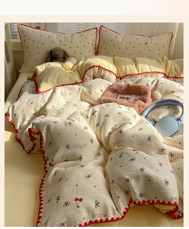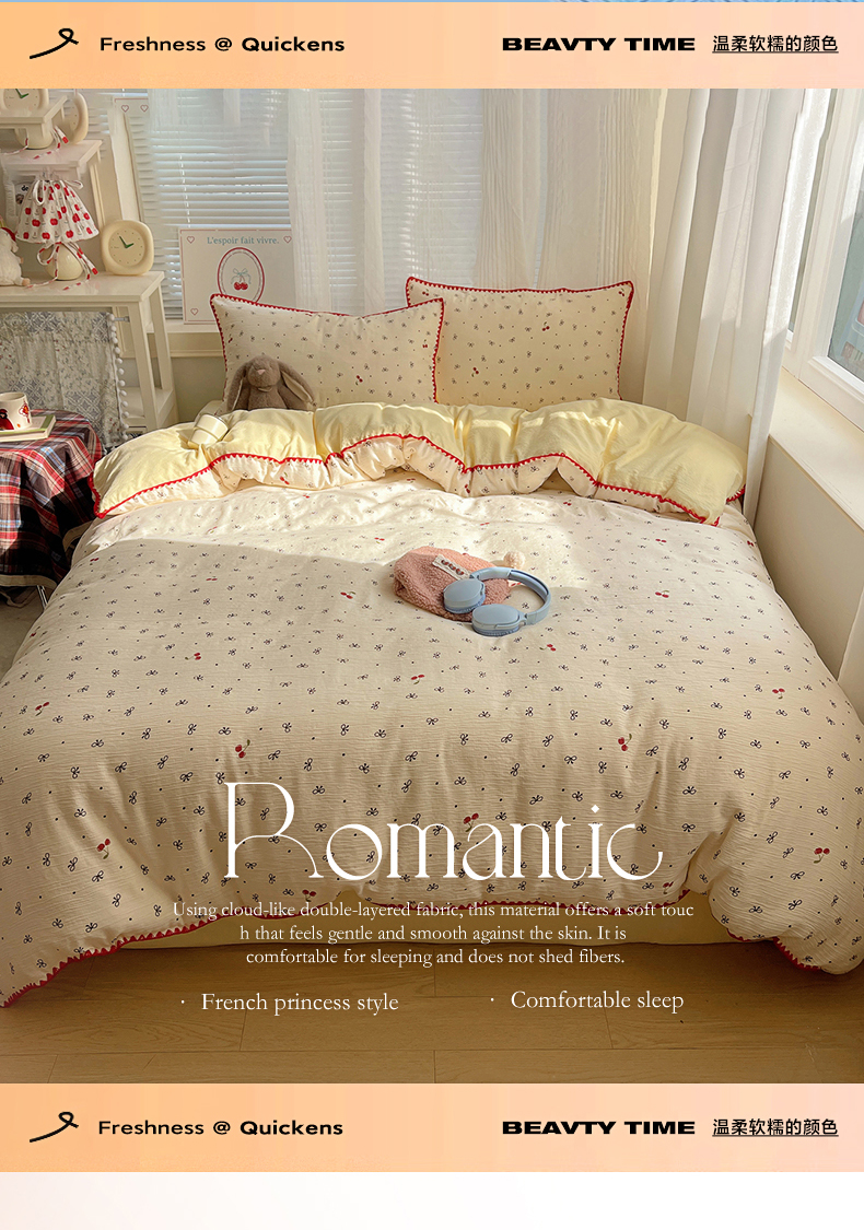 当前位置: 91家纺网 > 商品网购 > 床品套件 > 四件套 > 化纤普通四件套 > 顾里家纺 2026春夏新款ins韩风印花贝壳针双层纱四件套 小南瓜