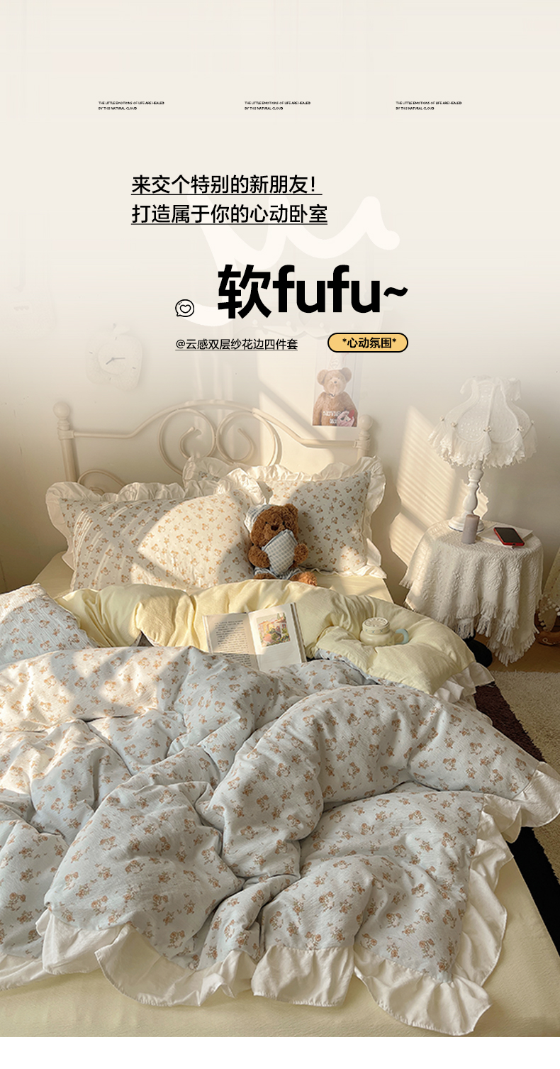 当前位置: 91家纺网 > 商品网购 > 床品套件 > 四件套 > 其它四件套 > 美乐迪家纺 2026新款云感双层纱花边四件套 粉色小花