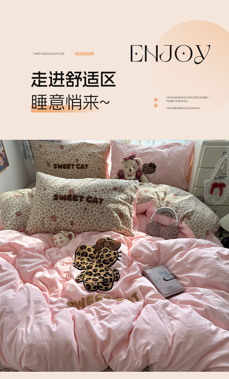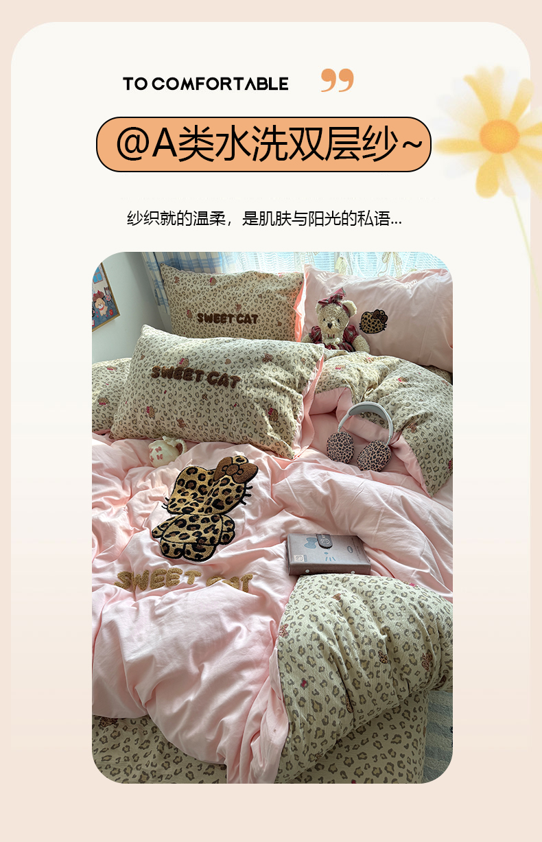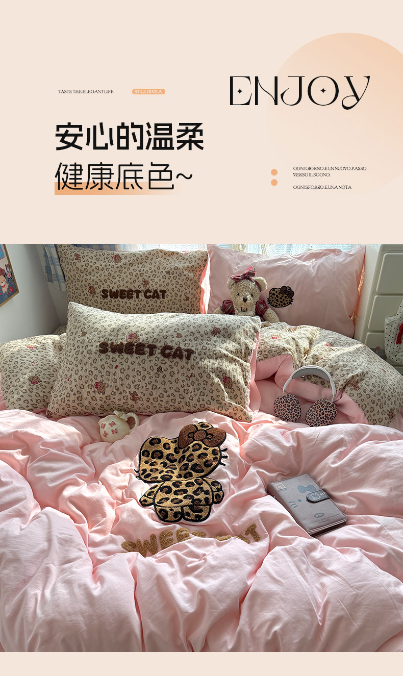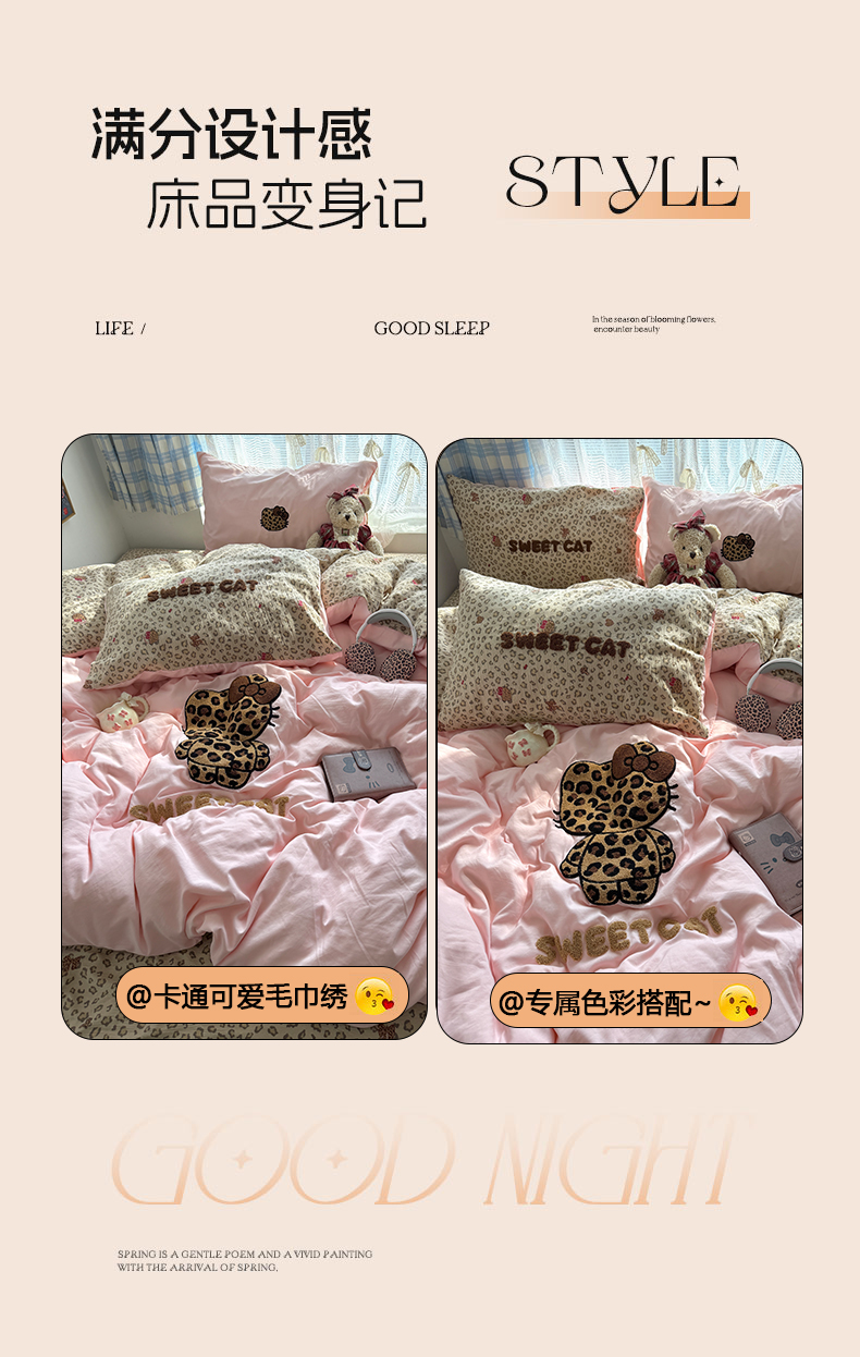 当前位置: 91家纺网 > 商品网购 > 床品套件 > 四件套 > 毛巾绣四件套 > 原素 2026新款新春卡哇伊毛巾绣四件套 豹纹背影猫