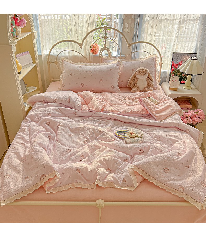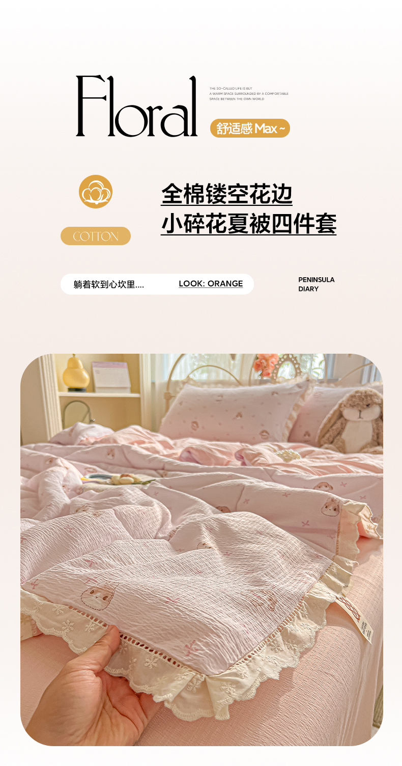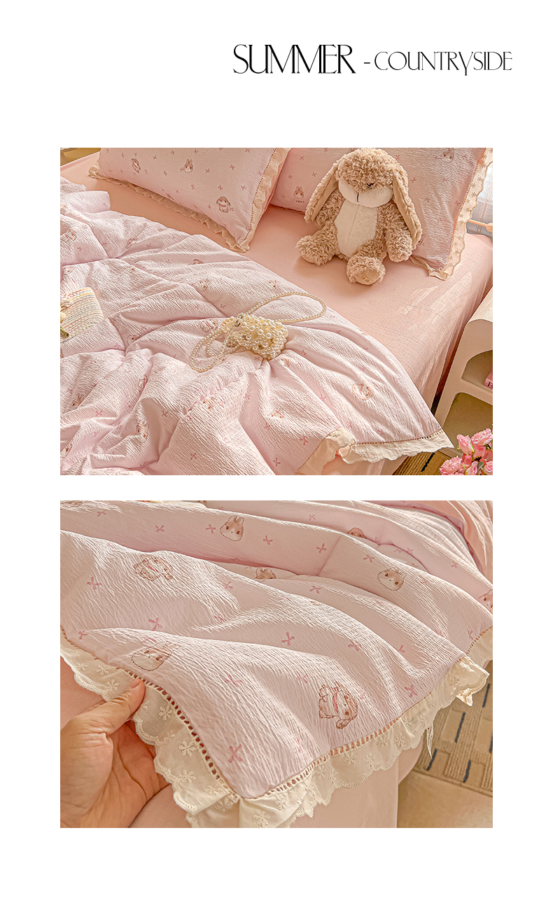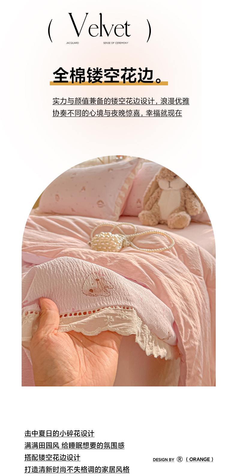 商品名称:罗亿家纺 2026新款全棉镂空花边云感双层纱夏被四件套 小粉兔