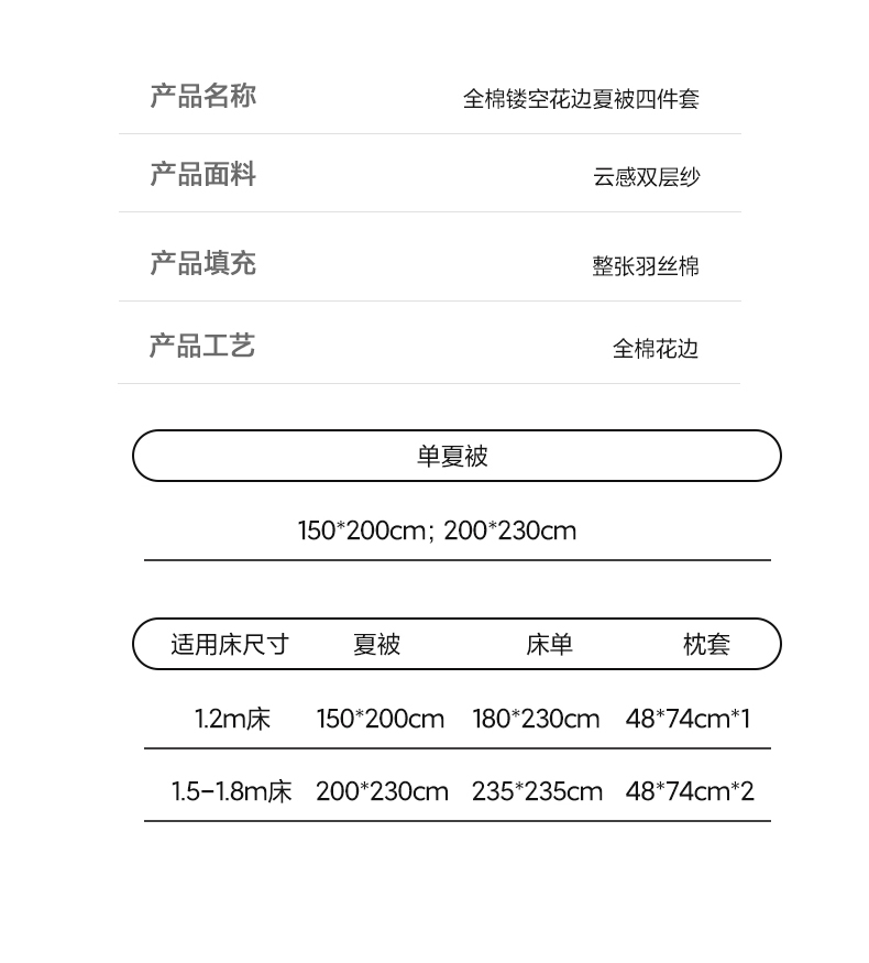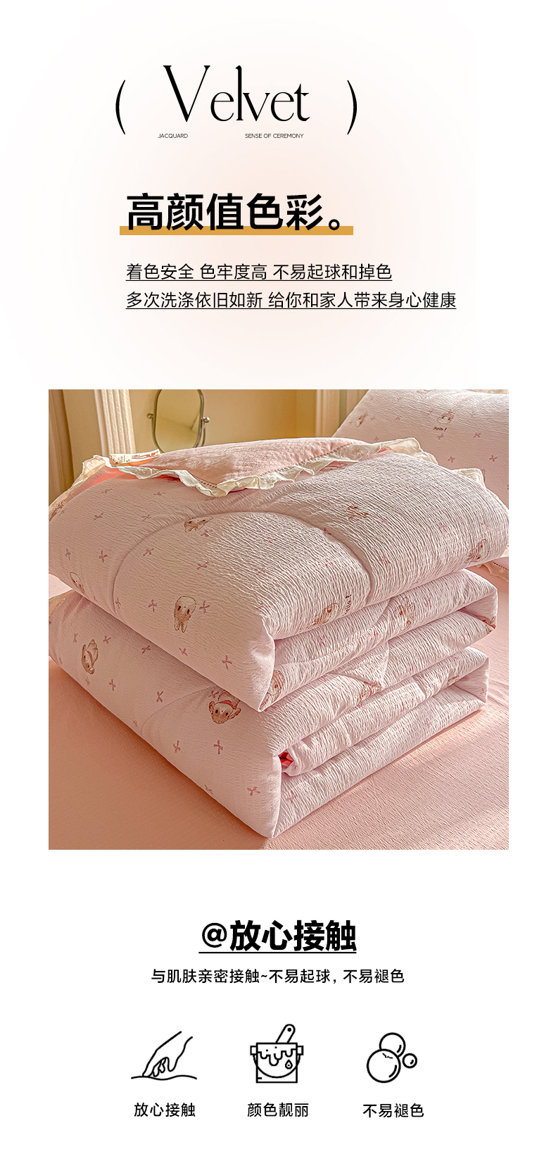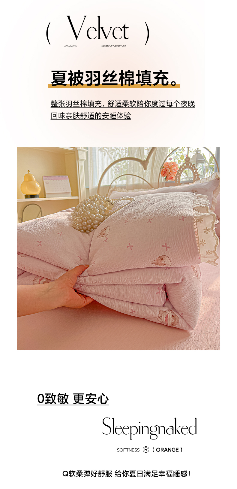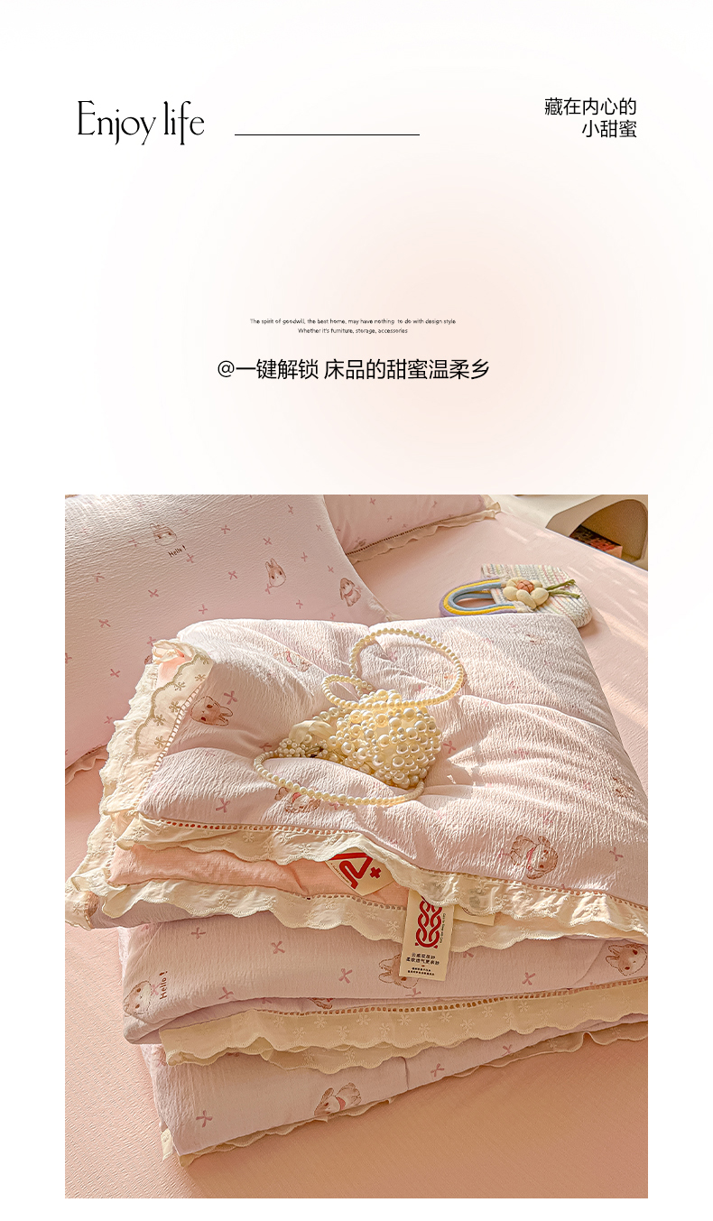 商品名称:罗亿家纺 2026新款全棉镂空花边云感双层纱夏被四件套 小粉兔