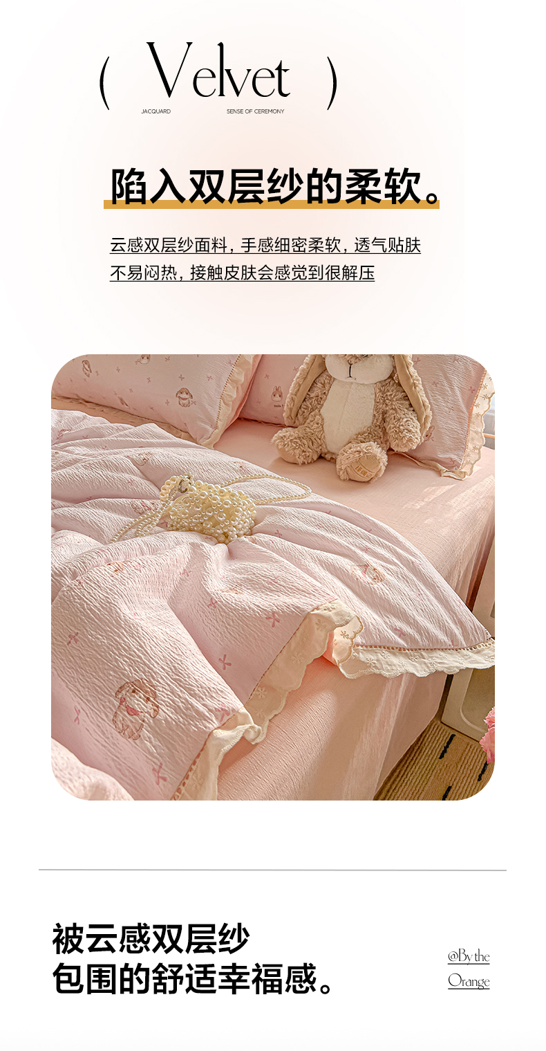 罗亿家纺 2026新款全棉镂空花边云感双层纱夏被四件套 小粉兔