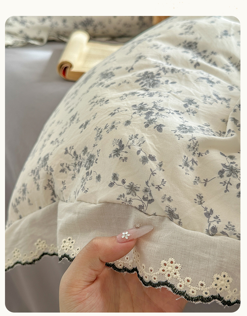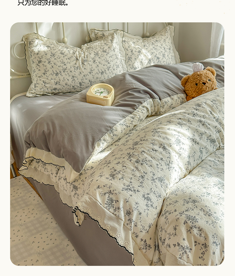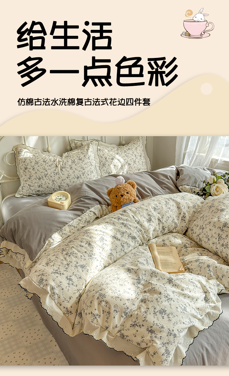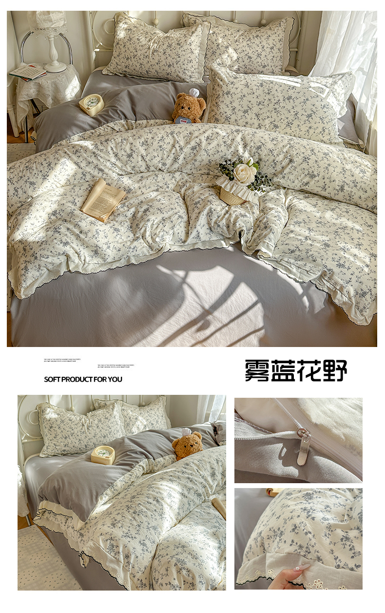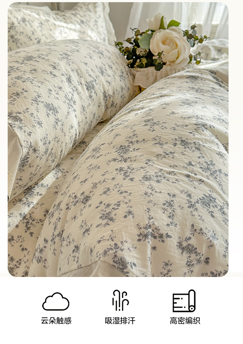 当前位置: 91家纺网 > 商品网购 > 床品套件 > 四件套 > 水洗棉四件套 > 晚爱家纺(原晚安家居) 2026春夏新款古法水洗棉复古法式花边四件套少女公主风 雾蓝花野