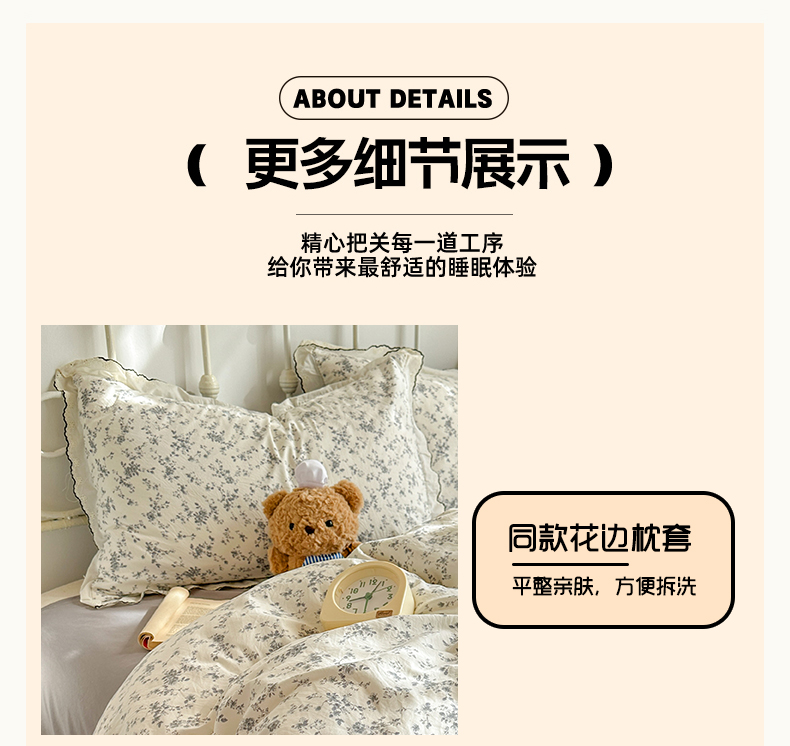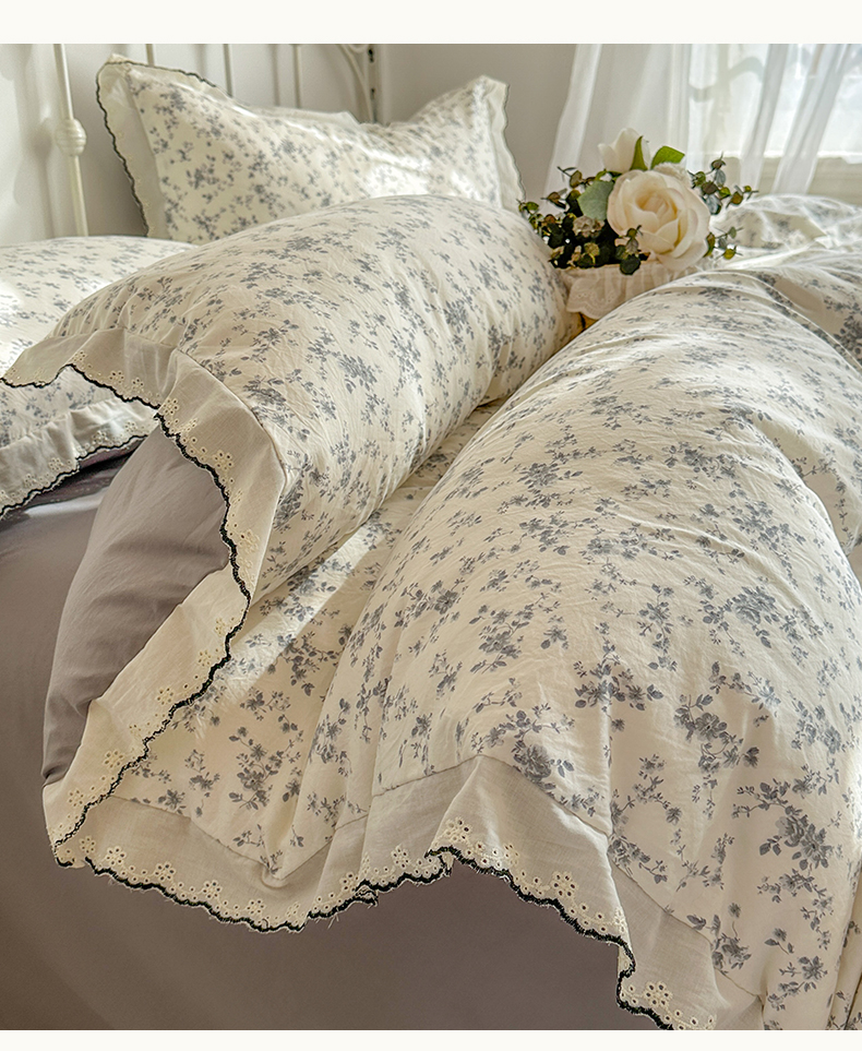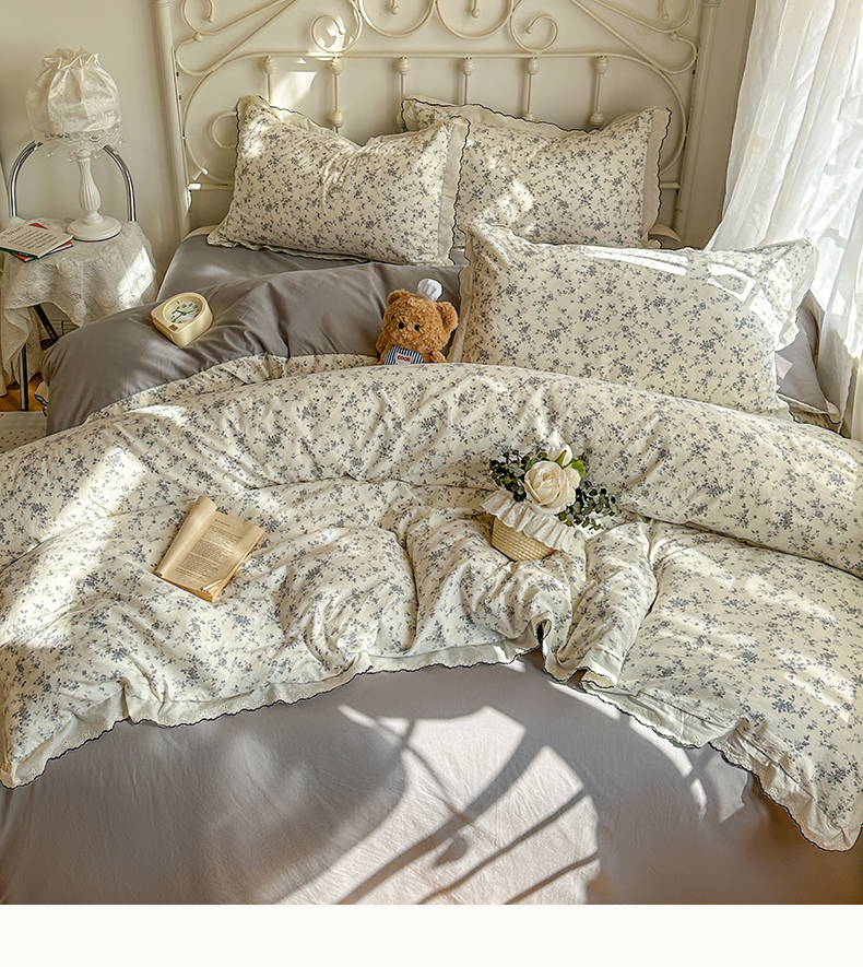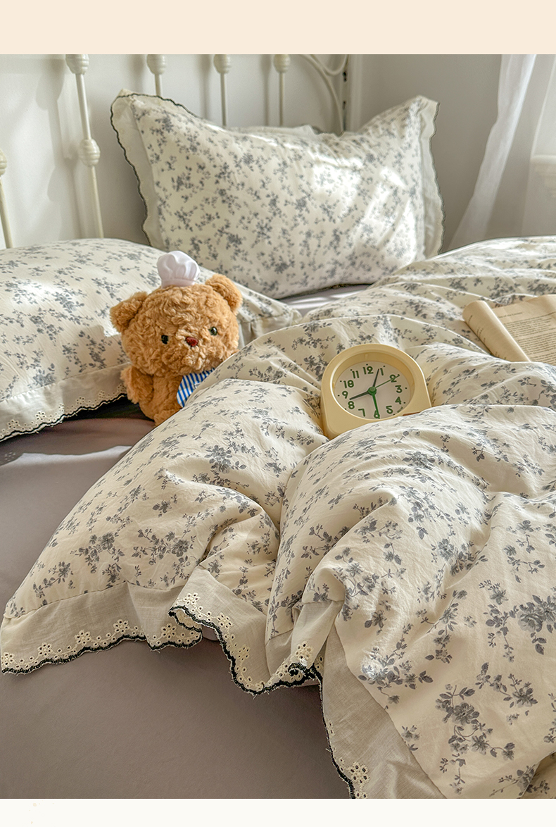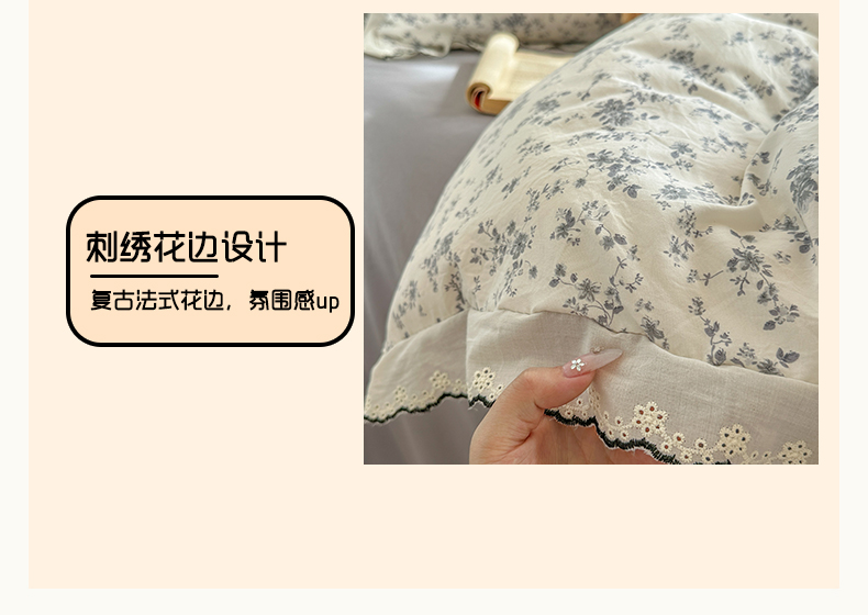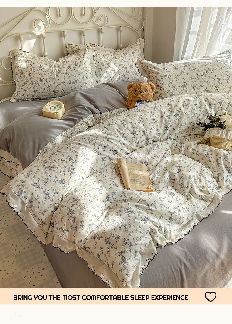 当前位置: 91家纺网 > 商品网购 > 床品套件 > 四件套 > 水洗棉四件套 > 晚爱家纺(原晚安家居) 2026春夏新款古法水洗棉复古法式花边四件套少女公主风 雾蓝花野