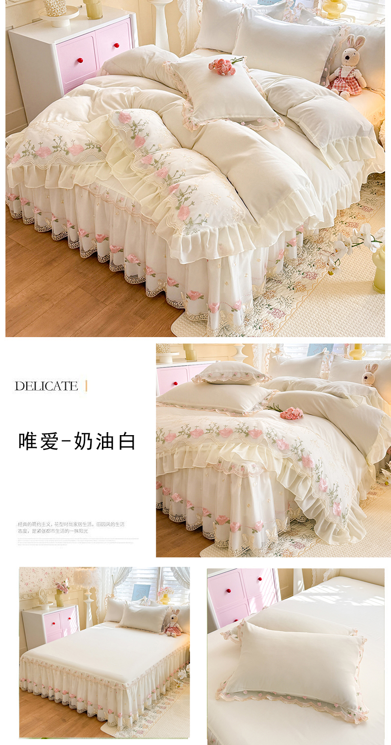 (总)漫布云 2026新款230g高克重韩版立体盘花牛奶蚕丝绒绣花四件套床裙款被套-洛丽塔系列,洛丽塔-嫩黄 ,洛丽塔-香芋紫 , 洛丽塔-珍珠粉,洛丽塔-婴儿蓝