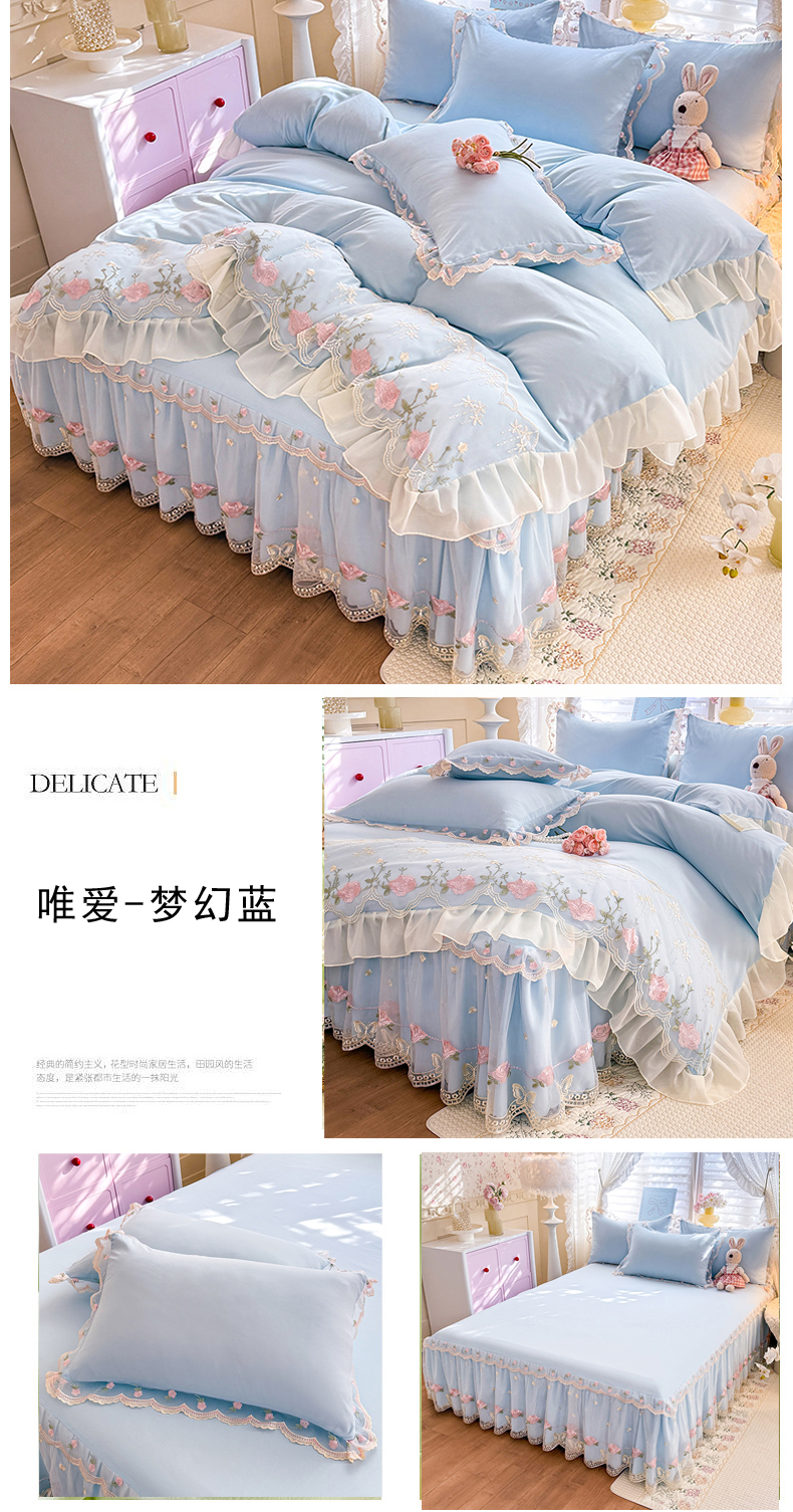 (总)漫布云 2026新款230g高克重韩版立体盘花牛奶蚕丝绒绣花四件套床裙款被套-洛丽塔系列,洛丽塔-嫩黄 ,洛丽塔-香芋紫,洛丽塔-珍珠粉, 洛丽塔-婴儿蓝