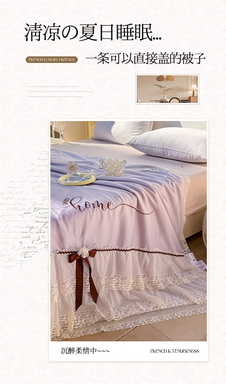 (总)优姿家纺 2026新款热款法式田园风花边天丝绣花夏被被子被芯,豆沙,粉玉,粉紫色,奶油米,天兰,紫色