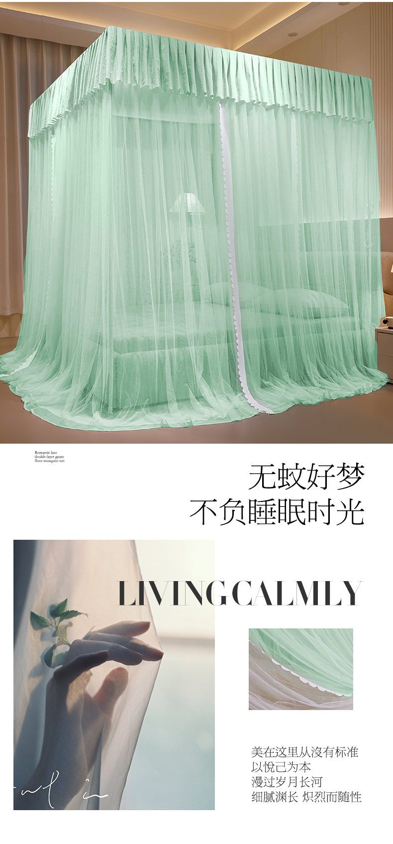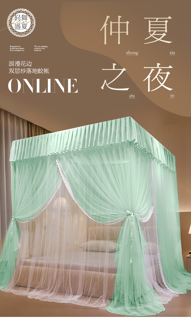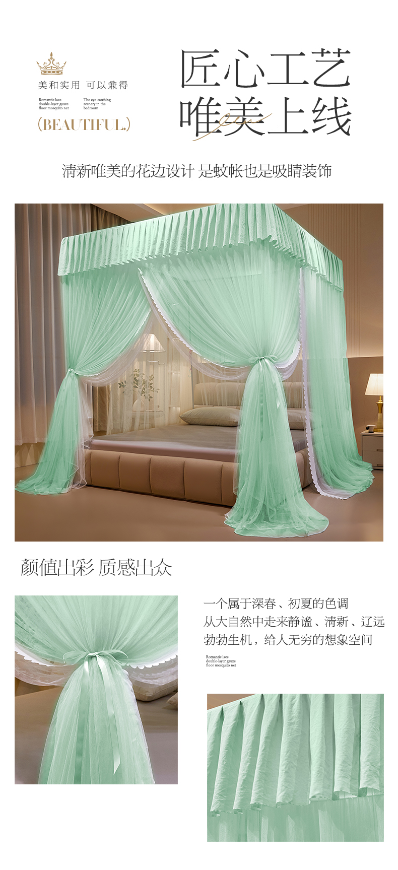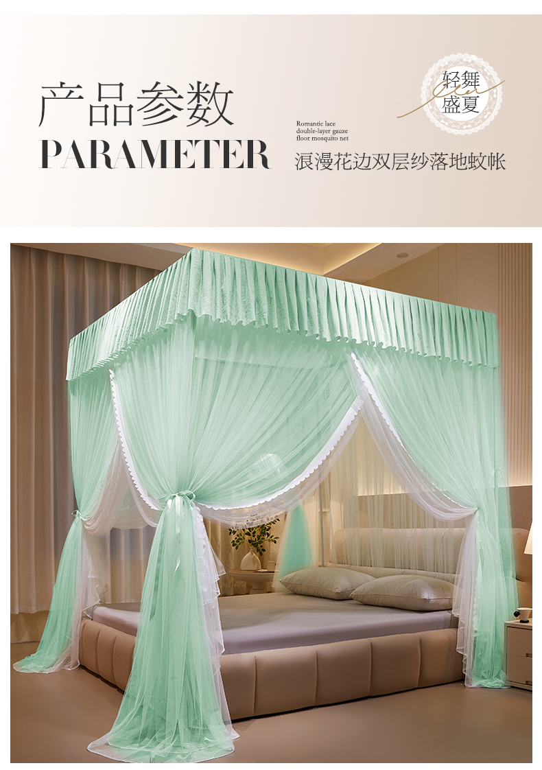 当前位置: 91家纺网 > 商品网购 > 床上用品 > 蚊帐 > 宫廷蚊帐 > 优雅星家纺 2026新款浪漫花边双层纱落地蚊帐-轻舞盛夏 轻舞盛夏 绿白