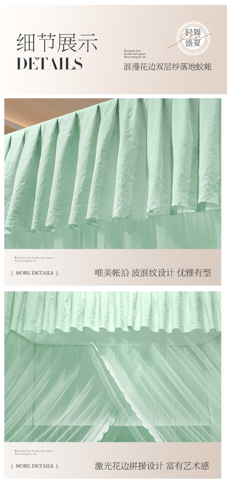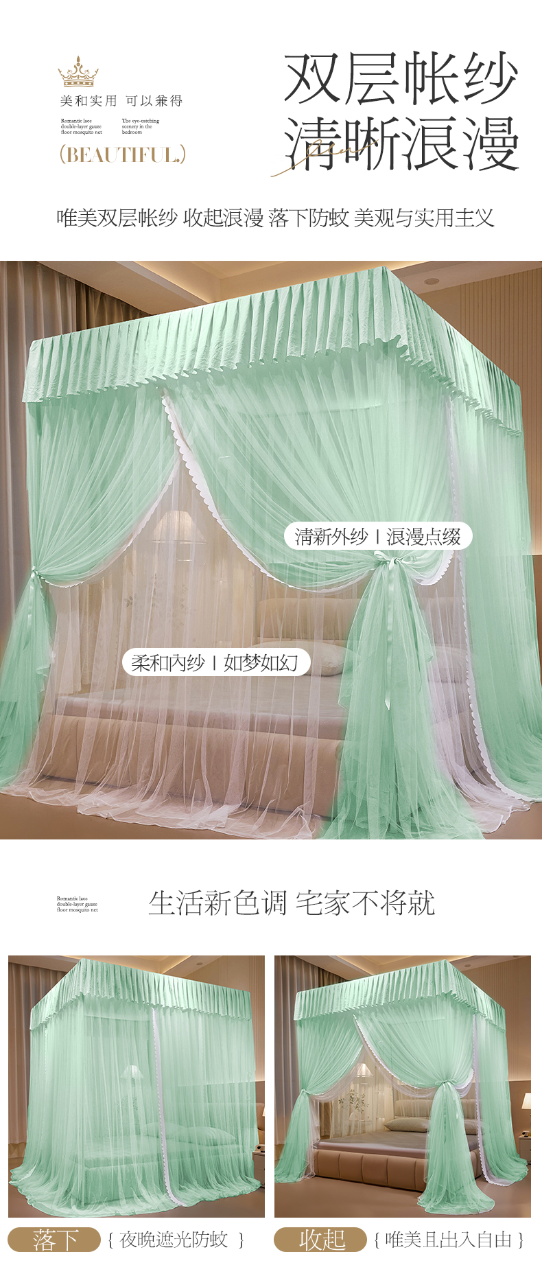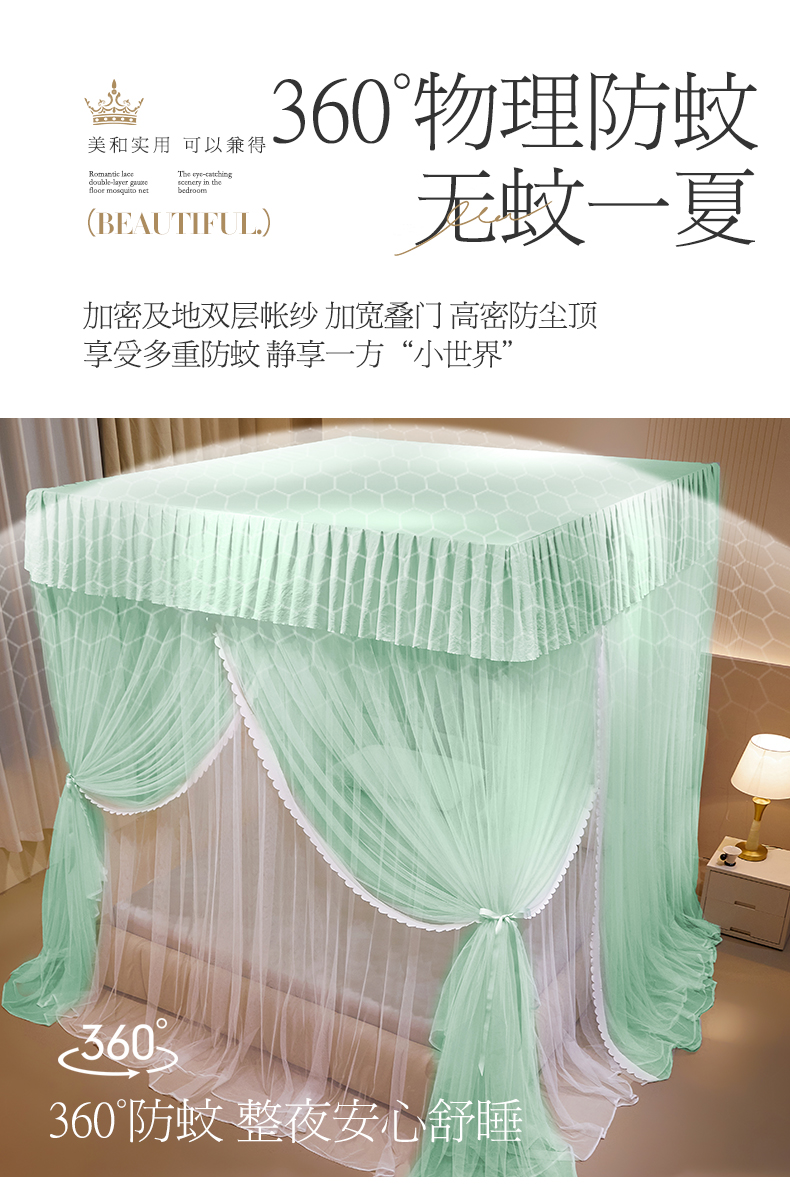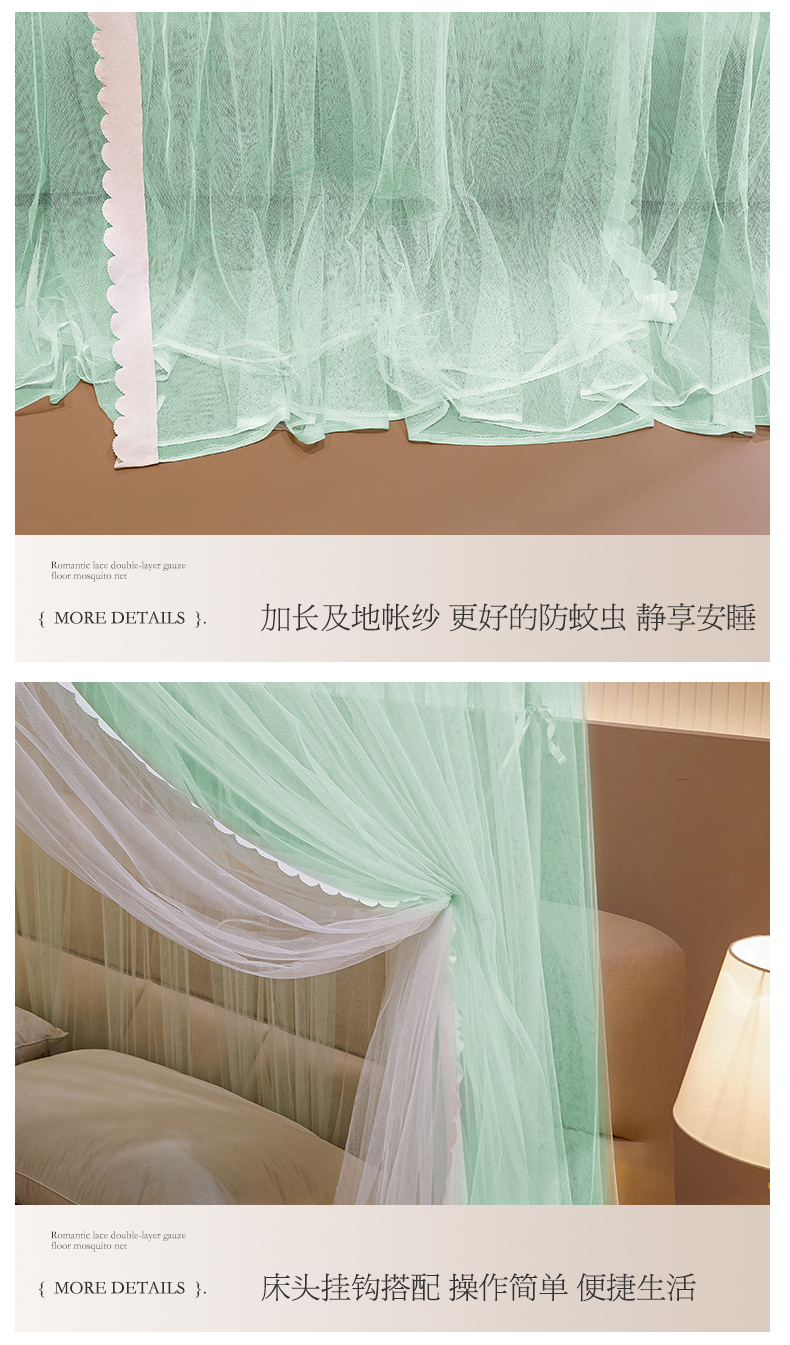 当前位置: 91家纺网 > 商品网购 > 床上用品 > 蚊帐 > 宫廷蚊帐 > 优雅星家纺 2026新款浪漫花边双层纱落地蚊帐-轻舞盛夏 轻舞盛夏 绿白
