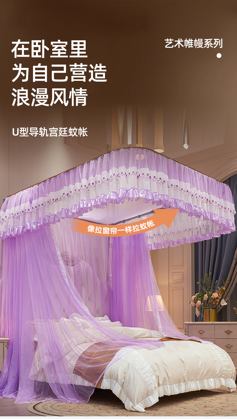 (总)舞夜盛世 2026新款u型拉幕导轨蚊帐轨道蚊帐落地宫廷蚊帐—春暖花开,春暖花开-粉色,春暖花开-黄色,春暖花开-水绿,春暖花开-玉色,春暖花开-紫色
