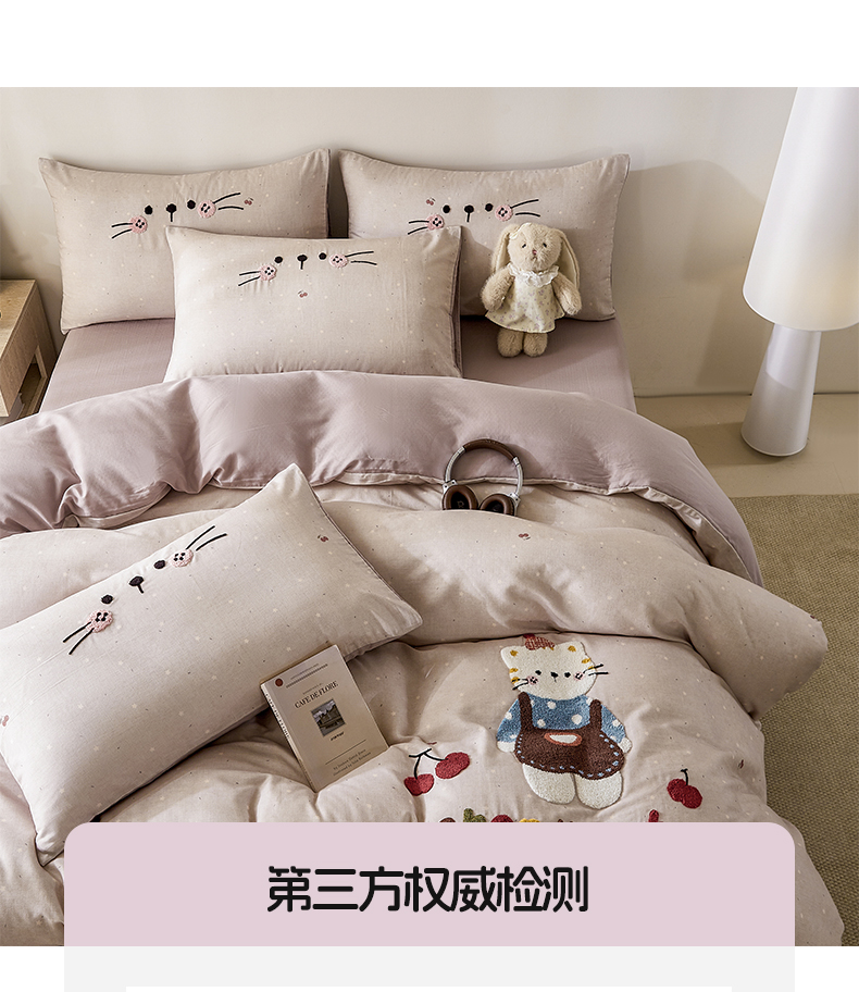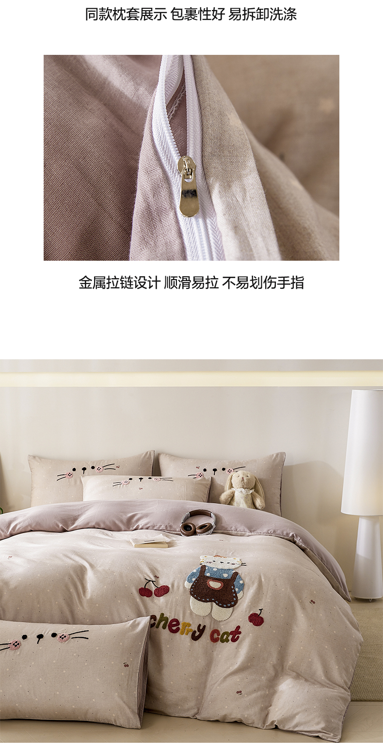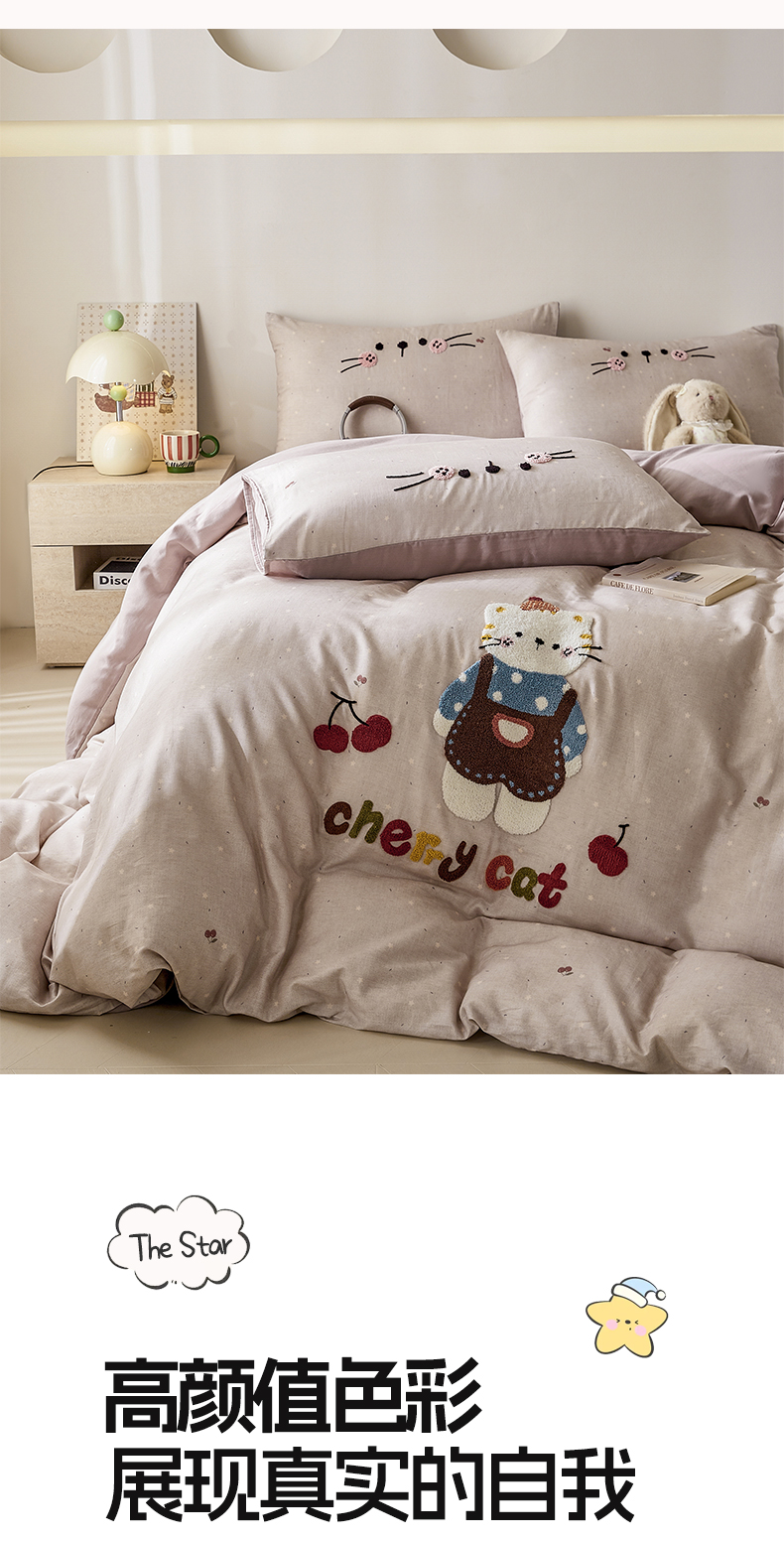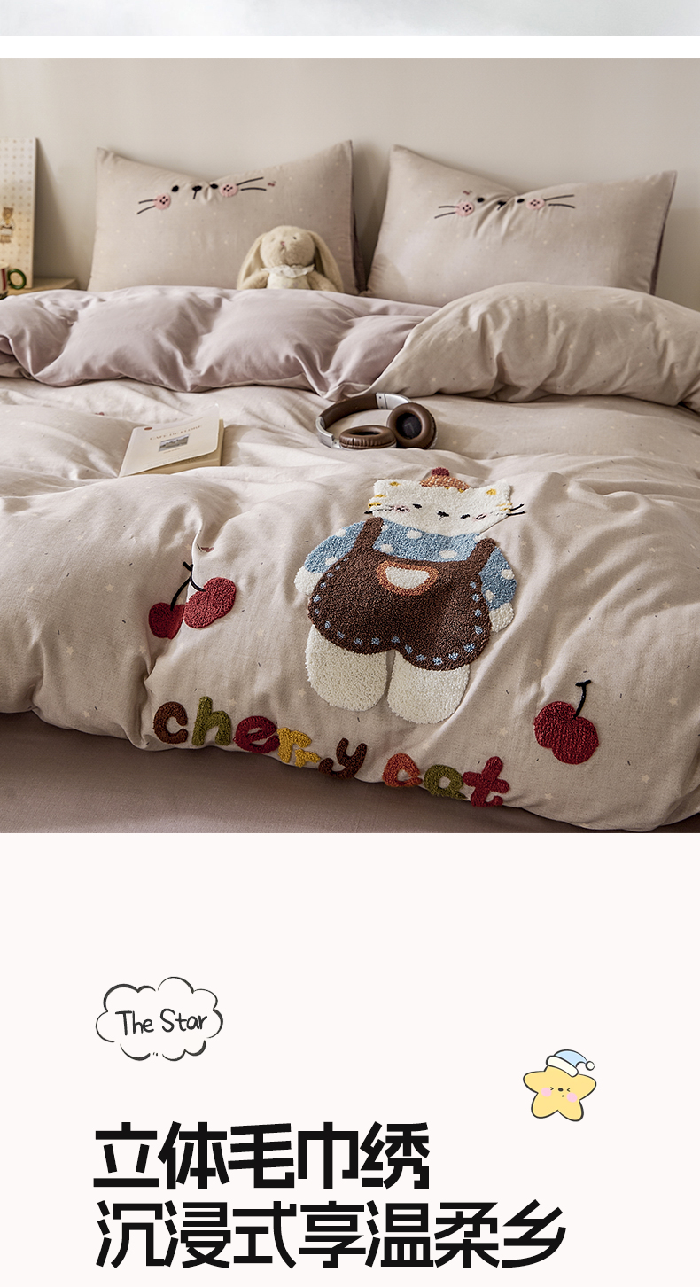 商品名称:麦田家纺 2026新款A类全棉双层纱毛巾绣四件套 樱桃猫咪