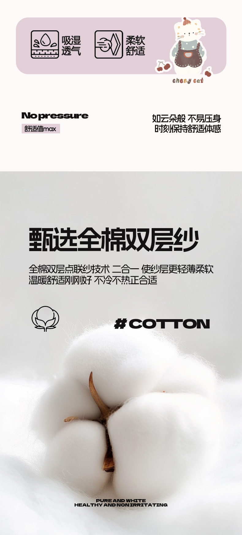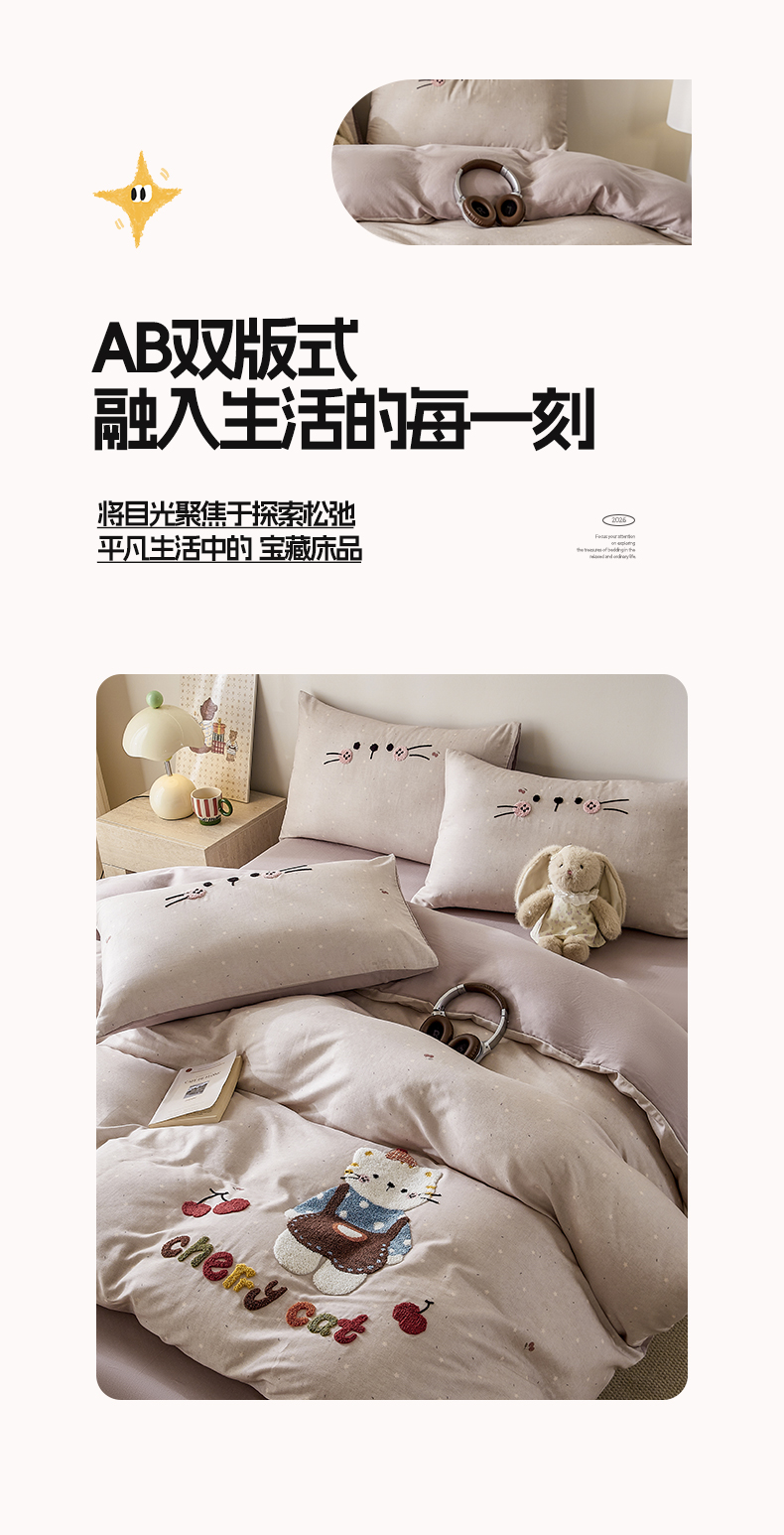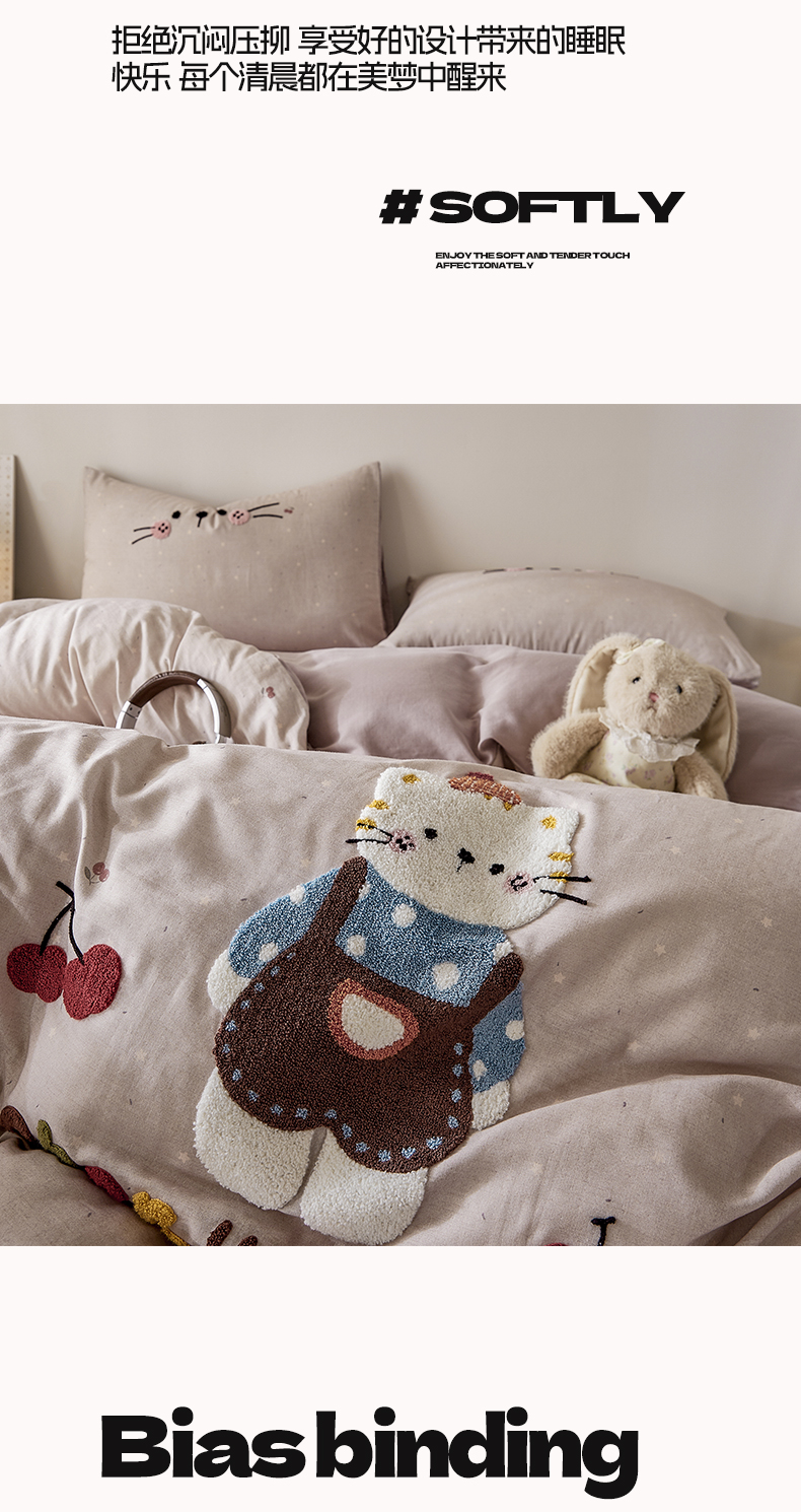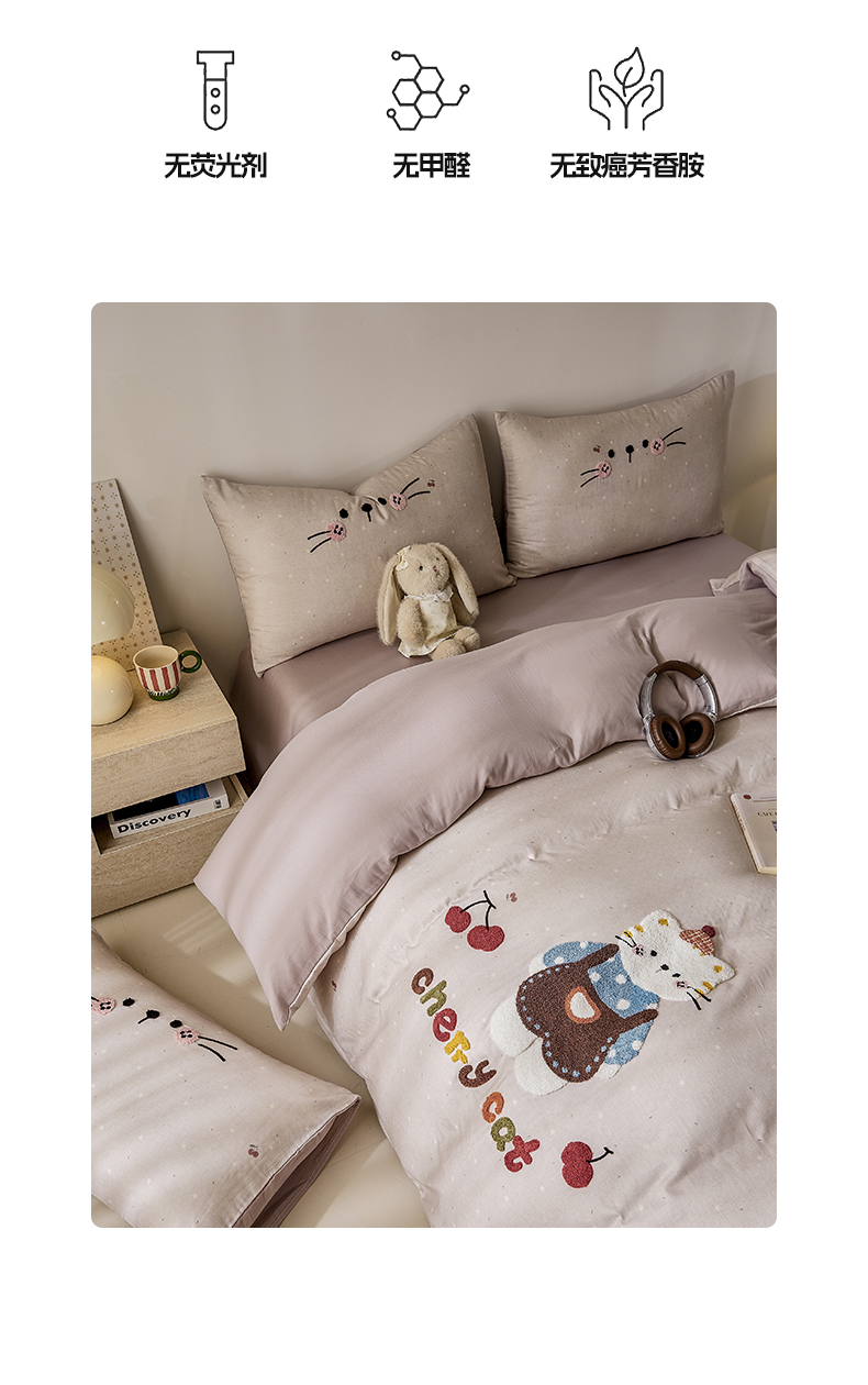 商品名称:麦田家纺 2026新款A类全棉双层纱毛巾绣四件套 樱桃猫咪
