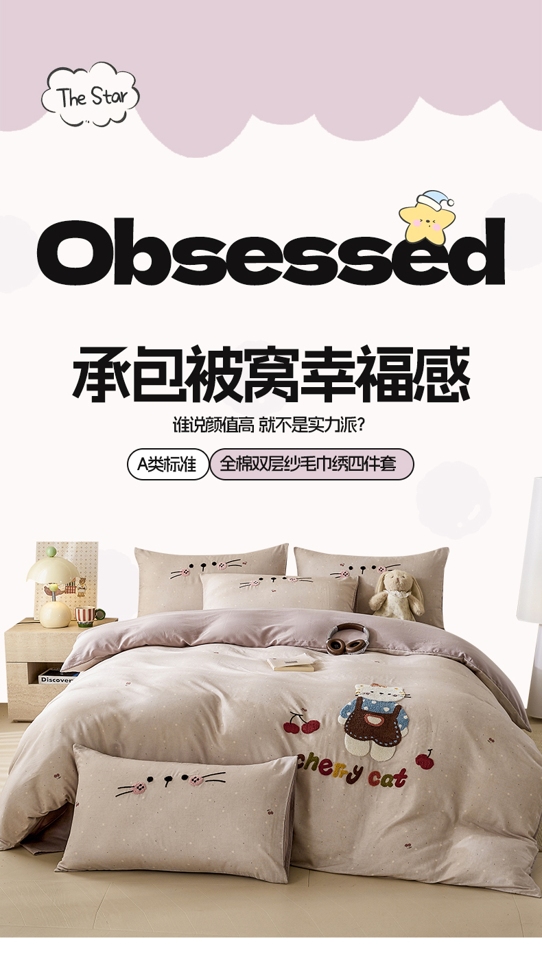 麦田家纺 2026新款A类全棉双层纱毛巾绣四件套 樱桃猫咪