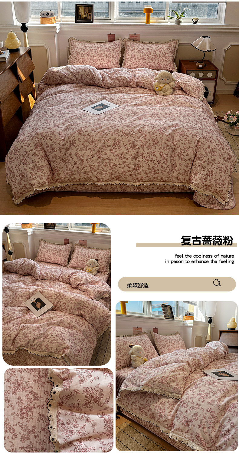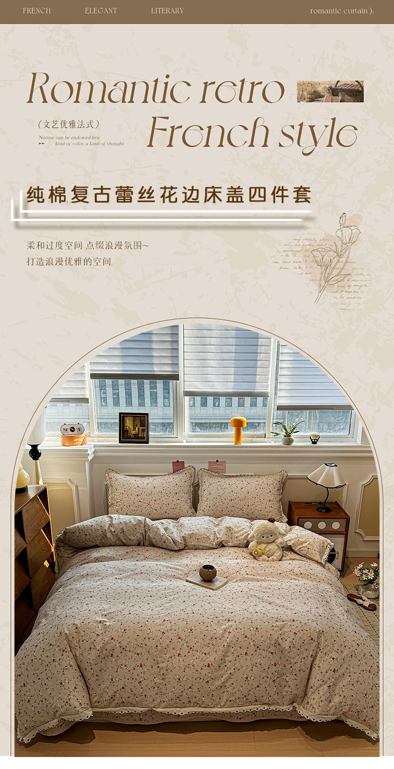 (总)橙子家居 2026新款纯棉法式复古蕾丝花边床盖四件套,复古蔷薇粉,花町,花影,墨影,普罗旺斯,枝蔓-浅灰,枝蔓-浅蓝