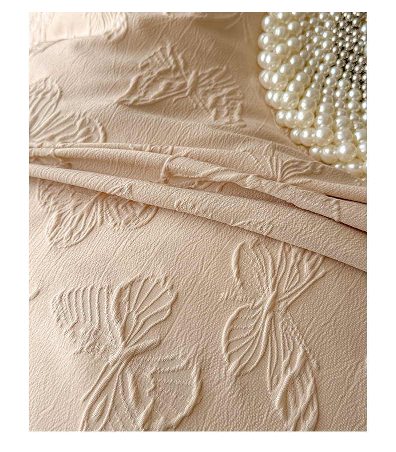 (总)迪梦姿家纺 2026新款梦蝶真丝提花夏被四件套,米驼色,奶白色,浅豆沙,青灰色,天空兰