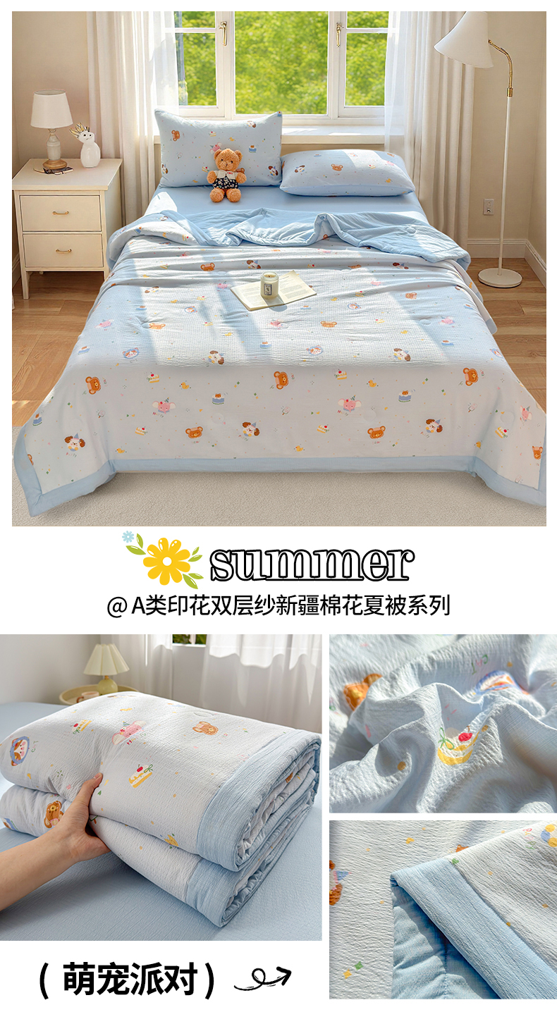 • 91家纺网 家纺一手货源 找家纺 晓时候 2026新款双层纱印花夏被床盖四件套新疆棉花被夏凉被空调被单夏被 萌宠派对