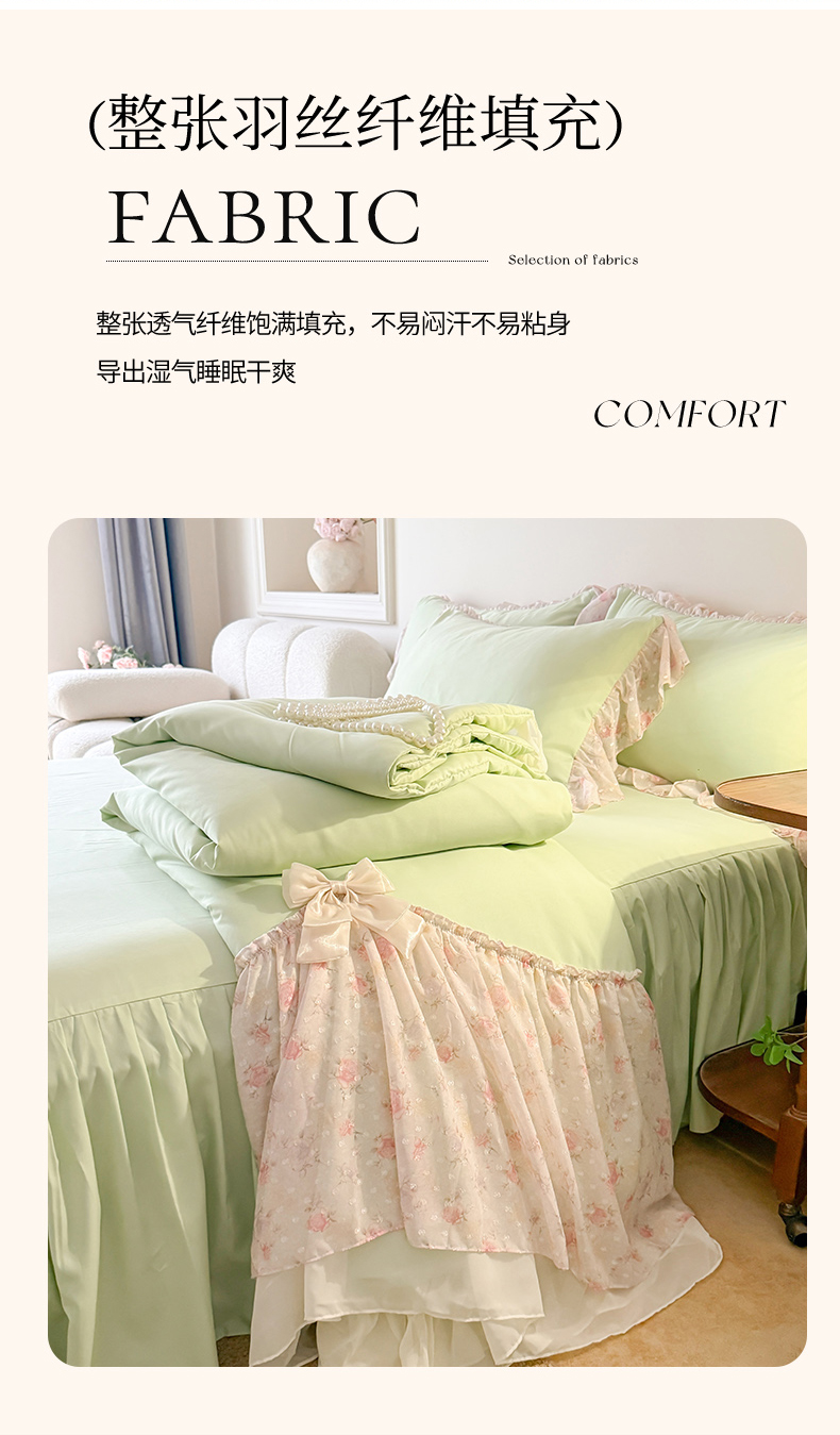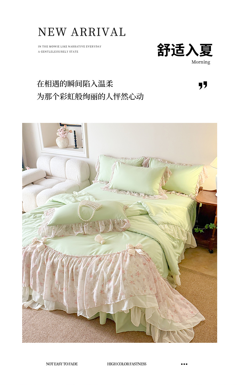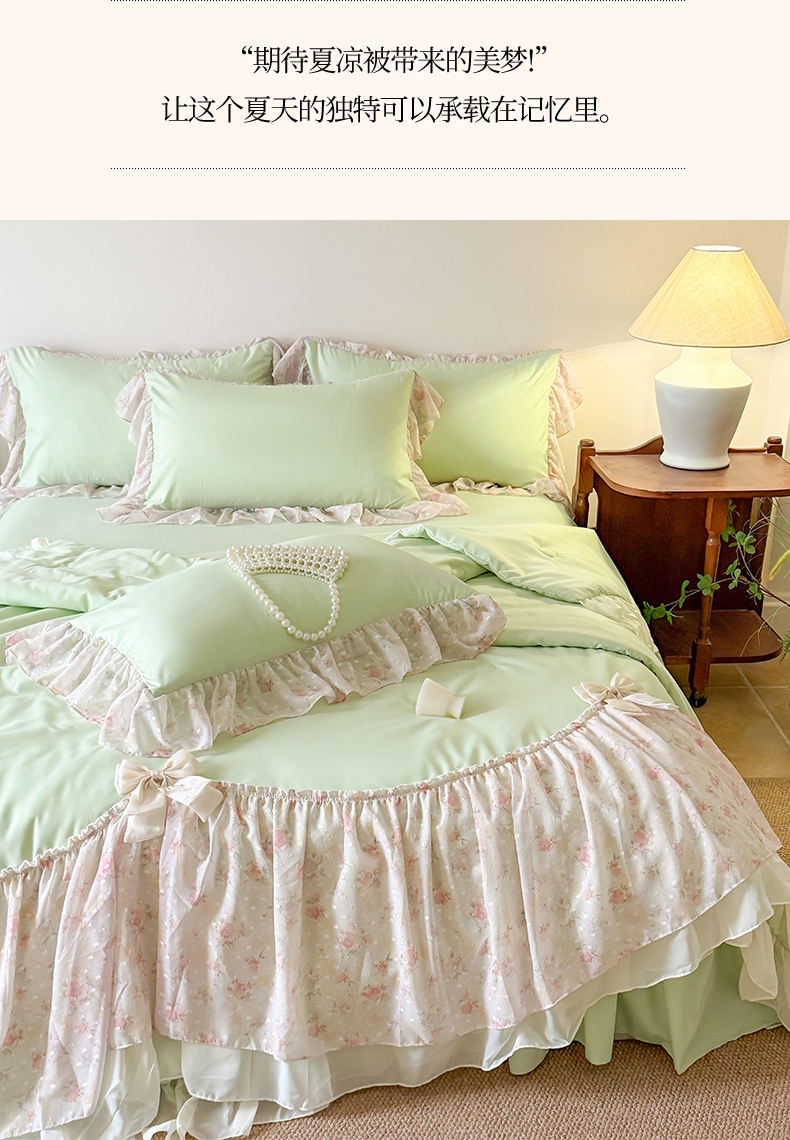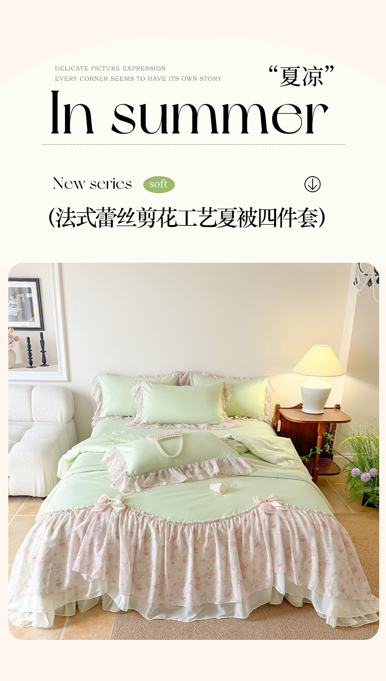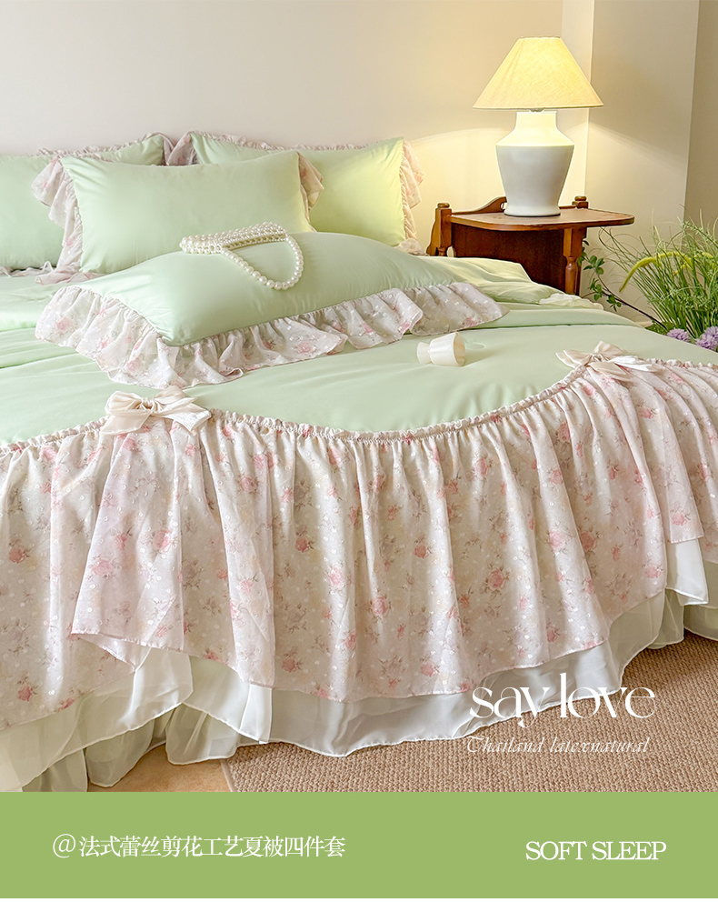 • 91家纺网 家纺一手货源 找家纺 富盛家纺 2026新款雪纺蕾丝刺绣法式床裙韩版夏凉被空调被夏被四件套 夏被四件套—浪漫主义(绿)
