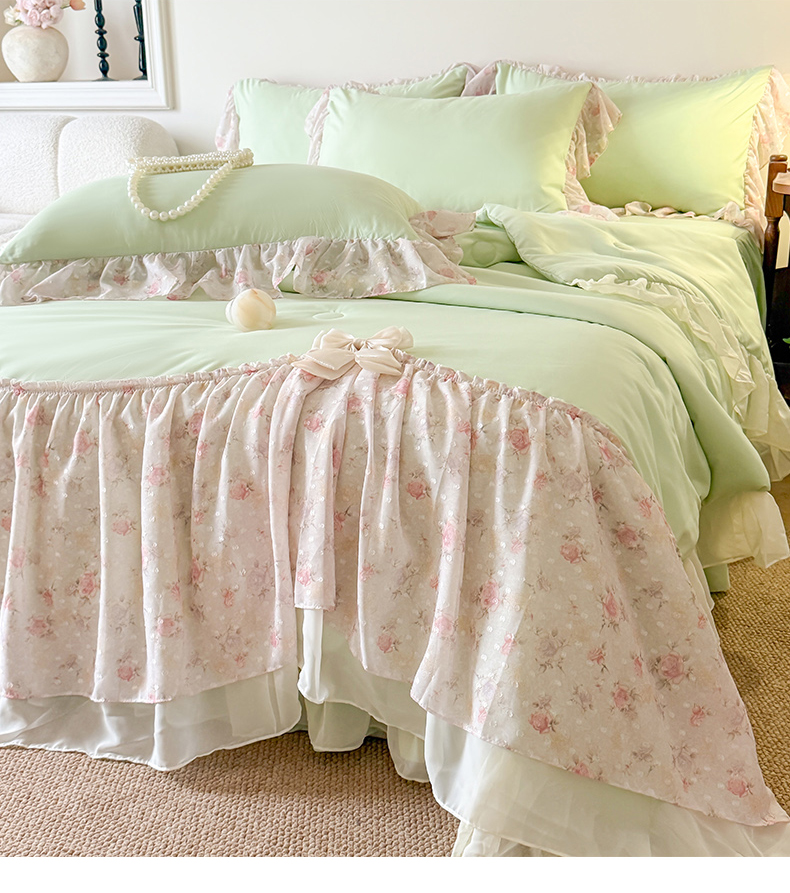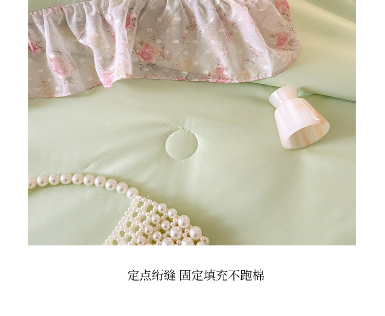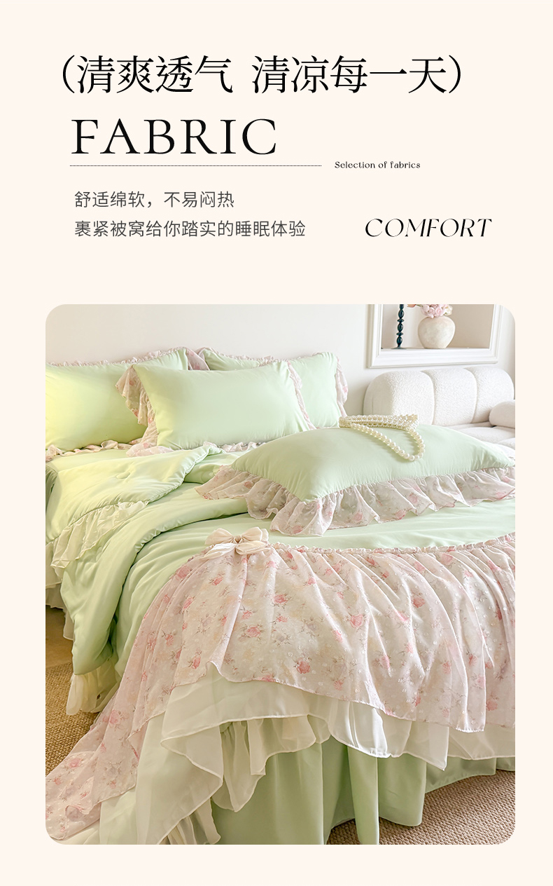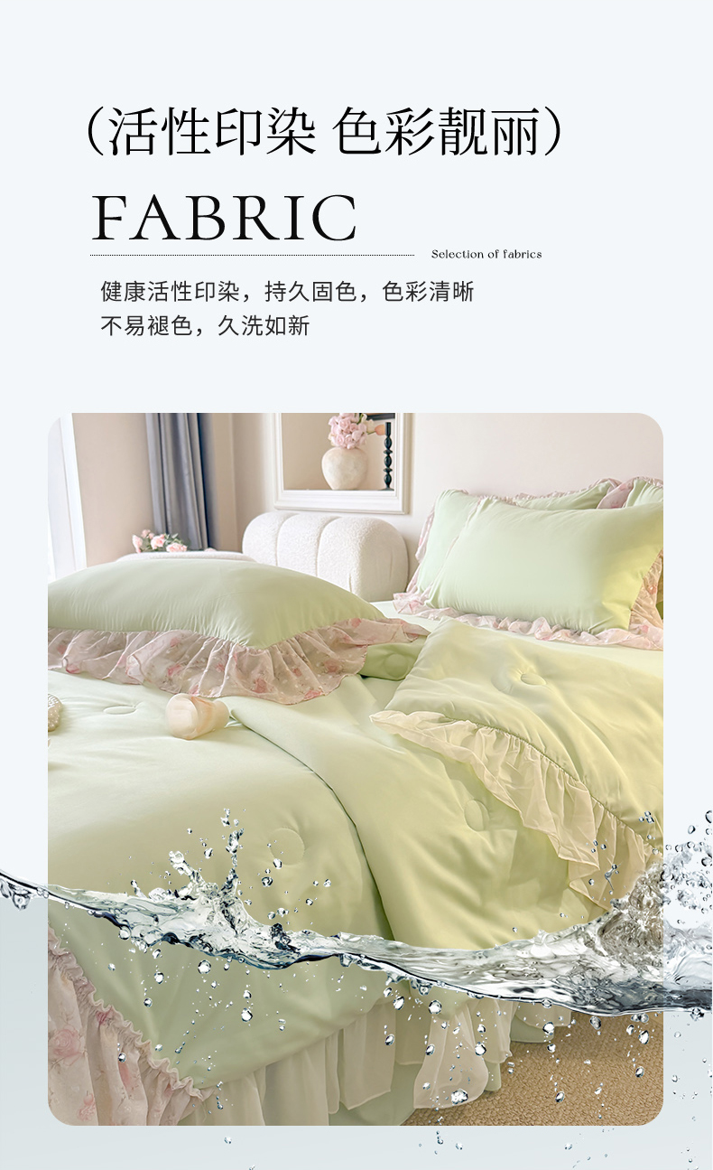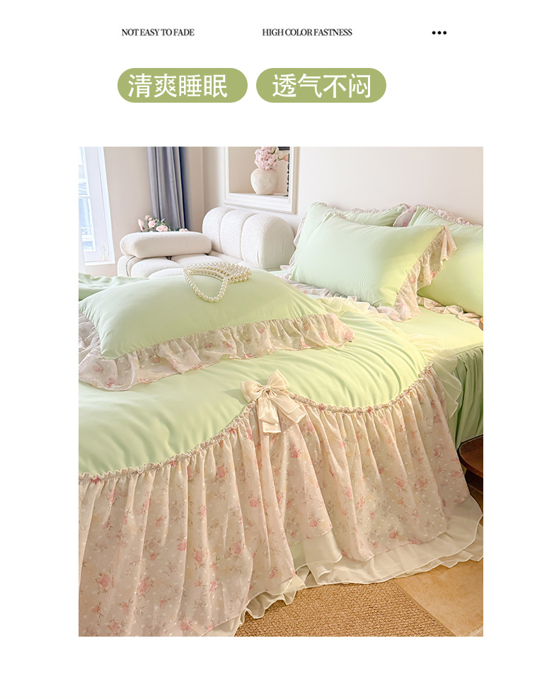 • 91家纺网 家纺一手货源 找家纺 富盛家纺 2026新款雪纺蕾丝刺绣法式床裙韩版夏凉被空调被夏被四件套 夏被四件套—浪漫主义(绿)