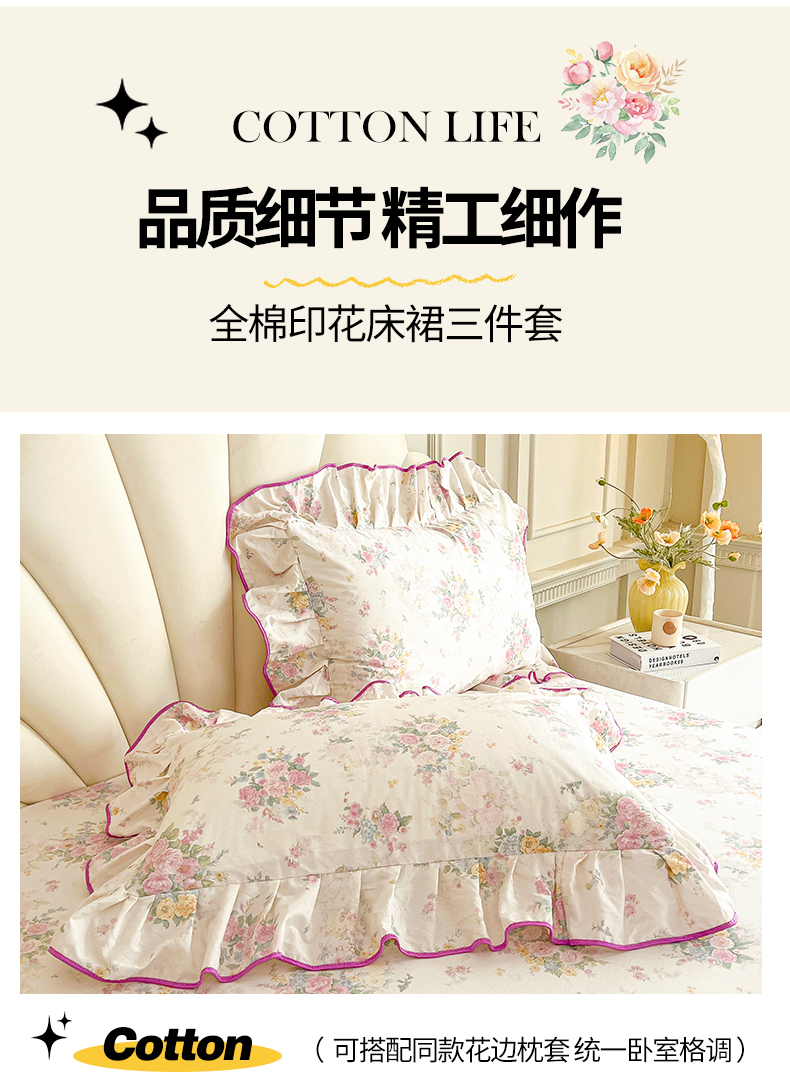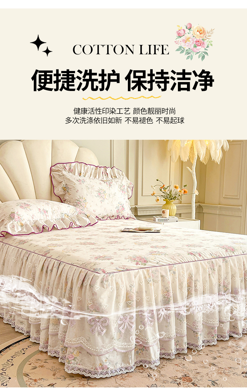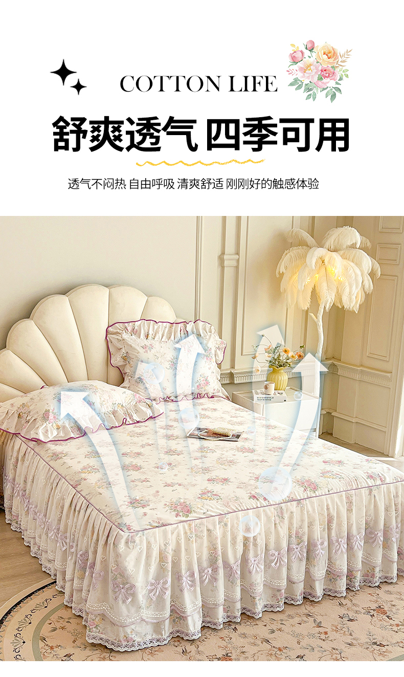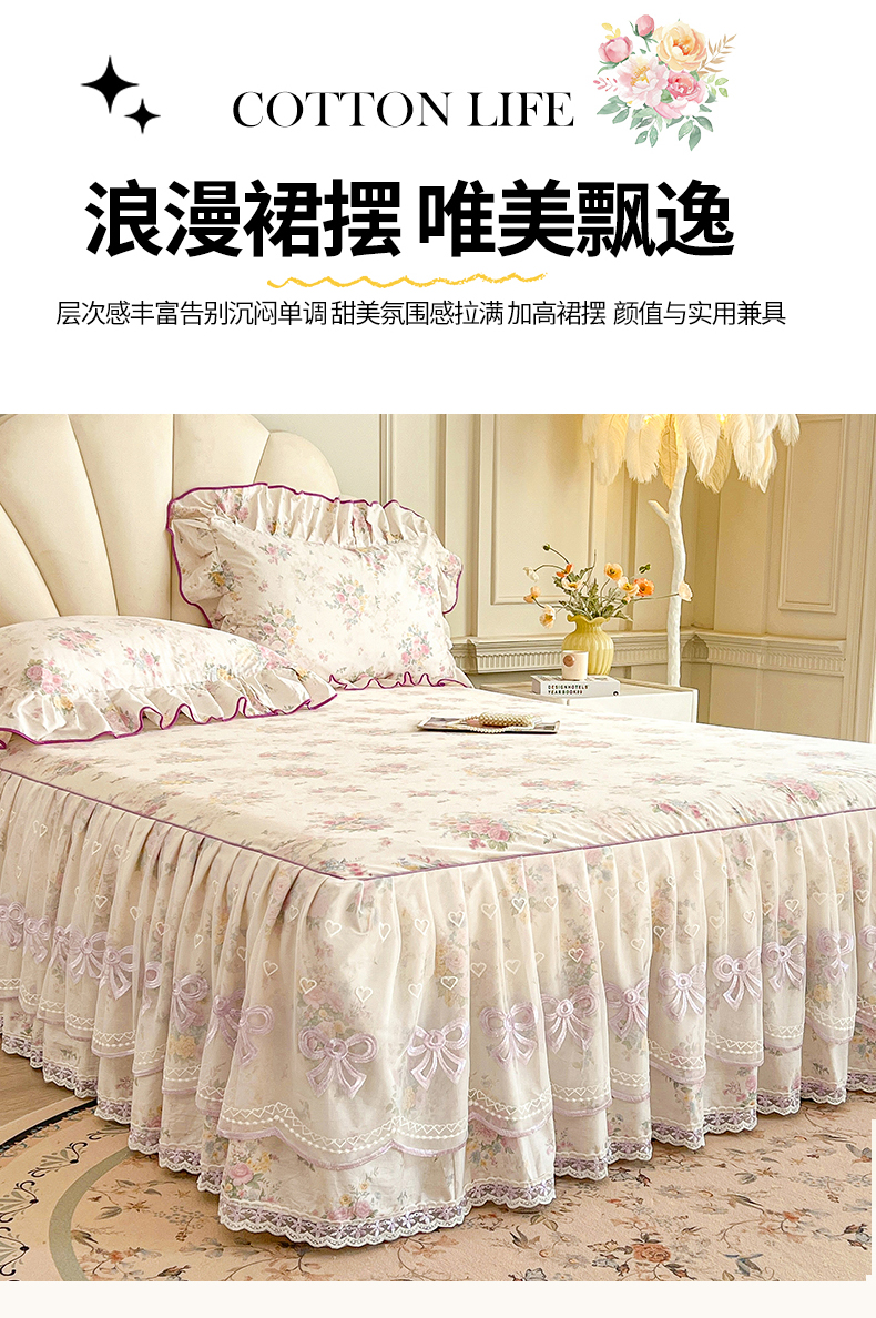 (总)宜凡家纺 2026新款全棉公主风单层床裙三件套,海棠之恋,镜花映月,水苏栀清,玉容昭婉