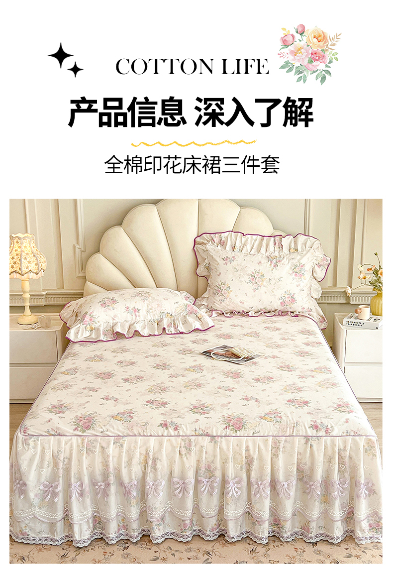 (总)宜凡家纺 2026新款全棉印花公主风夹棉床裙三件套,海棠之恋,镜花映月,水苏栀清,玉容昭婉