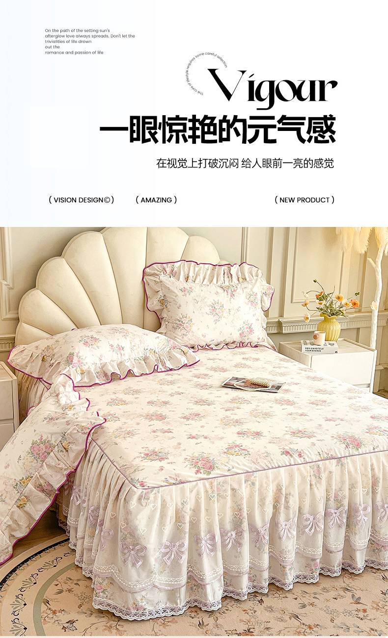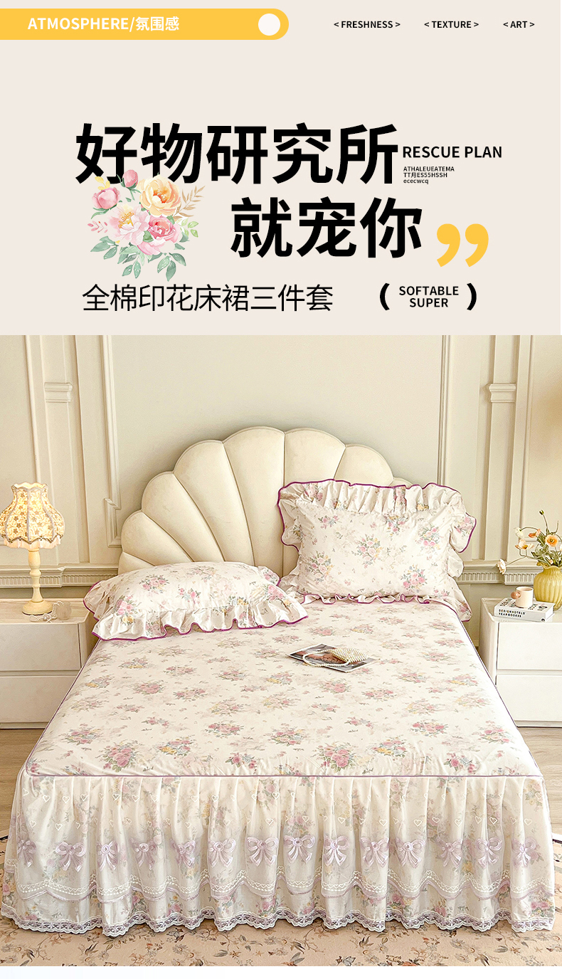 • 91家纺网 家纺一手货源 找家纺 (总)宜凡家纺 2026新款全棉印花公主风夹棉床裙三件套,海棠之恋,镜花映月,水苏栀清,玉容昭婉