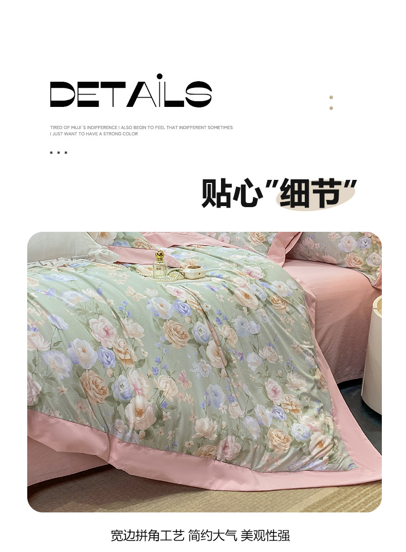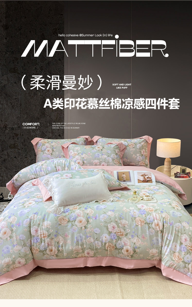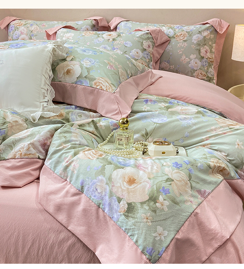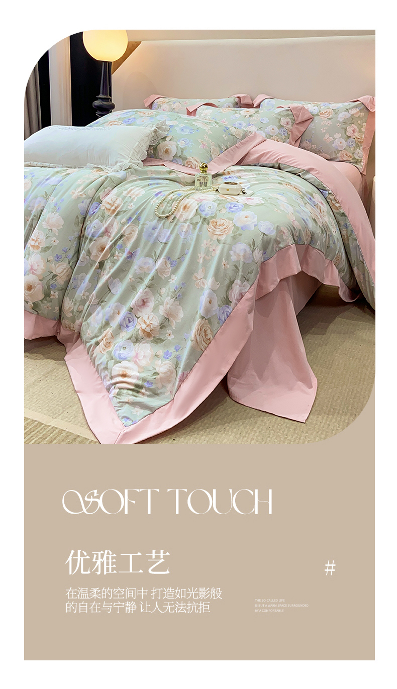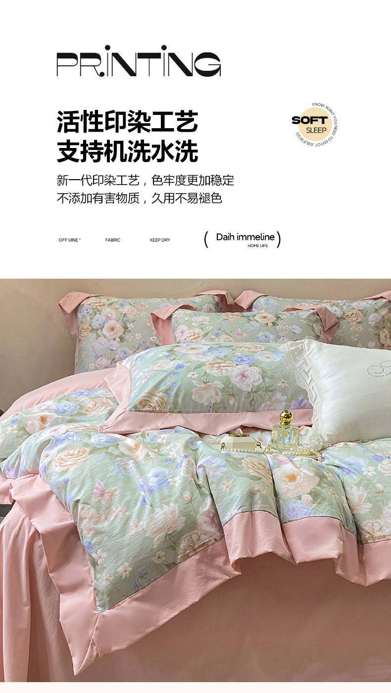当前位置: 91家纺网 > 商品网购 > 床品套件 > 四件套 > 其它四件套 > 慕木家纺 2026新款A类印花拼角工艺慕斯棉四件套系列(抽空压缩可供跨境)提供买家秀 青妍+粉