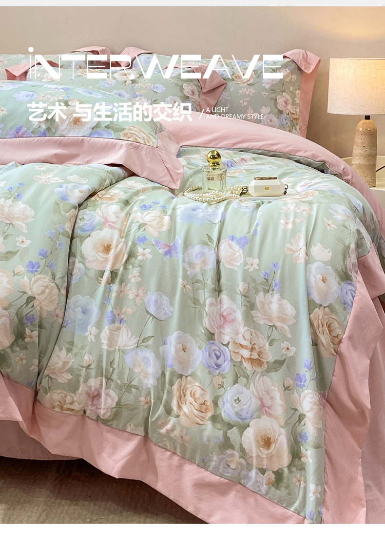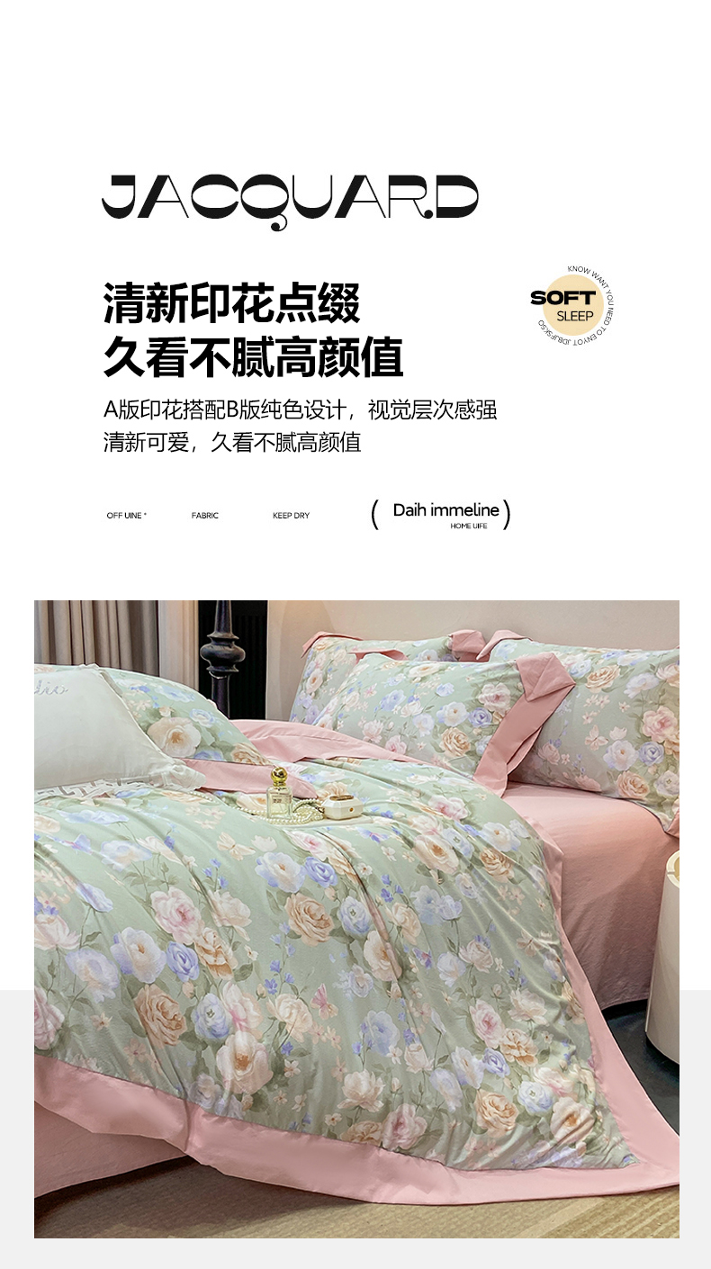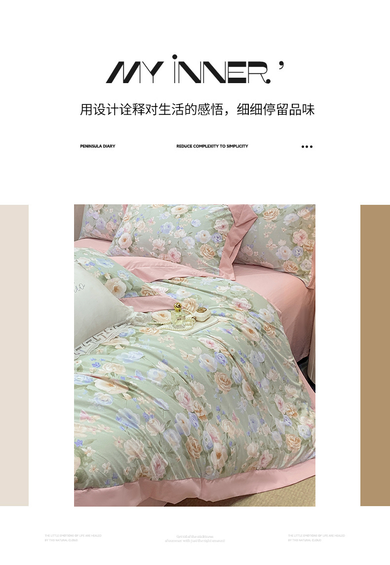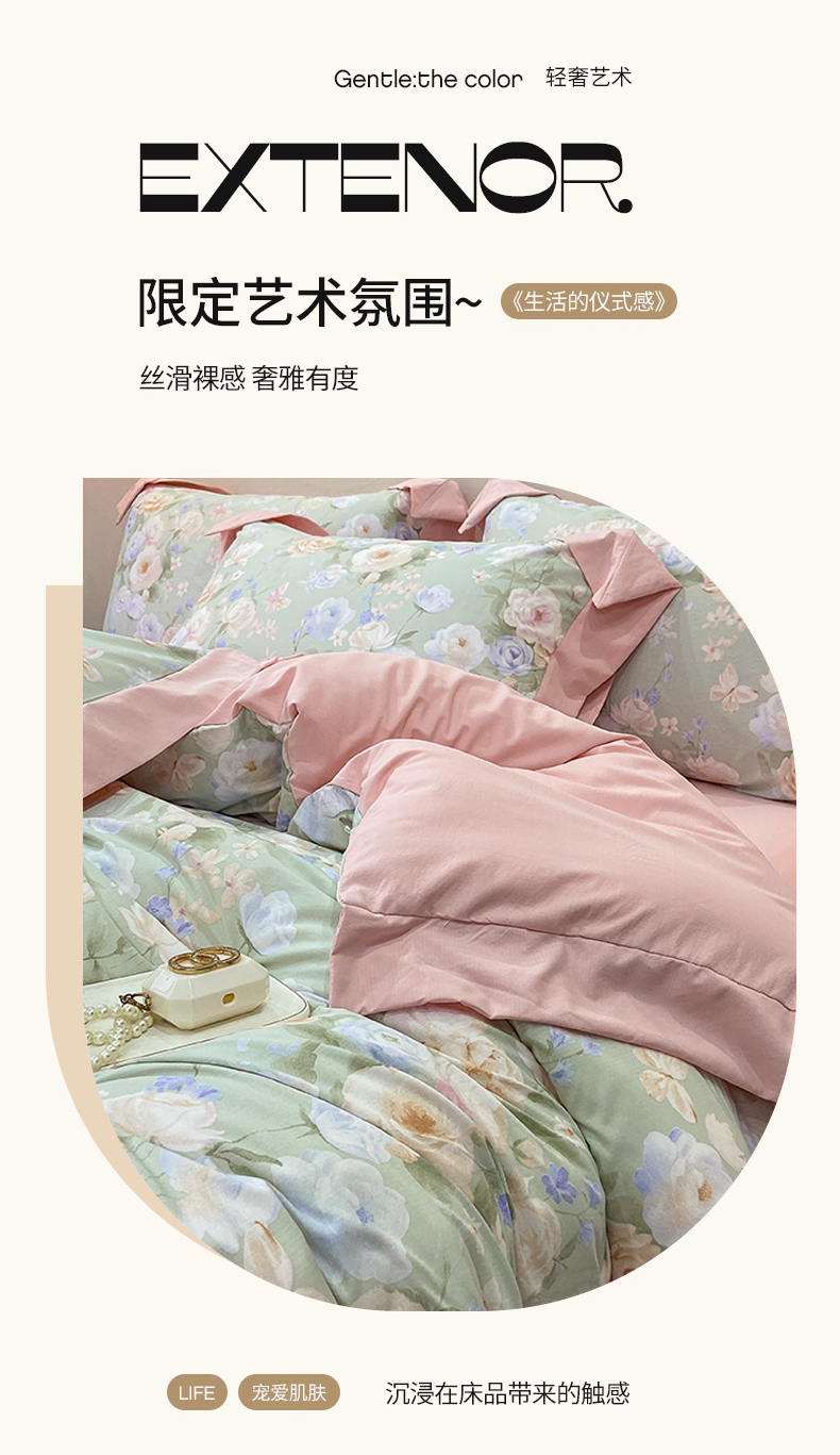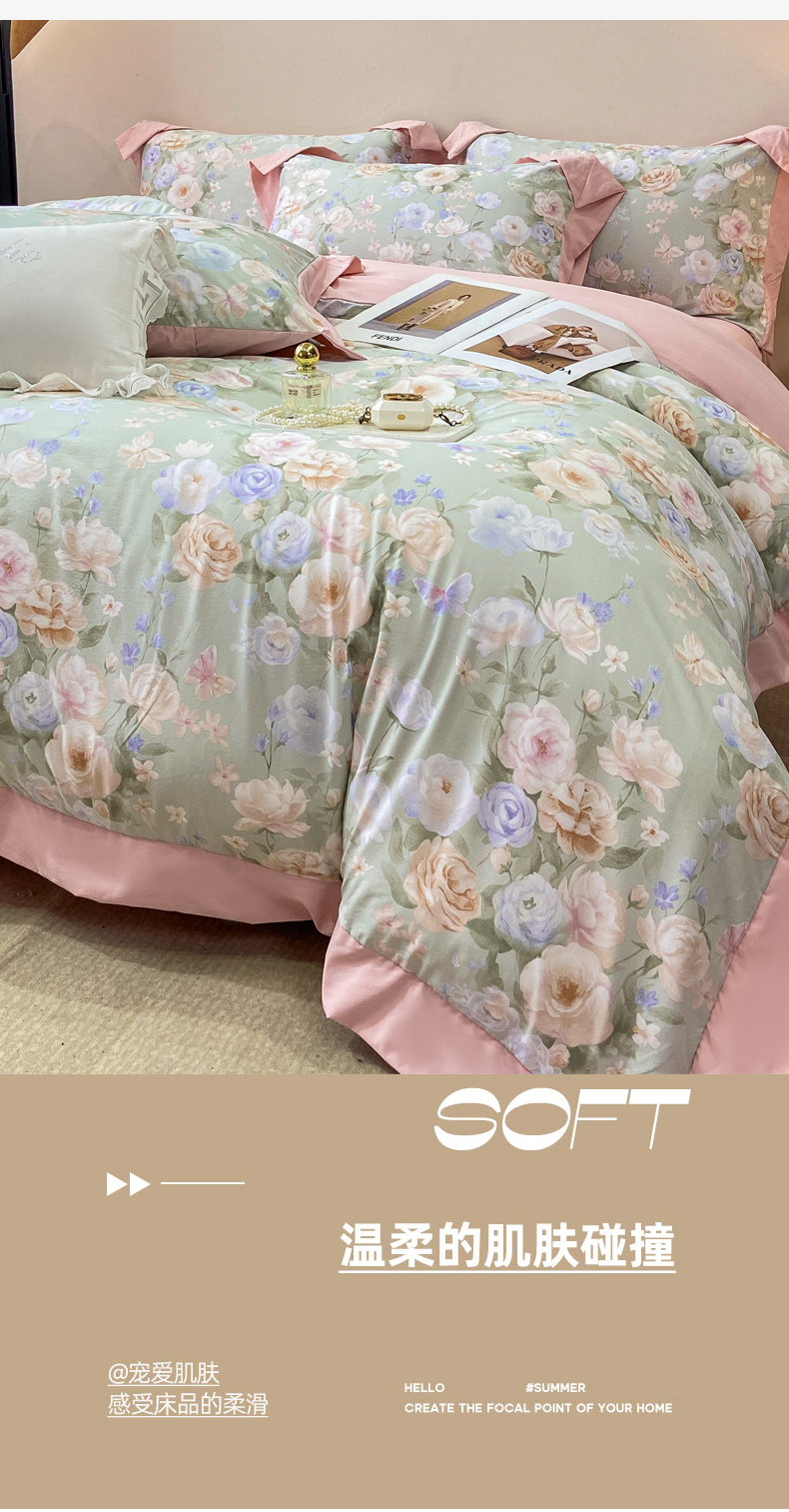 当前位置: 91家纺网 > 商品网购 > 床品套件 > 四件套 > 其它四件套 > 慕木家纺 2026新款A类印花拼角工艺慕斯棉四件套系列(抽空压缩可供跨境)提供买家秀 青妍+粉