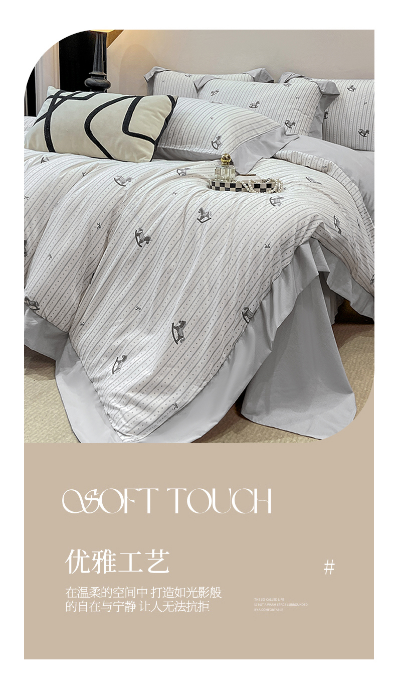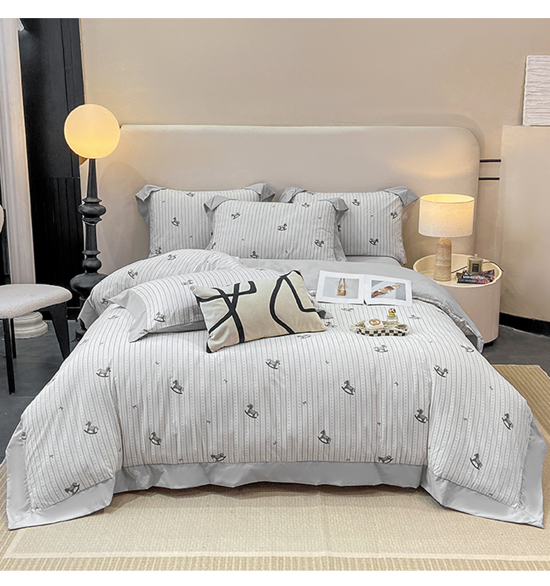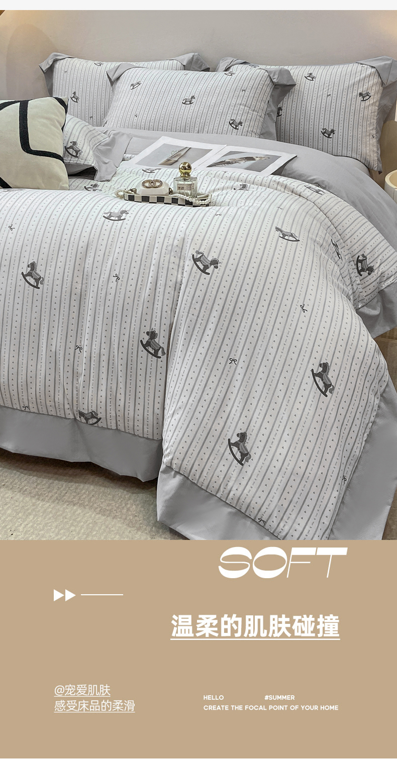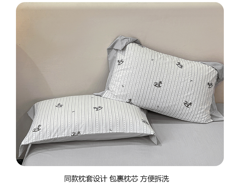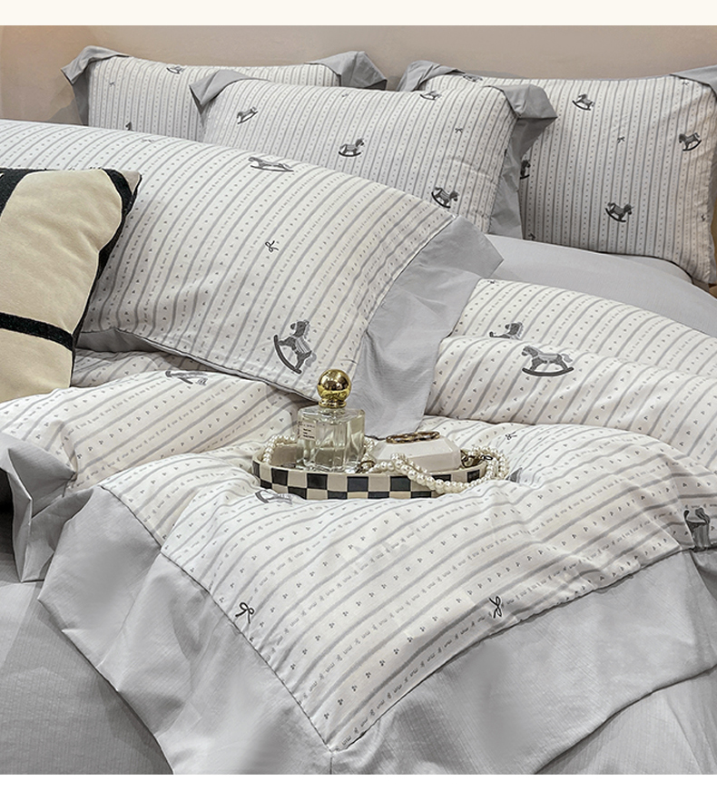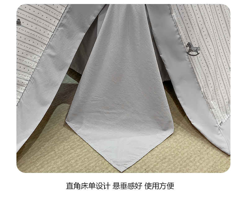 当前位置: 91家纺网 > 商品网购 > 床品套件 > 四件套 > 其它四件套 > 慕木家纺 2026新款A类印花拼角工艺慕斯棉四件套系列(抽空压缩可供跨境)提供买家秀 木马童谣+灰