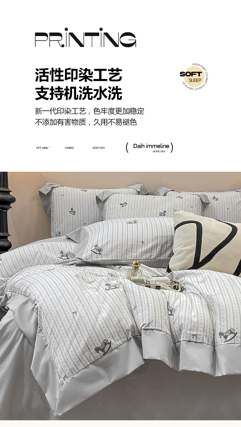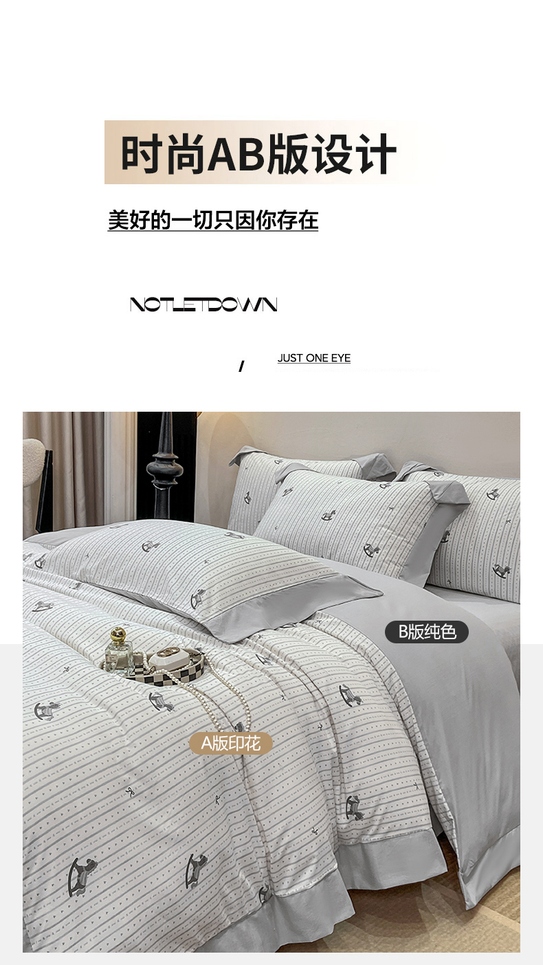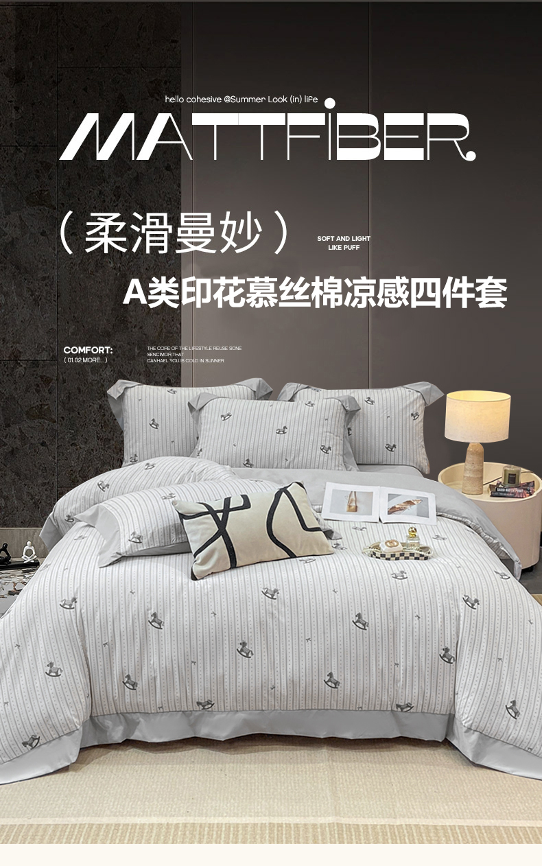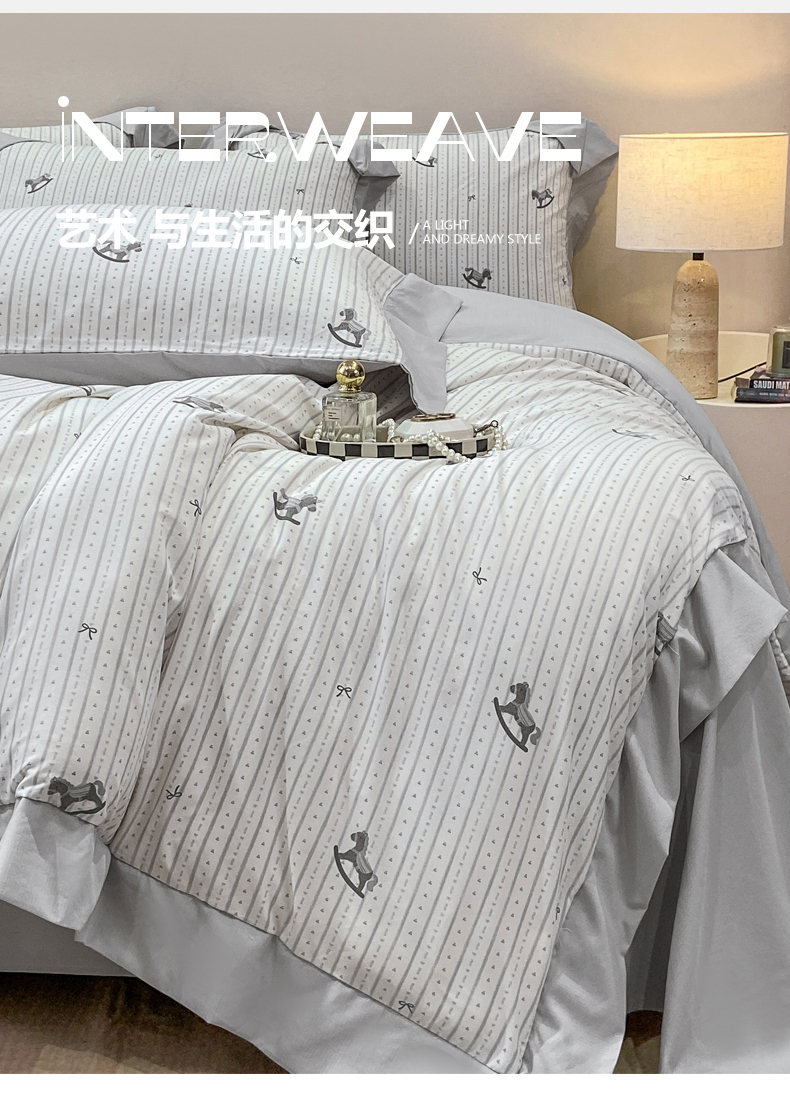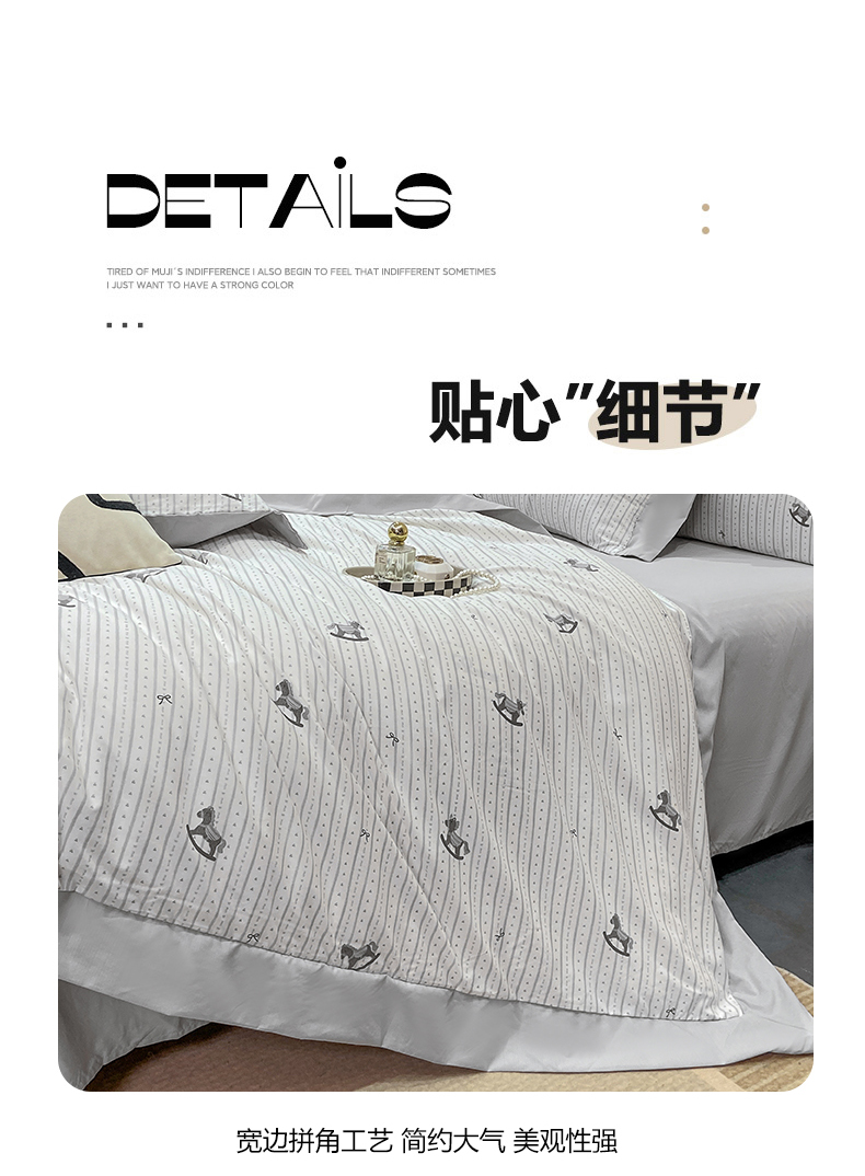 当前位置: 91家纺网 > 商品网购 > 床品套件 > 四件套 > 其它四件套 > 慕木家纺 2026新款A类印花拼角工艺慕斯棉四件套系列(抽空压缩可供跨境)提供买家秀 木马童谣+灰