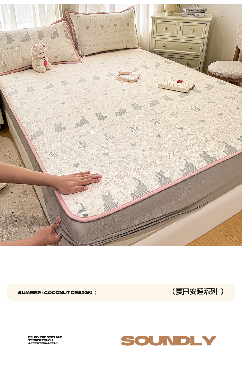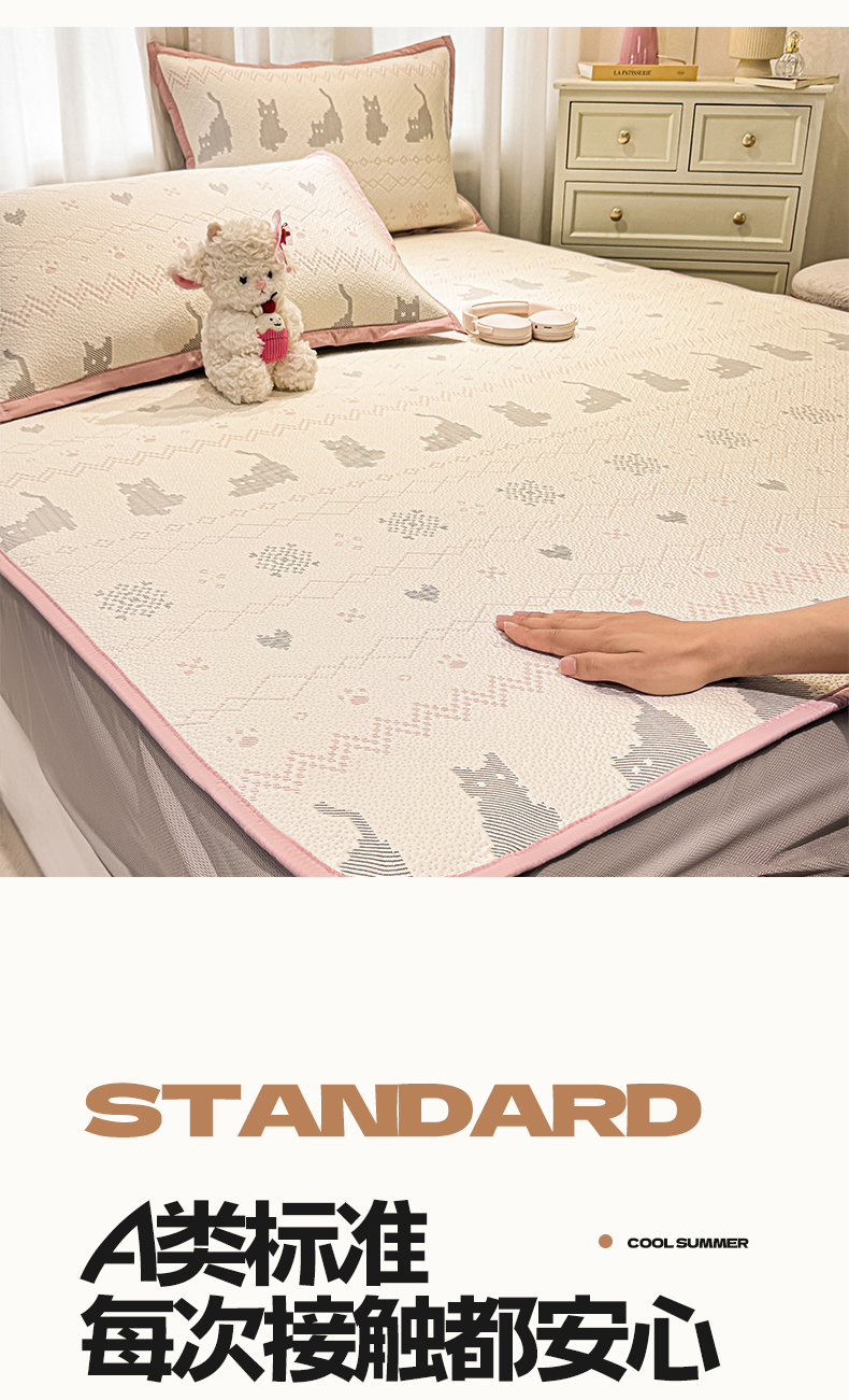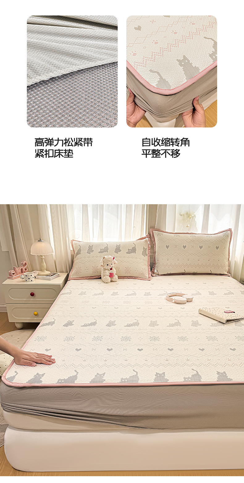 帅露家纺 2026新款A类PE中分子提花软凉席席子 床笠款-猫咪派对粉