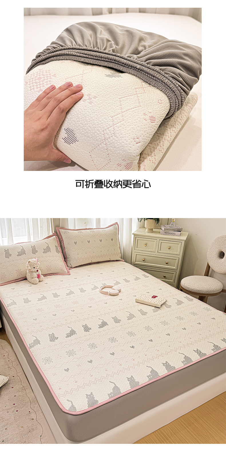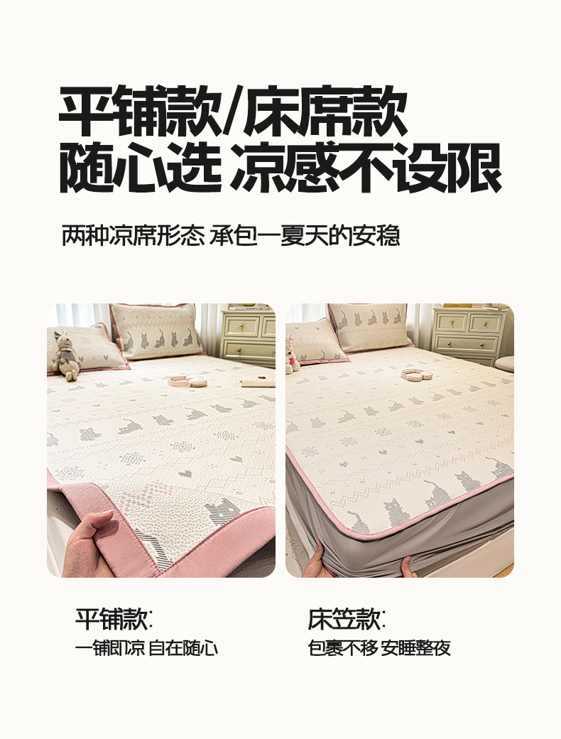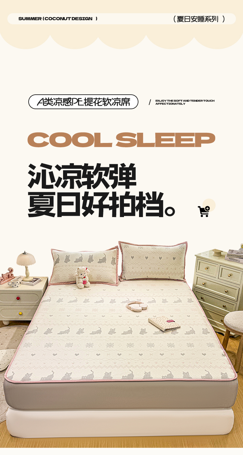 帅露家纺 2026新款A类PE中分子提花软凉席席子 床笠款-猫咪派对粉