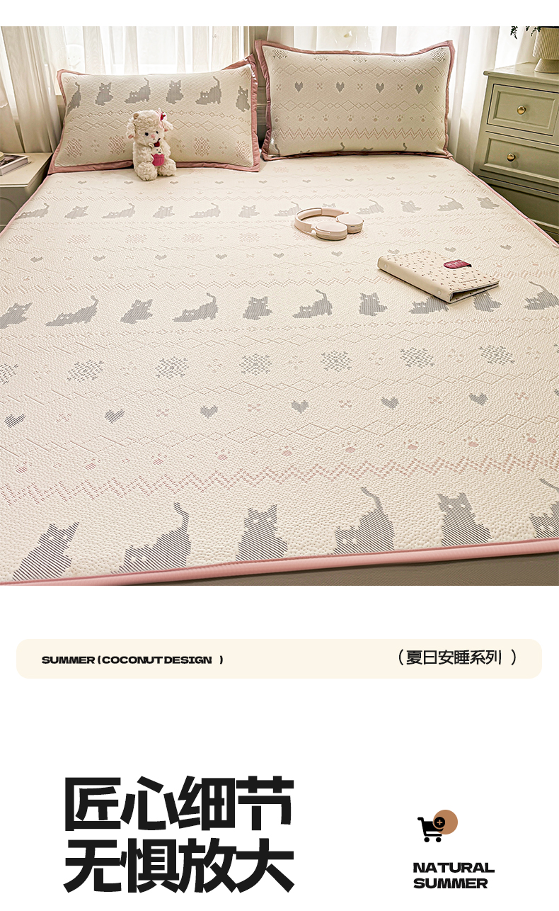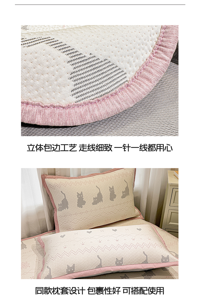 商品名称:帅露家纺 2026新款A类PE中分子提花软凉席席子 床笠款-猫咪派对粉