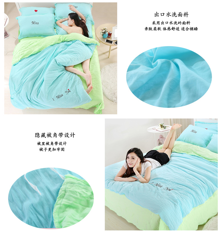 睡美美家纺 2025新款水洗棉四件套床单款 水蓝+果绿