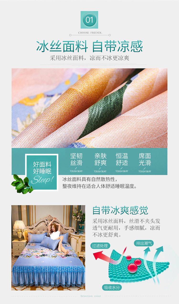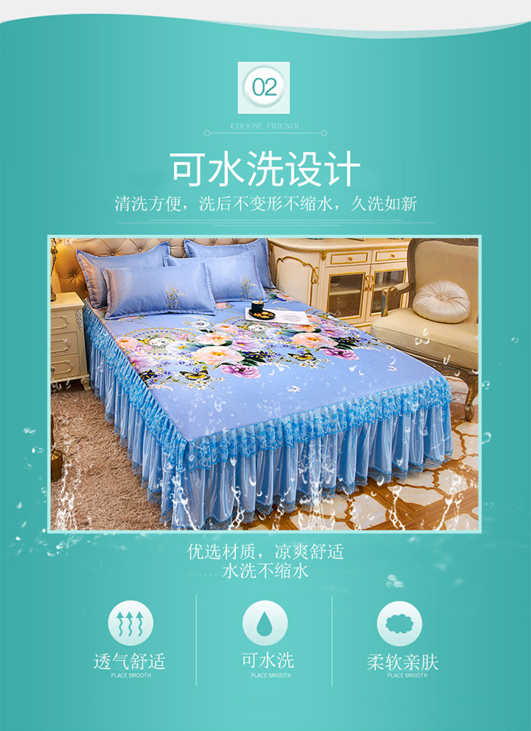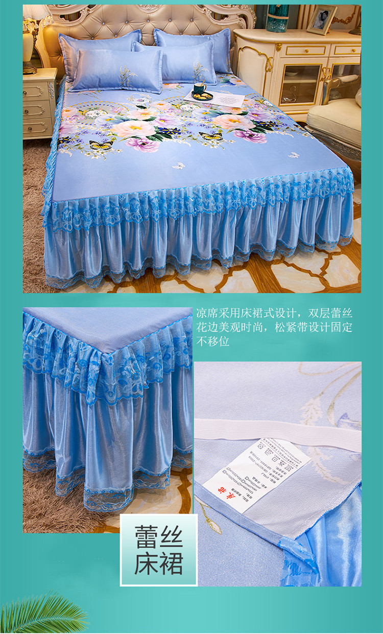 商品名称:恋佳居 2021新款印花床裙可水洗冰丝席三件套 花满园 蓝