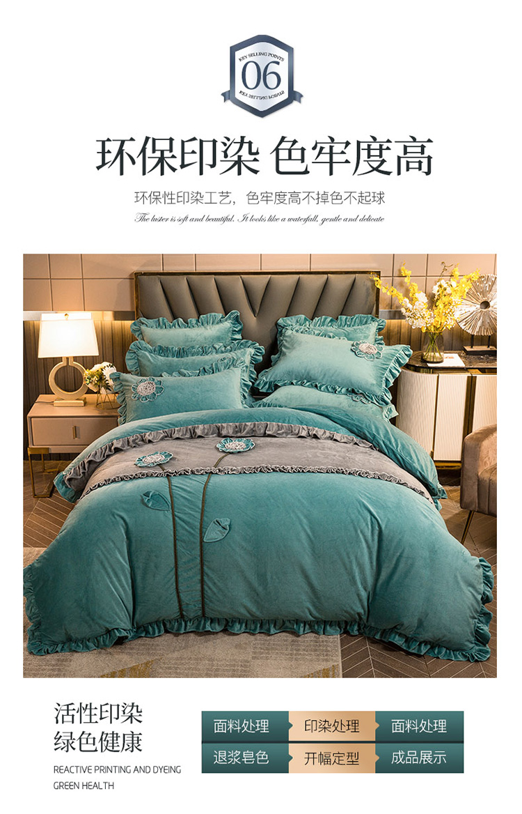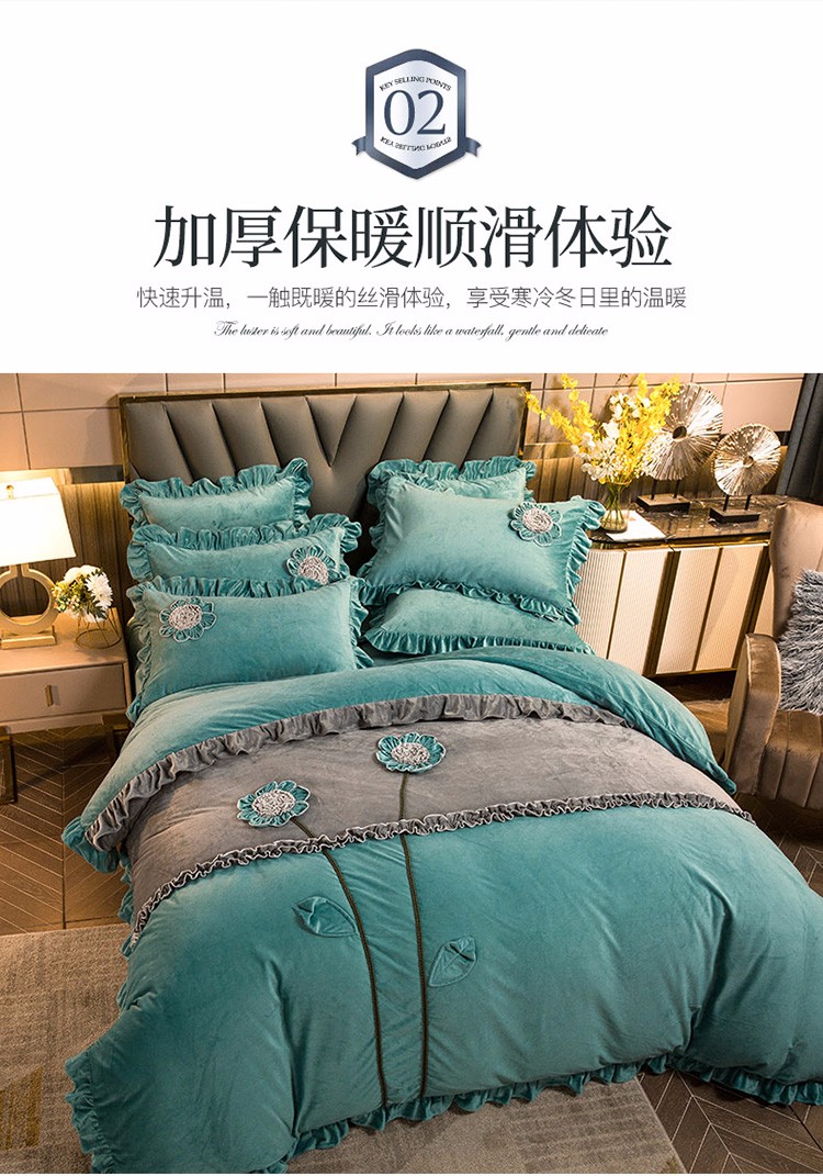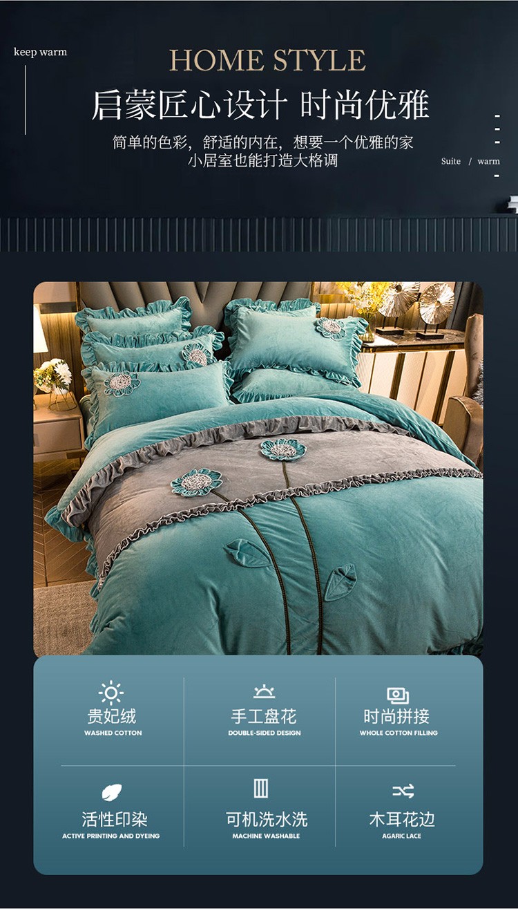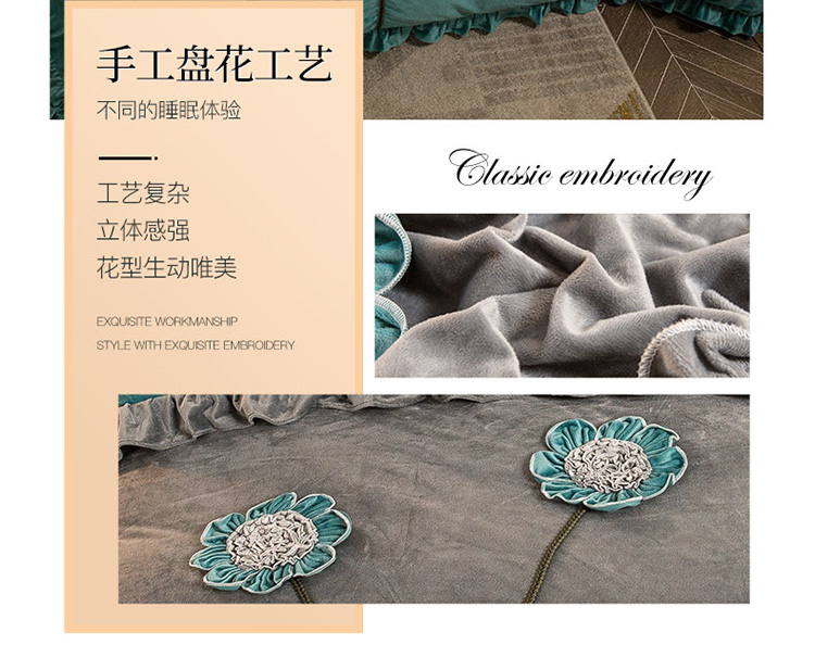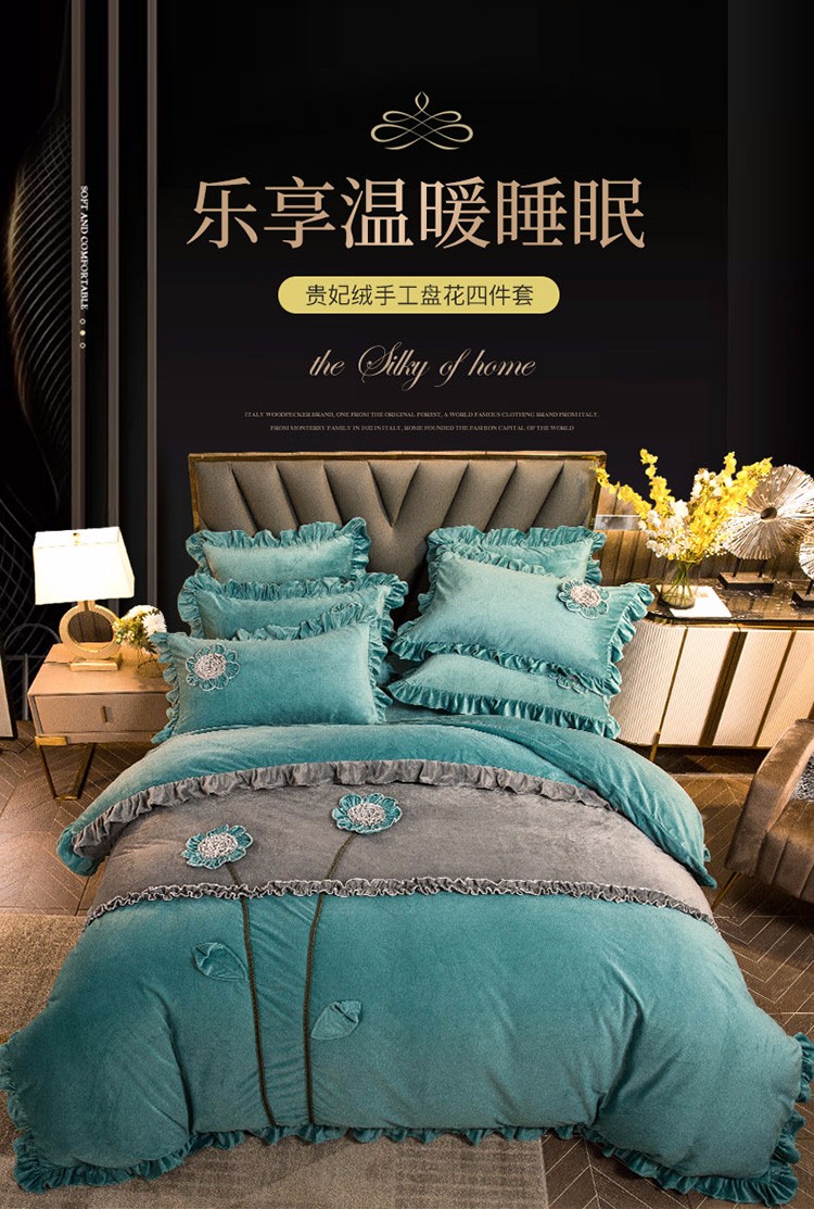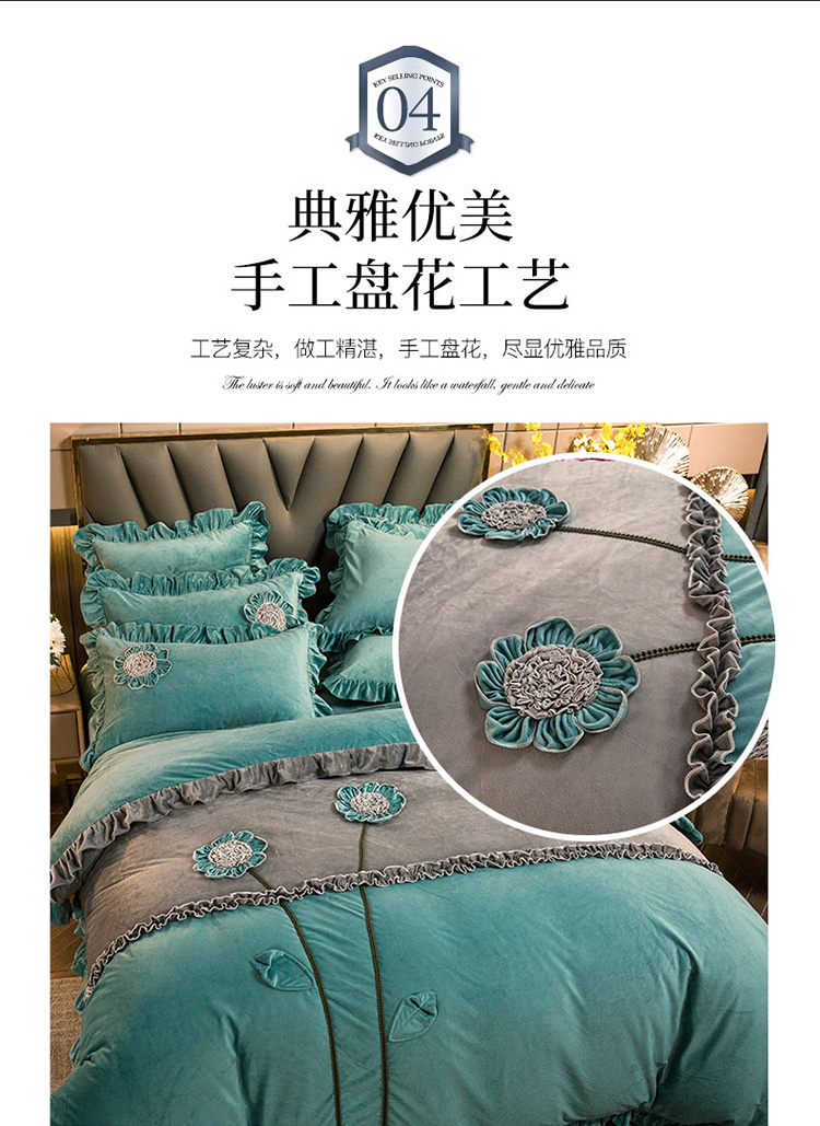 兴美佳 新款贵妃绒手工盘花四件套 花颜-宝绿色