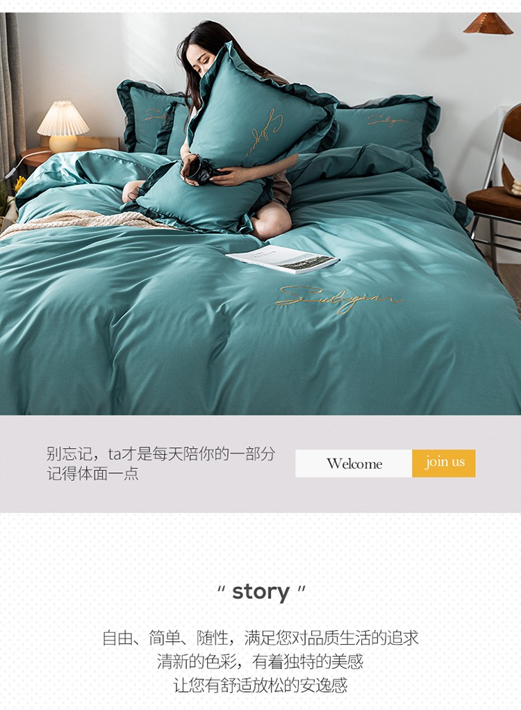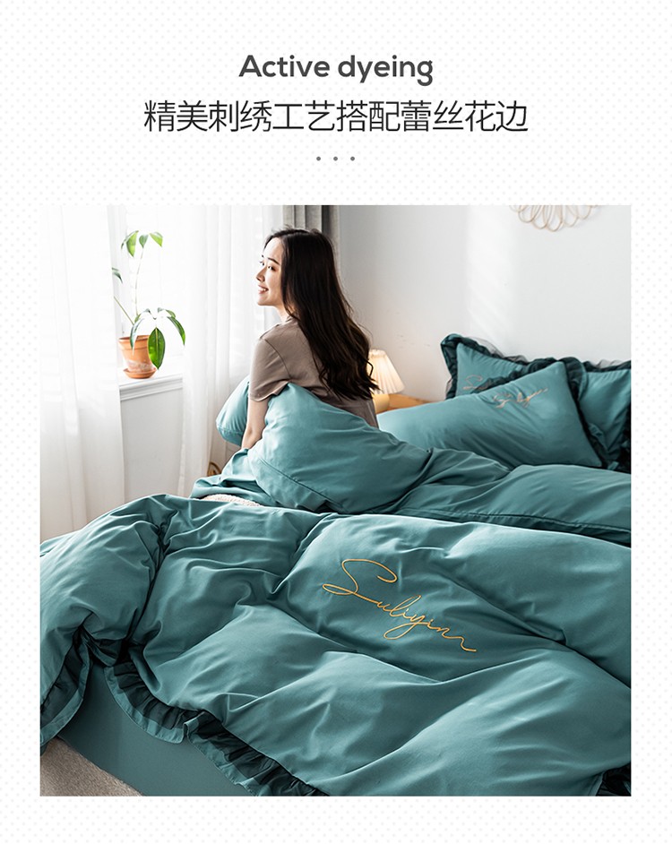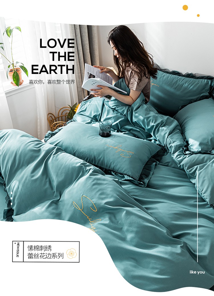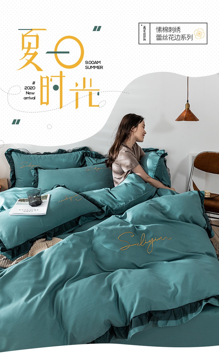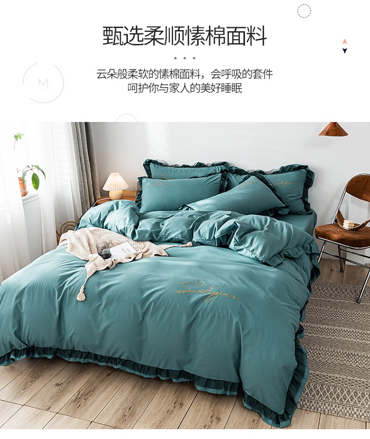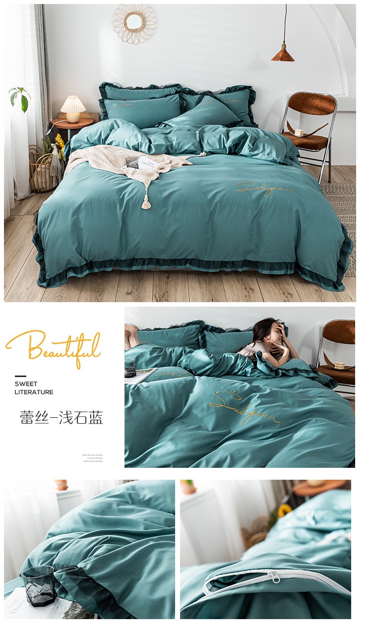 金麦家纺 2020新款愫棉刺绣蕾丝花边四件套 浅石蓝